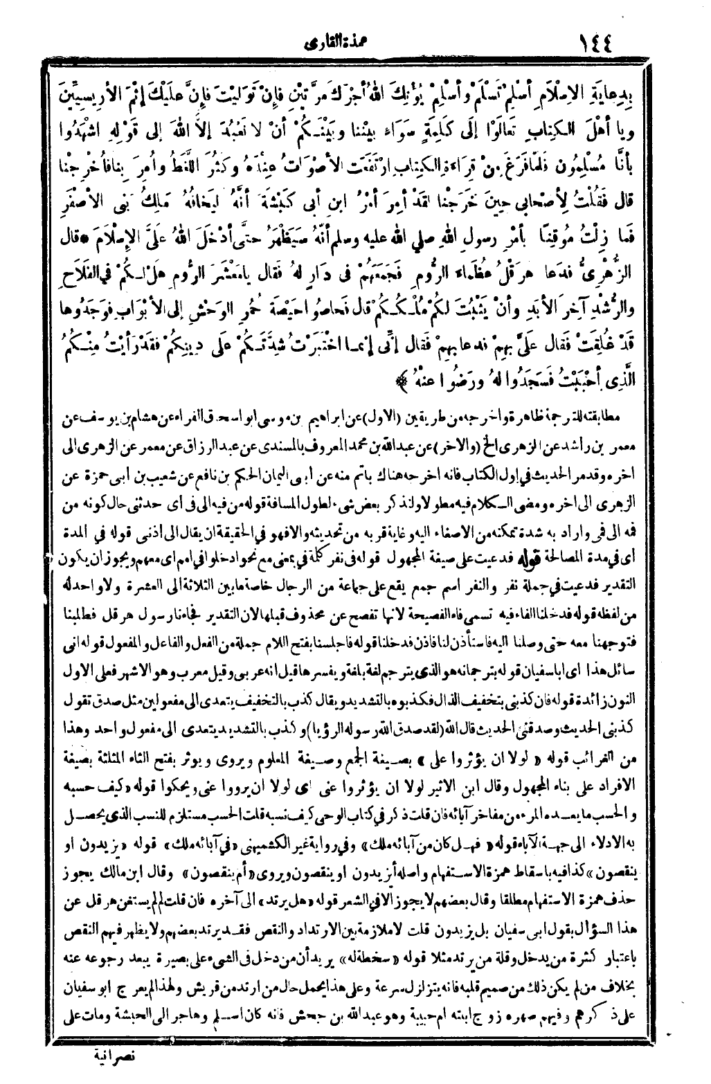 بِدِعَايَةِ الإسْلامِ أسْلِمْ تَسْلَمْ وَأسْلِمْ يُؤْتِكَ الله أجْرَكَ مَرَّتَيْنِ فَإنْ تَوَلَيْتَ فَإنَّ عَلَيْكَ إثْمَ الأرِيسيِّينَ وَيَا أهْلَ الكِتَابِ تَعَالوا إلَى كَلِمَةٍ سَوَاءِ بَيْنَنَا وَبَيْنَكُمْ أنْ لَا نَعْبُدَ إلاَّ الله إلَى قَوْلِهِ اشْهَدُوا بأنَّا مُسْلِمُونَ فَلَمَا فَرَغَ مِنْ قِرَاءَةِ الكِتَابِ ارْتَفَعَتِ الأصْوَاتُ عِنْدَهُ وَكَثُرَ اللَّفْظُ وَأُمِرَ بِنا فَأُخْرِجْنَا قَال فَقُلْتُ لأصْحَابِي حِينَ خَرَجْنَا لَقَدْ أُمِرَ أمْرُ ابنُ أبِي كَبْشَةَ أنَّهُ لَيخافُهُ مَلِكُ بَنِي الأصْفَرِ فَمَا زِلْتُ مُوقِنا بأمْرِ رَسُولِ الله صلى الله عَلَيْهِ وَسلم سَيَظْهَرُ حَتَّى أدْخَلَ الله عَلَيَّ الإسْلامَ. قَالَ الزُّهْرِيُّ فَدَعَا هرَقْلُ عُظَمَاءَ الرُّومِ فَجَمَعَهُمْ فِي دَارٍ لهُ فَقَالَ يَا مَعْشَرَ الرُّومِ هَلْ لَكُمْ فِي الفَلاحِ وَالرُّشْدِ آخِرَ الأبَدِ وأنْ يَثبُتَ لَكُمْ مُلْكُكُمْ قَالَ فَحَاصُوا حَيْصَةَ حُمُرِ الوَحْشِ إلَى الأبوَابِ فَوَجَدُوها قَدْ غُلِقَتْ فَقَال عَلَيَّ بِهِمْ فَدَعَا بِهِمْ فَقال إنِّي إِنَّمَا اخْتَبَرْتُ شِدَّتَكُمْ عَلَى دِينِكُمْ فَقَدْ رَأيْتُ مِنْكُمْ الَّذِي أحْبَبْتُ فَسَجَدُوا لهُ وَرَضُوا عَنْهُ.