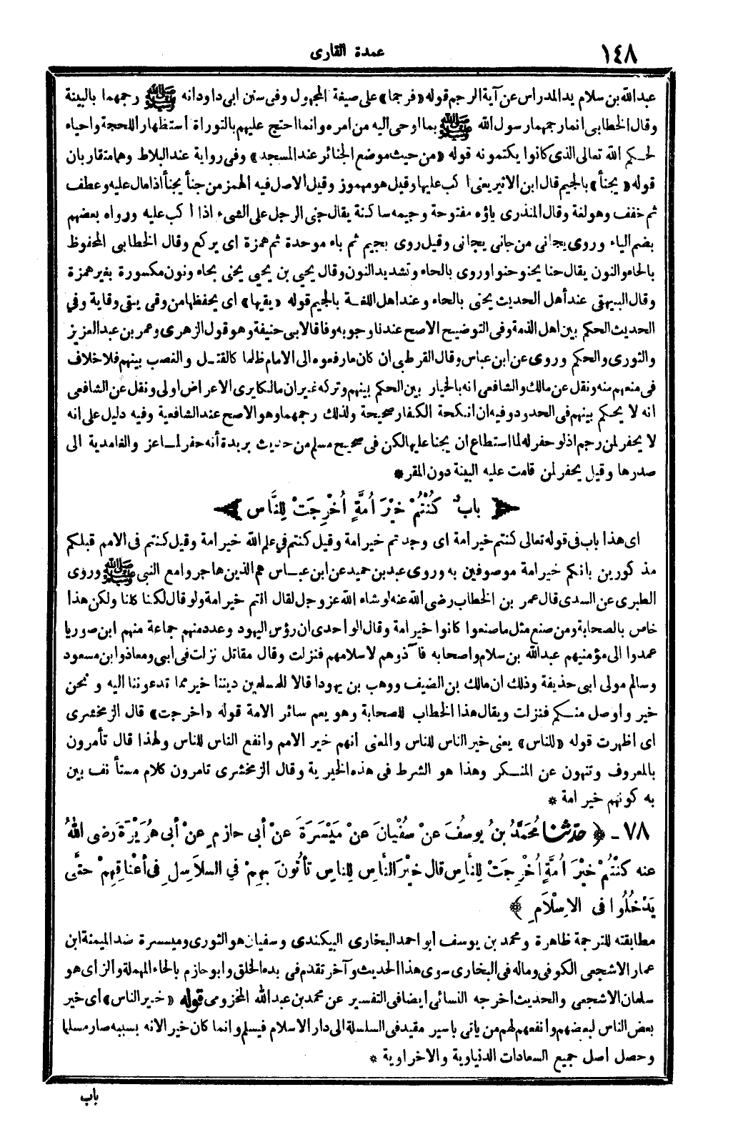 أَي: هَذَا بَاب فِي قَوْله تَعَالَى: (كُنْتُم خير أمة) أَي: وجدْتُم خير أمة وَقيل: كُنْتُم فِي علم الله خير أمة. وَقيل: كُنْتُم فِي الْأُمَم قبلكُمْ مذكورين بأنكم خير أمة موصوفين بِهِ وروى عبد بن حميد عَن ابْن عَبَّاس: هم الَّذين هَاجرُوا مَعَ النَّبِي صلى الله عَلَيْهِ وَسلم. وروى الطَّبَرِيّ عَن السّديّ، قَالَ عمر بن الْخطاب رَضِي الله عَنهُ: لَو شَاءَ الله عز وَجل لقَالَ: أَنْتُم خير أمة، وَلَو قَالَ لَكنا كلنا وَلَكِن هَذَا خَاص بالصحابة وَمن صنع مثل مَا صَنَعُوا كَانُوا خير أمة وَقَالَ الواحدي: إِن رُؤُوس الْيَهُود، وَعدد مِنْهُم جمَاعَة مِنْهُم ابْن صوريا، عَمدُوا إِلَى مؤمنيهم، عبد الله بن سَلام وَأَصْحَابه، فآذوهم لإسلامهم، فَنزلت وَقَالَ مقَاتل: نزلت فِي أبي ومعاذ وَابْن مَسْعُود وَسَالم مولى أبي حُذَيْفَة وَذَلِكَ أَن مَالك بن الضَّيْف ووهب بن يهودا قَالَا للْمُسلمين ديننَا خير مِمَّا تدعوننا إِلَيْهِ وَنحن خير، وأوصل مِنْكُم فَنزلت. وَيُقَال: هَذَا الْخطاب للصحابة وَهُوَ يعم سَائِر الْأمة قَوْله: (أخرجت) قَالَ الزَّمَخْشَرِيّ أَي: أظهرت. قَوْله: (للنَّاس) يَعْنِي: خير النَّاس للنَّاس، وَالْمعْنَى أَنهم خير الْأُمَم وأنفع النَّاس للنَّاس، وَلِهَذَا قَالَ: (تأمرون بِالْمَعْرُوفِ وتنهون عَن الْمُنكر) وَهَذَا هُوَ الشَّرْط فِي هَذِه الْخَيْرِيَّة وَقَالَ الزَّمَخْشَرِيّ: تأمرون، كَلَام مُسْتَأْنف بيَّن بِهِ كَونهم خير أمة.