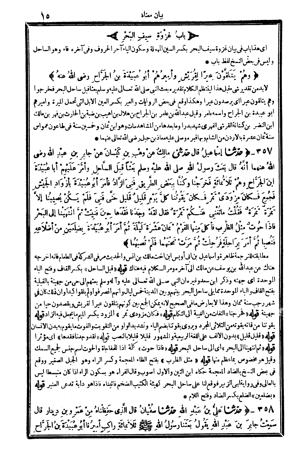 4360 - ح دّثنا إسْماعيلُ قَالَ حدّثني مالِكٌ عنْ وهْبِ بنِ كَيْسانَ عنْ جابِرِ بنِ عبْدِ الله رَضِي الله عَنْهُمَا أنَّهُ قَالَ بَعَثَ رَسولُ الله صلى الله عَلَيْهِ وَسلم بَعْثاً قِبَل السَّاحِلِ وأمَّرَ عَلَيْهِمْ أَبَا عُبَيْدَةَ بنَ الجَرَّاحِ وهُمْ ثَلاثُمائَةٍ فَخرَجْنا وكُنَّا بِبَعْضِ الطَّرِيقِ فَنِيَ الزَّادُ فأمَرَ أبُو عُبَيْدَةَ بأزْوَادِ الجَيْشِ فَجُمِعَ فَكانَ مِزْوَدَيْ تَمْرٍ فَكانَ يَقُوتُنا كلَّ يَوْمٍ قَلِيلٌ قَليل حَتَّى فَنِيَ فَلَمْ يَكُنْ يُصِيبُنا إلاَّ تَمْرَةٌ تَمْرَةٌ فَقُلْتُ مَا تُغْنِي عَنْكُمْ تَمْرَةٌ فَقَالَ لقَدْ وَجَدْنا فَقْدَها حِينَ فَنِيَتْ ثمَّ انْتَهَيْنَا إِلَى البَحْرِ فإذَا حُوتٌ مِثْلُ الظَّرِب فأكلَ مِنْها القَوْمُ ثَمَانَ عَشْرَةَ لَيْلَةً ثُمَّ أمَرَ أبُو عُبَيْدَةِ بِضِلَعَيْنِ مِنْ أضْلاَعِهِ فَنُصِبَا ثُمَّ أمَرَ بِرَاحِلَةٍ فَرُحِلَتْ ثُمَّ مَرَّتْ تَحْتَهُما فَلَمْ تُصبْهُما. .
