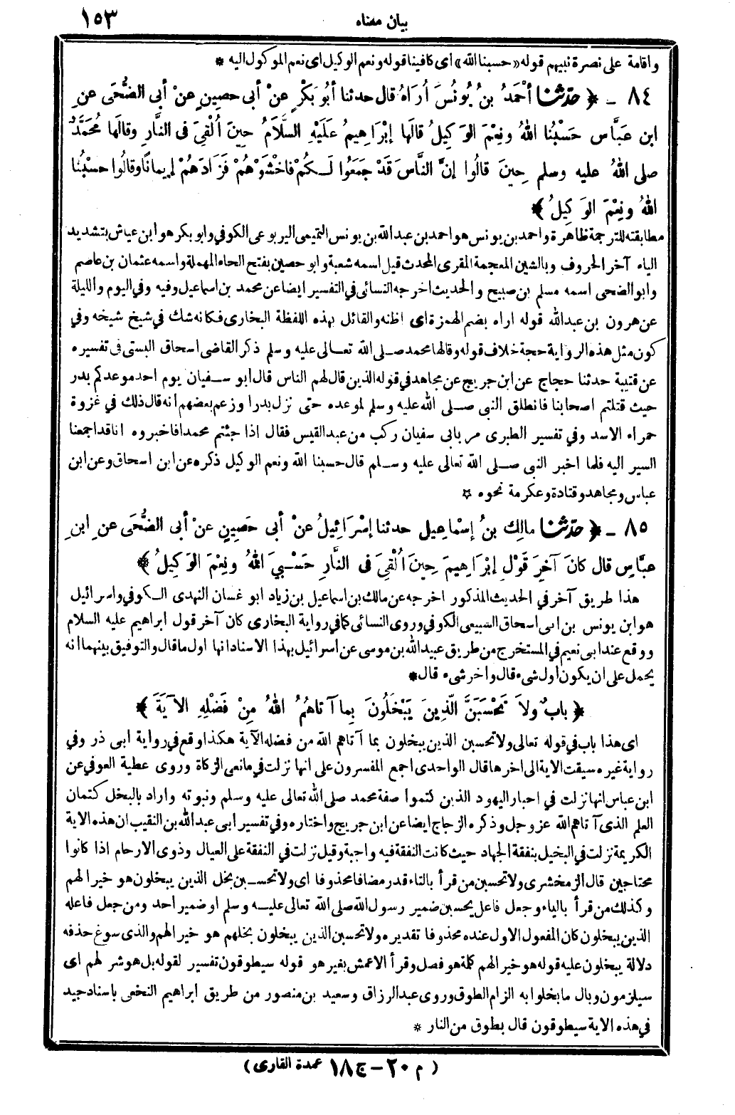أَي: هَذَا بَاب فِي قَوْله تَعَالَى: {وَلَا تحسبن الَّذين يَبْخلُونَ بِمَا آتَاهُم الله من فَضله} الْآيَة هَكَذَا وَقع فِي رِوَايَة أبي ذَر، وَفِي رِوَايَة غَيره سيقت الْآيَة إِلَى آخرهَا قَالَ الواحدي: أجمع الْمُفَسِّرُونَ على أَنَّهَا نزلت فِي مانعي الزَّكَاة، وروى عَطِيَّة الْعَوْفِيّ عَن ابْن عَبَّاس أَنَّهَا نزلت فِي أَحْبَار الْيَهُود الَّذين كتموا صفة مُحَمَّد صلى الله عَلَيْهِ وَسلم، ونبوته وَأَرَادَ بالبخل كتمان الْعلم الَّذِي آتَاهُم الله عز وَجل، وَذكره الزّجاج أَيْضا عَن ابْن جريج وَاخْتَارَهُ، وَفِي (تَفْسِير أبي عبد الله بن النَّقِيب) أَن هَذِه الْآيَة الْكَرِيمَة نزلت فِي الْبَخِيل بِنَفَقَة الْجِهَاد حَيْثُ كَانَت النَّفَقَة فِيهِ وَاجِبَة. وَقيل: نزلت فِي النَّفَقَة على الْعِيَال وَذَوي الْأَرْحَام إِذا كَانُوا مُحْتَاجين. قَالَ الزَّمَخْشَرِيّ، وَلَا تحسبن من قَرَأَ بِالتَّاءِ قدر مُضَافا محذوفا أَي: وَلَا تحسبن بخل الَّذين يَبْخلُونَ هُوَ خيرا لَهُم، وَكَذَلِكَ من قَرَأَ بِالْيَاءِ وَجعل فَاعل: يَحسبن، ضمير رَسُول الله صلى الله عَلَيْهِ وَسلم، أَو ضمير أحد، وَمن جعل فَاعله الَّذين يَبْخلُونَ كَانَ الْمَفْعُول الأول عِنْده محذوفا، تَقْدِيره، وَلَا تحسبن الَّذين يَبْخلُونَ بخلهم هُوَ خيرا لَهُم، وَالَّذِي سوغ حذفه دلَالَة، يَبْخلُونَ، عَلَيْهِ قَوْله: (هُوَ خيرا لَهُم) كلمة هُوَ فصل وَقَرَأَ الْأَعْمَش بِغَيْر هُوَ. قَوْله: (سيطوقون) تَفْسِير لقَوْله: (بل هُوَ شَرّ لَهُم) أَي: سيلزمون وبال مَا يَخْلُو بِهِ إِلْزَام الطوق، وروى عبد الرَّزَّاق وَسَعِيد بن مَنْصُور من طَرِيق إِبْرَاهِيم النَّخعِيّ بِإِسْنَاد جيد فِي هَذِه الْآيَة سيطوقون، قَالَ: بطوق من النَّار.