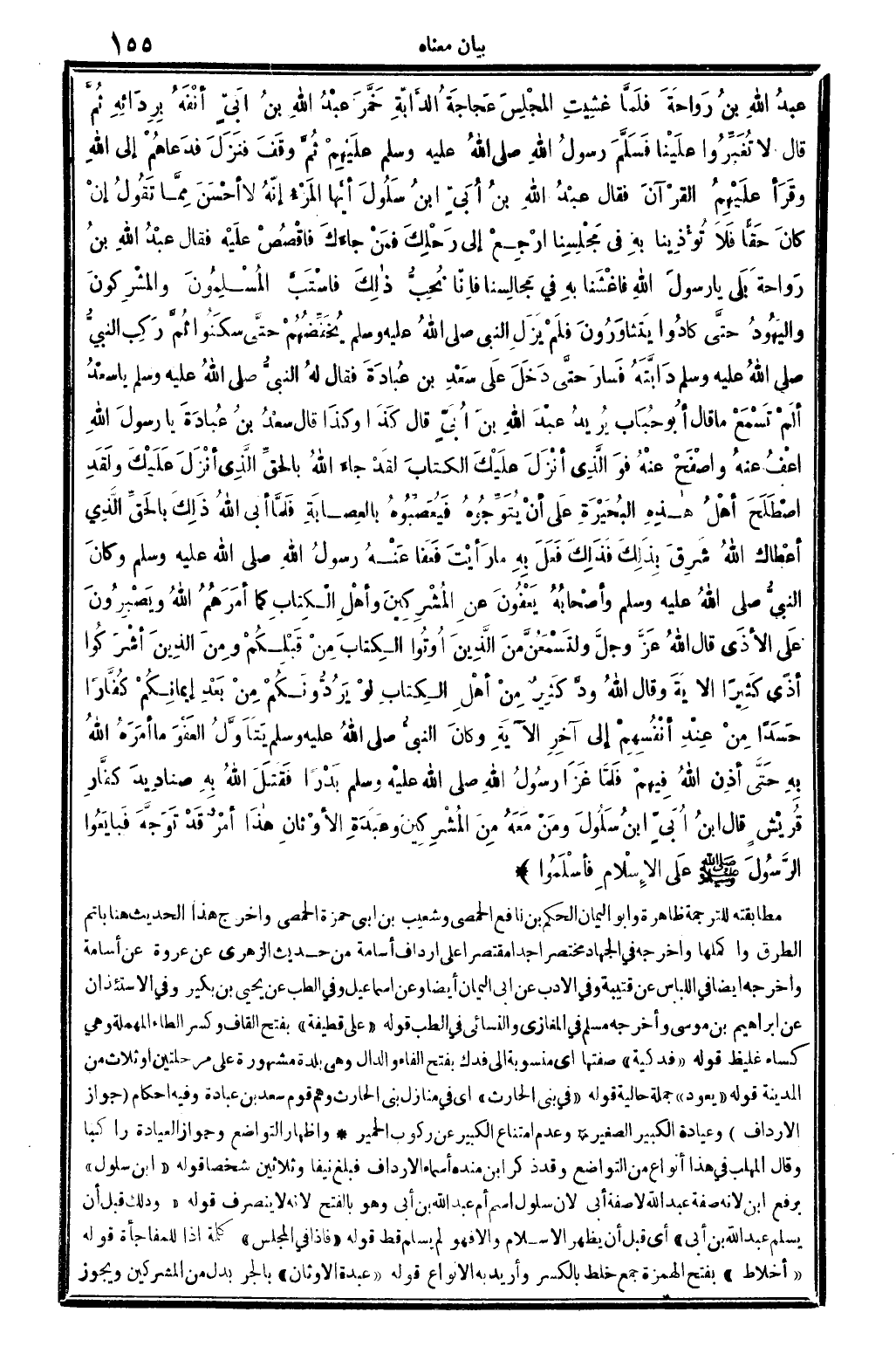 عبد الله بن رَوَاحَة فَلَمَّا غشيت الْمجْلس عجاجة الدَّابَّة خمر عبد الله بن أبي أَنفه بردائه ثمَّ قَالَ لَا تغبروا علينا فَسلم رَسُول الله - صَلَّى اللَّهُ عَلَيْهِ وَسَلَّم َ - عَلَيْهِم ثمَّ وقف فَنزل فَدَعَاهُمْ إِلَى الله وَقَرَأَ عَلَيْهِم الْقُرْآن فَقَالَ عبد الله بن أبي ابْن سلول أَيهَا الْمَرْء إِنَّه لَا أحسن مِمَّا تَقول إِن كَانَ حَقًا فَلَا تؤذينا بِهِ فِي مَجْلِسنَا ارْجع إِلَى رحلك فَمن جَاءَك فاقصص عَلَيْهِ فَقَالَ عبد الله بن رَوَاحَة بلَى يَا رَسُول الله فاغشنا بِهِ فِي مجالسنا فَإنَّا نحب ذَلِك فاستب الْمُسلمُونَ وَالْمُشْرِكُونَ وَالْيَهُود حَتَّى كَادُوا يتثاورون فَلم يزل النَّبِي - صَلَّى اللَّهُ عَلَيْهِ وَسَلَّم َ - يخفضهم حَتَّى سكنوا ثمَّ ركب النَّبِي - صَلَّى اللَّهُ عَلَيْهِ وَسَلَّم َ - دَابَّته فَسَار حَتَّى دخل على سعد بن عبَادَة فَقَالَ لَهُ النَّبِي - صَلَّى اللَّهُ عَلَيْهِ وَسَلَّم َ - يَا سعد ألم تسمع مَا قَالَ أَبُو حباب يُرِيد عبد الله بن أبي قَالَ كَذَا وَكَذَا قَالَ سعد بن عبَادَة يَا رَسُول الله اعْفُ عَنهُ وَاصْفَحْ عَنهُ فو الَّذِي أنزل عَلَيْك الْكتاب لقد جَاءَ الله بِالْحَقِّ الَّذِي أنزل عَلَيْك وَلَقَد اصْطلحَ أهل هَذِه الْبحيرَة على أَن يُتَوِّجُوهُ فيعصبوه بِالْعِصَابَةِ فَلَمَّا أَبى الله ذَلِك بِالْحَقِّ الَّذِي أَعْطَاك الله شَرق بذلك فَذَلِك فعل بِهِ مَا رَأَيْت فَعَفَا عَنهُ رَسُول الله - صَلَّى اللَّهُ عَلَيْهِ وَسَلَّم َ - وَكَانَ النَّبِي - صَلَّى اللَّهُ عَلَيْهِ وَسَلَّم َ - وَأَصْحَابه يعفون عَن الْمُشْركين وَأهل الْكتاب كَمَا أَمرهم الله ويصبرون على الْأَذَى قَالَ الله عز وَجل {ولتسمعن من الَّذين أُوتُوا الْكتاب من قبلكُمْ وَمن الَّذين أشركوا أَذَى كثيرا} الْآيَة وَقَالَ الله {ود كثير من أهل الْكتاب لَو يردونكم من بعد إيمَانكُمْ كفَّارًا حسدا من عِنْد أنفسهم} إِلَى آخر الْآيَة وَكَانَ النَّبِي - صَلَّى اللَّهُ عَلَيْهِ وَسَلَّم َ - يتَأَوَّل الْعَفو مَا أمره الله بِهِ حَتَّى أذن الله فيهم فَلَمَّا غزا رَسُول الله - صَلَّى اللَّهُ عَلَيْهِ وَسَلَّم َ - بَدْرًا فَقتل الله بِهِ صَنَادِيد كفار قُرَيْش قَالَ ابْن أبي ابْن سلول وَمن مَعَه من الْمُشْركين وَعَبدَة الْأَوْثَان هَذَا أَمر قد توجه فَبَايعُوا الرَّسُول - صَلَّى اللَّهُ عَلَيْهِ وَسَلَّم َ - على الْإِسْلَام فأسلموا) مطابقته للتَّرْجَمَة ظَاهِرَة وَأَبُو الْيَمَان الحكم بن نَافِع الْحِمصِي وَشُعَيْب بن أبي حَمْزَة الْحِمصِي وَأخرج هَذَا الحَدِيث هُنَا بأتم الطّرق وأكملها وَأخرجه فِي الْجِهَاد مُخْتَصرا جدا مُقْتَصرا على أرداف أُسَامَة من حَدِيث الزُّهْرِيّ عَن عُرْوَة عَن أُسَامَة وَأخرجه أَيْضا فِي اللبَاس عَن قُتَيْبَة وَفِي الْأَدَب عَن أبي الْيَمَان أَيْضا وَعَن إِسْمَاعِيل وَفِي الطِّبّ عَن يحيى بن بكير وَفِي الاسْتِئْذَان عَن إِبْرَاهِيم بن مُوسَى وَأخرجه مُسلم فِي الْمَغَازِي وَالنَّسَائِيّ فِي الطِّبّ قَوْله " على قطيفة " بِفَتْح الْقَاف وَكسر الطَّاء الْمُهْملَة وَهِي كسَاء غليظ قَوْله " فَدَكِيَّة " صفتهَا أَي منسوبة إِلَى فدك بِفَتْح الْفَاء وَالدَّال وَهِي بَلْدَة مَشْهُورَة على مرحلَتَيْنِ أَو ثَلَاث من الْمَدِينَة قَوْله " يعود " جملَة حَالية قَوْله " فِي بني الْحَارِث " أَي فِي منَازِل بني الْحَارِث وهم قوم سعد بن عبَادَة وَفِيه أَحْكَام (جَوَاز الأرداف) وعيادة الْكَبِير الصَّغِير وَعدم امْتنَاع الْكَبِير عَن ركُوب الْحمير وَإِظْهَار التَّوَاضُع وَجَوَاز العيادة رَاكِبًا وَقَالَ الْمُهلب فِي هَذَا أَنْوَاع من التَّوَاضُع وَقد ذكر ابْن مَنْدَه أَسمَاء الأرداف فَبلغ نيفا وَثَلَاثِينَ شخصا قَوْله " ابْن سلول " بِرَفْع ابْن لِأَنَّهُ صفة عبد الله لَا صفة أبي لِأَن سلول اسْم أم عبد الله بن أ