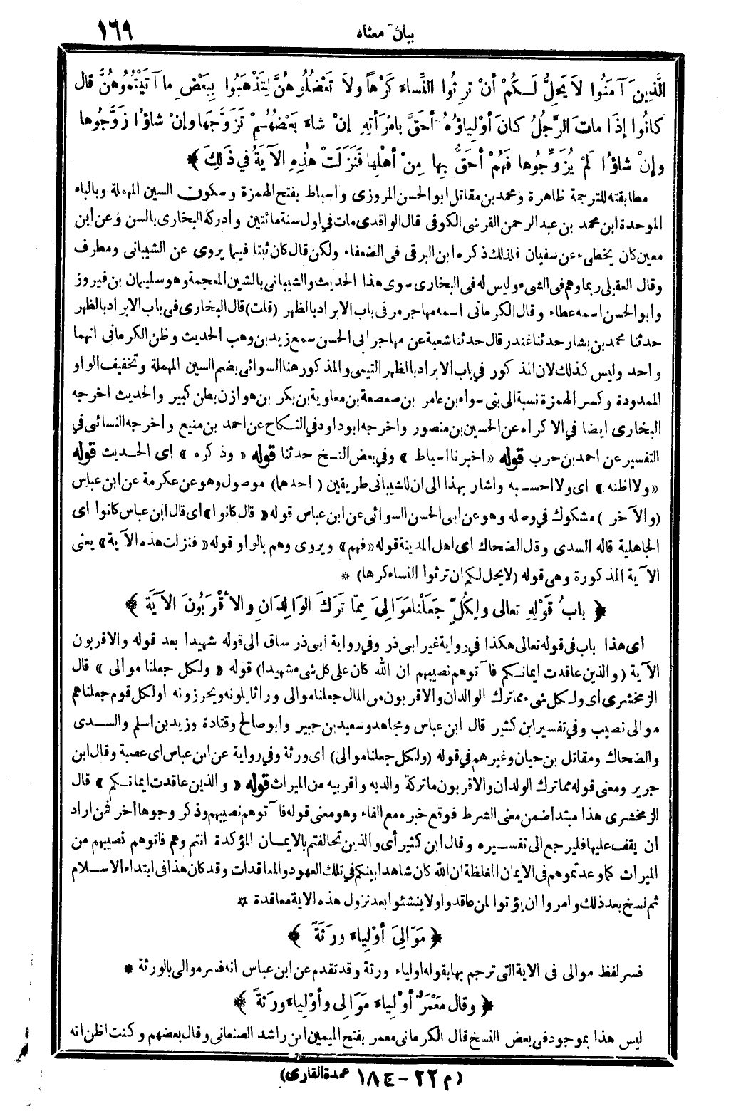 أَي: هَذَا بَاب فِي قَوْله تَعَالَى هَكَذَا فِي رِوَايَة غير أبي ذَر وَفِي رِوَايَة أبي ذَر سَاق إِلَى قَوْله: (شَهِيدا) بعد قَوْله: (وَالْأَقْرَبُونَ) الْآيَة. {وَالَّذين عاقدت أَيْمَانكُم فآتوهم نصِيبهم أَن الله كَانَ على كل شَيْء شَهِيدا} قَوْله: {وَلكُل جعلنَا موَالِي} قَالَ الزَّمَخْشَرِيّ: أَي: وَلكُل شَيْء مِمَّا ترك الْوَالِدَان وَالْأَقْرَبُونَ من المَال جعلنَا موَالِي وراثا يلونه ويحرزونه أَو لكل قوم جعلناهم موَالِي نصيب. وَفِي (تَفْسِير ابْن كثير) قَالَ ابْن عَبَّاس وَمُجاهد وَسَعِيد بن جُبَير وَأَبُو صَالح وَقَتَادَة وَزيد بن أسلم وَالسُّديّ وَالضَّحَّاك وَمُقَاتِل بن حَيَّان وَغَيرهم فِي قَوْله: {وَلكُل جعلنَا موَالِي} أَي: وَرَثَة. وَفِي رِوَايَة عَن ابْن عَبَّاس: أَي عصبَة، وَقَالَ ابْن جرير: وَمعنى قَوْله: {مِمَّا ترك الْولدَان وَالْأَقْرَبُونَ} مَا تَركه وَالِديهِ وأقربيه من الْمِيرَاث. قَوْله: (وَالَّذين عاقدت أَيْمَانكُم) ، قَالَ الزَّمَخْشَرِيّ: هَذَا مُبْتَدأ ضمن معنى الشَّرْط فَوَقع خَبره مَعَ الْفَاء، وَهُوَ معنى قَوْله: {فآتوهم نصِيبهم} وَذكر وُجُوهًا أخر فَمن أَرَادَ أَن يقف عَلَيْهَا فَليرْجع إِلَى تَفْسِيره، وَقَالَ ابْن كثير: أَي وَالَّذين تحالفتم بالأيمان الْمُؤَكّدَة أَنْتُم وهم فآتوهم نصِيبهم من الْمِيرَاث كَمَا وعدتموهم فِي الْأَيْمَان الْمُغَلَّظَة إِن الله كَانَ شَاهدا بَيْنكُم فِي تِلْكَ العهود والمعاقدات، وَقد كَانَ هَذَا فِي ابْتِدَاء الْإِسْلَام ثمَّ نسخ بعد ذَلِك، وَأمرُوا أَن يؤتوا لمن عاقدوا وَلَا ينشئوا بعد نزُول هَذِه الْآيَة معاقدة.