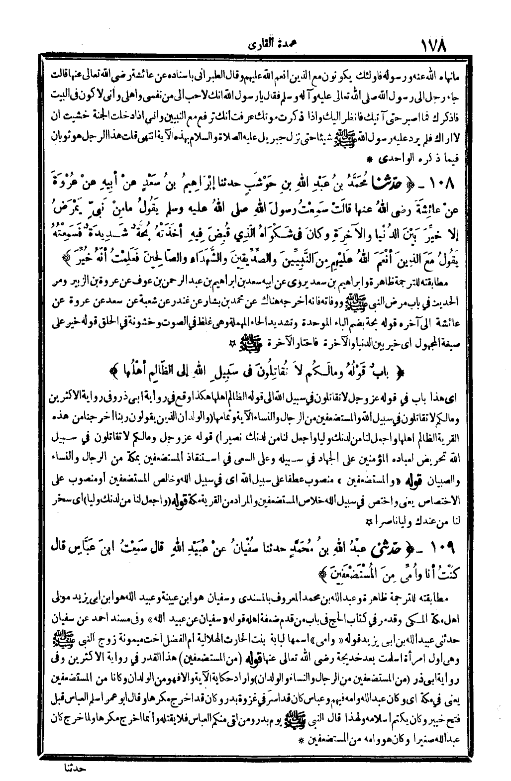 أَي: هَذَا بَاب فِي قَوْله عز وَجل: {لَا تقاتلون فِي سَبِيل الله} إِلَى قَوْله: {الظَّالِم أَهلهَا} هَكَذَا وَقع فِي رِوَايَة أبي ذَر، وَفِي رِوَايَة الْأَكْثَرين: {وَمَا لكم لَا تقاتلون فِي سَبِيل الله وَالْمُسْتَضْعَفِينَ من الرِّجَال وَالنِّسَاء} الْآيَة وتمامها (والولدان الَّذين يَقُولُونَ رَبنَا أخرجنَا من هَذِه الْقرْيَة الظَّالِم أَهلهَا وَاجعَل لنا من لَدُنْك وليا وَاجعَل لنا من لَدُنْك نَصِيرًا) قَوْله عز وَجل: {وَمَا لكم لَا تقاتلون فِي سَبِيل الله} تحريض لِعِبَادِهِ الْمُؤمنِينَ على الْجِهَاد فِي سَبيله وعَلى السَّعْي فِي استنقاذ الْمُسْتَضْعَفِينَ بِمَكَّة من الرِّجَال وَالنِّسَاء وَالصبيان. قَوْله: (وَالْمُسْتَضْعَفِينَ) ، مَنْصُوب عطفا على (سَبِيل الله) أَي: فِي سَبِيل الله وخالص الْمُسْتَضْعَفِينَ أَو مَنْصُوب على الِاخْتِصَاص، يَعْنِي: واختص فِي سَبِيل الله خلاص الْمُسْتَضْعَفِينَ، وَالْمرَاد من الْقرْبَة مَكَّة. قَوْله: (وَاجعَل لنا من لَدُنْك وليا) ، أَي: سخر لنا من عنْدك وليا ناصرا.