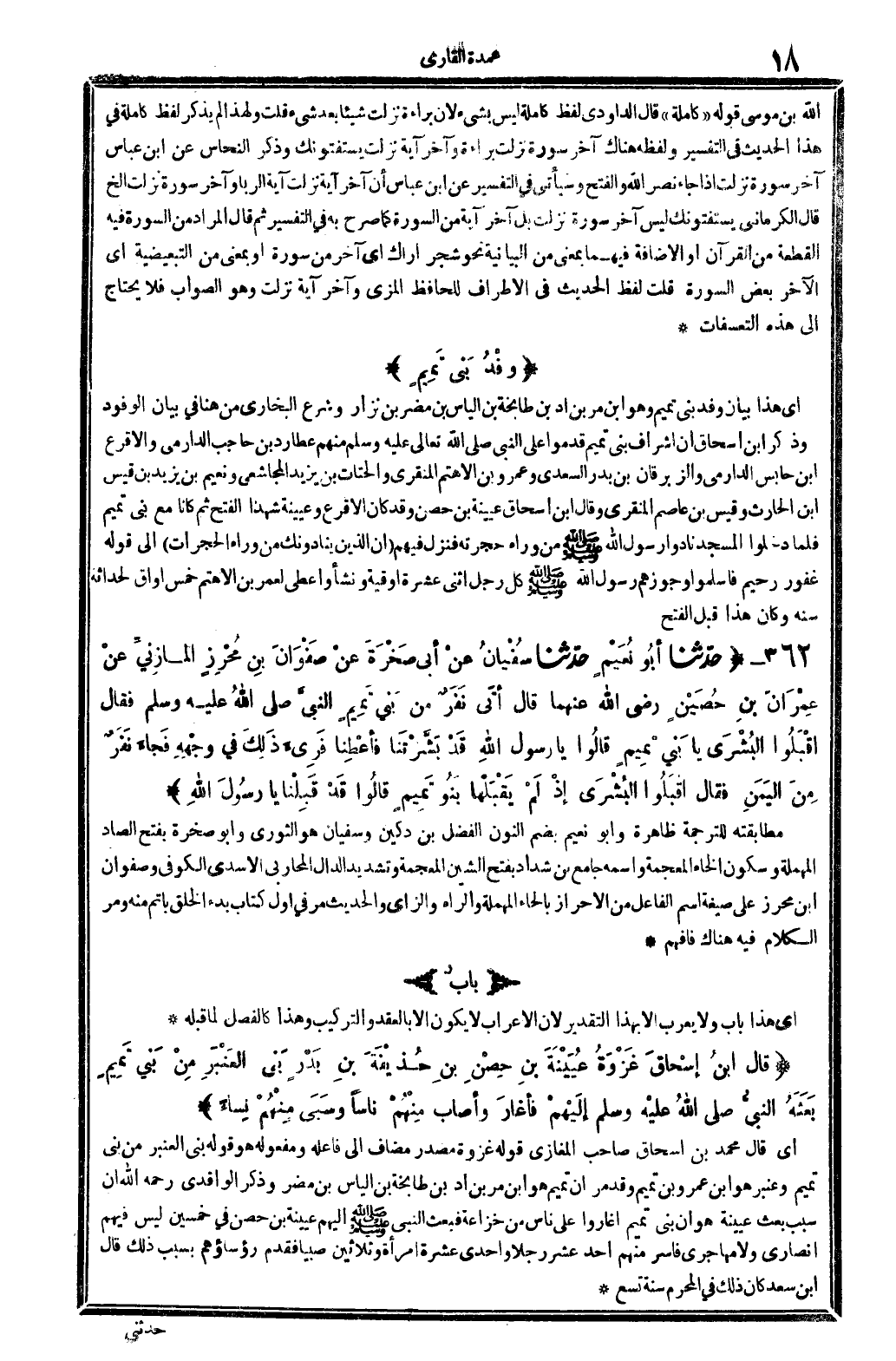 أَي: هَذَا بَيَان وَفد بني تَمِيم. وَهُوَ ابْن مر بن اد بن طابخة بن الياس بن مُضر بن نزار، وَشرع البُخَارِيّ من هُنَا فِي بَيَان الْوُفُود، وَذكر ابْن إِسْحَاق أَن أَشْرَاف بَين تَمِيم قدمُوا على النَّبِي صلى الله عَلَيْهِ وَسلم، مِنْهُم عُطَارِد بن حَاجِب الدَّارمِيّ، والأقرع وعيينة شَهدا الْفَتْح ثمَّ كَانَا مَعَ نَبِي تَمِيم. فَلَمَّا دخلُوا الْمَسْجِد نادوا رَسُول الله صلى الله عَلَيْهِ وَسلم من وَرَاء حجرته، فيهم: {إِن الَّذين يُنَادُونَك من وَرَاء الحجرات} إِلَى قَوْله: {غَفُور رَحِيم} (الحجرات: 4 5) فأسلموا وجوزهم رَسُول الله صلى الله عَلَيْهِ وَسلم كل رجل اثْنَي عشرَة أُوقِيَّة وَنَشَأ وَأعْطى لعمر بن الْأَهْتَم خمس أَوَاقٍ لحداثة سنة، وَكَانَ هَذَا قبل الْفَتْح.