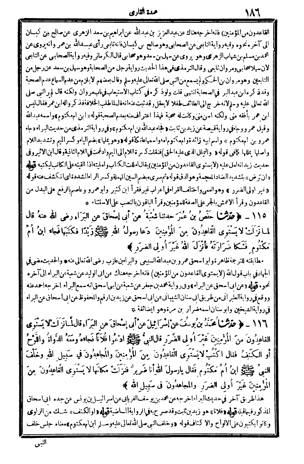4594 - ح دَّثنا مُحَمَّدُ بنُ يُوسُفَ عنْ إسْرَائِيلَ عنْ أبِي إسْحَاقَ عنِ البَرَاءِ قَالَ لَمَّا نَزَلَتْ لَا يَسْتَوِي القَاعِدُونَ مِنَ المُؤْمِنِينَ غَيْرَ أُوَلِي الضَّرَرِ قَال النبيُّ صلى الله عَلَيْهِ وَسلم ادْعُوا فُلانا فَجَاءَهُ وَمَعَهُ الدَّوَاةُ وَاللَّوْحُ أوْ الكَتِفَ فَقَال اكْتُبْ {لَا يَسْتَوِي الْقَاعِدُونَ مِنَ الْمُؤْمِنِينَ} و {المُجاهِدُونَ فِي سَبِيلِ الله} وَخَلْفَ النبيِّ صلى الله عَلَيْهِ وَسلم ابنُ أُمِّ مَكْتُومٍ فَقَالَ يَا رَسُولِ اللهأنَا ضَرِيرٌ فَنَزَلَتْ مكَانَها {لَا يَسْتَوِي الْقَاعِدُونَ مِنَ المُؤْمِنينَ غَيْرَ أُوَلِي الضَرَرِ وَالمجاهدُونَ فِي سَبِيلِ الله} .