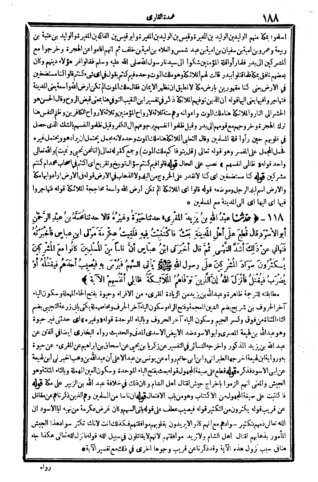4596 - ح دَّثنا عَبْدُ الله بنُ يَزِيدَ المُقْرِىءُ حدَّثنا حَيْوَةُ وَغَيْرُهُ قَالا حدَّثنا مُحَمَّدُ بنُ عَبْدِ الرَّحْمانِ أبُو الأسْوَدِ قَالَ قُطِعَ عَلَى أهْلِ المَدِينَةِ بَعْثٌ فَاكْتُتِبْتُ فِيهِ فَلَقِيتُ عِكْرَمَةَ مَوْلَى ابنِ عباسٍ فأخْبَرْتُهُ فَنَهانِي عَنْ ذَلِكَ أشَدَّ النَّهْيِ ثُمَّ قَالَ أخْبَرَنِي ابْنُ عَبَّاسٍ أنَّ نَاسا مِنَ المُسْلِمِينَ كانُوا مَعَ المُشْرِكِينَ يُكَثِّرُونَ سَوَادَ المُشْرِكِينَ عَلَى رَسُولِ الله صلى الله عَلَيْهِ وَسلم يَأتِي السَّهمُ فَيُرْمَى بِهِ فَيُصِيبُ أحَدَهُمْ فَيقْتُلُهُ أوْ يُضْرَبُ فَيُقْتَلُ فَأنْزَلَ الله {إنَّ الَّذِينَ تَوَفاهُمُ المَلائِكَةُ ظَالِمِي أنْفُسِهِمْ} .