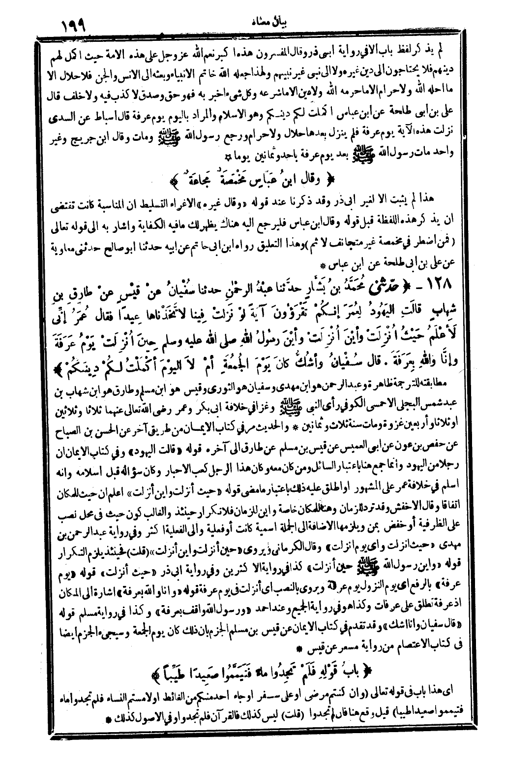 لم يذكر لفظ بَاب إِلَّا فِي رِوَايَة أبي ذَر وَقَالَ الْمُفَسِّرُونَ: هَذِه أكبر نعم الله عز وَجل على هَذِه الْأمة حَيْثُ أكمل لَهُم دينهم فَلَا يَحْتَاجُونَ إِلَى دين غَيره وَلَا إِلَى نَبِي غير نَبِيّهم، وَلِهَذَا جعله الله خَاتم الْأَنْبِيَاء وَبَعثه إِلَى الْإِنْس وَالْجِنّ، فَلَا حَلَال إلاَّ مَا أحله الله، وَلَا حرَام إلاَّ مَا حرمه الله، وَلَا دين إلاَّ مَا شَرعه وكل شَيْء أخبر بِهِ فَهُوَ حق وَصدق لَا كذب فِيهِ وَلَا خلف. قَالَ عَليّ بن أبي طَلْحَة. عَن ابْن عَبَّاس {كملت لكم دينكُمْ} (الْمَائِدَة: 3) وَهُوَ الْإِسْلَام، وَالْمرَاد بِالْيَوْمِ: يَوْم عَرَفَة. قَالَ أَسْبَاط عَن السّديّ: نزلت هَذِه الْآيَة يَوْم عَرَفَة فَلم ينزل بعْدهَا حَلَال وَلَا حرَام، وَرجع رَسُول الله صلى الله عَلَيْهِ وَسلم وَمَات. وَقَالَ ابْن جريج وَغير وَاحِد: مَاتَ رَسُول الله صلى الله عَلَيْهِ وَسلم بعد يَوْم عَرَفَة بِأحد وَثَمَانِينَ يَوْمًا.