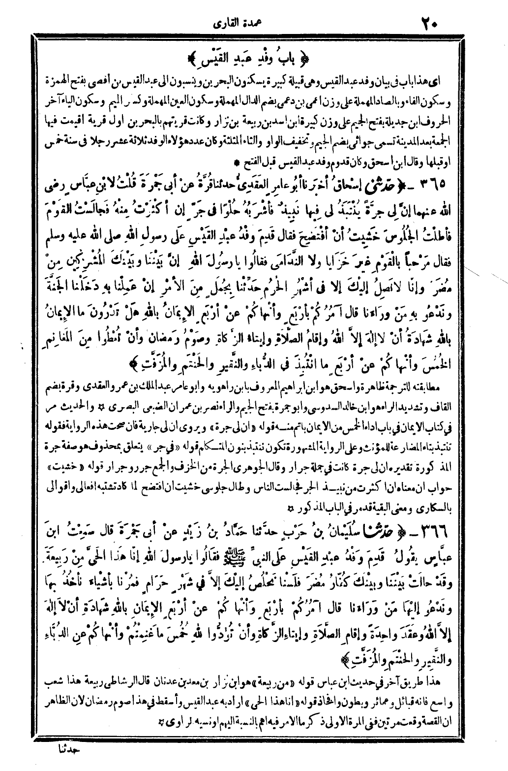 4368 - ح دّثني إسْحَاقُ أخبرَنا أبُو عامِرٍ العَقَدِيُّ حَدثنَا قُرَّةُ عنْ أبي جَمْرَةَ قُلْتُ ل ابْنِ عبَّاسٍ رَضِي الله عَنْهُمَا إنَّ لِي جرَّةً يُنْتَبَذُ لي فِيها نَبِيذٌ فأشْرَبُهُ حُلْواً فِي جَرٍّ إِن أكْثَرْتُ مِنْهُ فَجالَسْتُ القَوْمَ فأطلْتُ الجُلُوسَ خَشِيتُ أنْ أفْتَضِحَ فَقَالَ قَدِمَ وفْدُ عبْدِ القَيْسِ علَى رسولِ الله صلى الله عَلَيْهِ وَسلم فَقَالَ: مَرْحباً بالْقَوْمِ غيرَ خَزَايا وَلَا النَّدَامَى فقالُوا يَا رسُولَ الله إنَّ بَيْنَنَا وبَيْنَكَ المُشْرِكِينَ مِنْ مُضَرَ وإنّا لَا نَصِلُ إليْكَ إِلَّا فِي أشْهُرِ الحُرُمِ حَدِّثْنا بِجُمَلٍ مِنَ الأمْرِ إنْ عَمِلْنا بهِ دَخَلْنا الجَنَّةَ ونَدْعُو بهِ مَنْ وَرَاءَنا قَالَ آمُرُكُمْ بأرْبَعٍ وأنْهاكُمْ عنْ أرْبَعٍ الإيمانُ بِاللَّه هَلْ تَدْرُونَ مَا الإيمانُ الله شَهادَةُ أنْ لَا إلاهَ إلاَّ الله وإقامُ الصَّلاَةِ وإيتاءُ الزَّكاةِ وصَوْمُ رَمضان وأنْ تُعْطُوا مِنَ المَغانِمِ الخُمسَ وأنْهاكُمْ عنْ أرْبَعٍ مَا انْتُبِذَ فِي الدُّباءِ والنِّقيرِ والحَنْتَمِ والمُزَفَّتِ. .