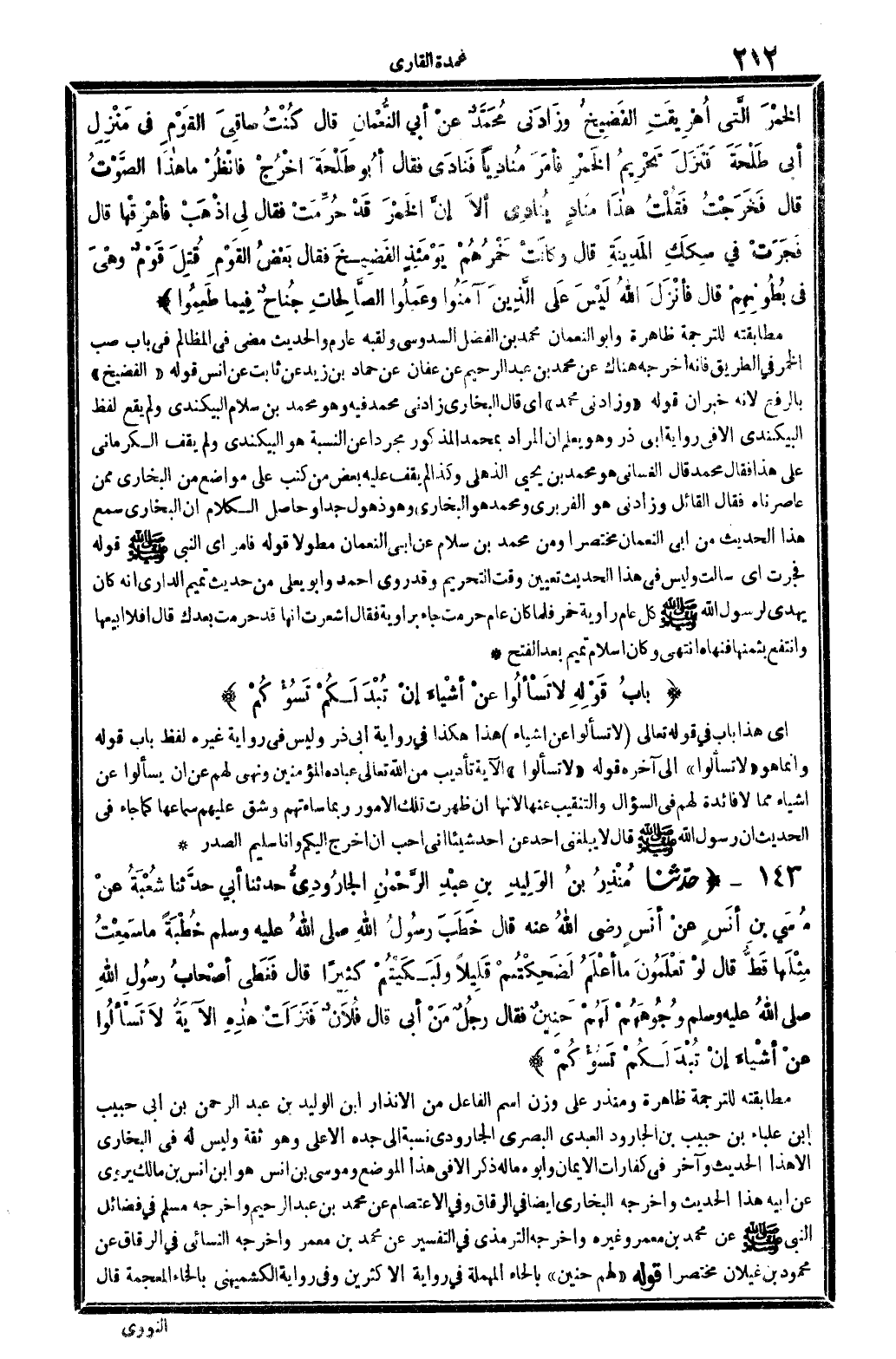 أَي: هَذَا بَاب فِي قَوْله تَعَالَى: {لَا تسألوا عَن أَشْيَاء} هَذَا هَكَذَا فِي رِوَايَة أبي ذَر، وَلَيْسَ فِي رِوَايَة غَيره لفظ: بَاب قَوْله: وَإِنَّمَا هُوَ (لَا تسألوا) إِلَى آخِره. قَوْله: (لَا تسألوا) الْآيَة تَأْدِيب من الله تَعَالَى عباده الْمُؤمنِينَ، وَنهي لَهُم عَن أَن يسْأَلُوا عَن أَشْيَاء مِمَّا لَا فَائِدَة لَهُم فِي السُّؤَال والنقيب عَنْهَا لِأَنَّهَا إِن ظَهرت تِلْكَ الْأُمُور رُبمَا ساءتهم وشق عَلَيْهِم سماعهَا، كَمَا جَاءَ فِي الحَدِيث أَن رَسُول الله صلى الله عَلَيْهِ وَسلم قَالَ: (لَا يبلغنِي أحد عَن أحد شَيْئا آني أحب أَن أخرج إِلَيْكُم وَأَنا سليم الصَّدْر) .