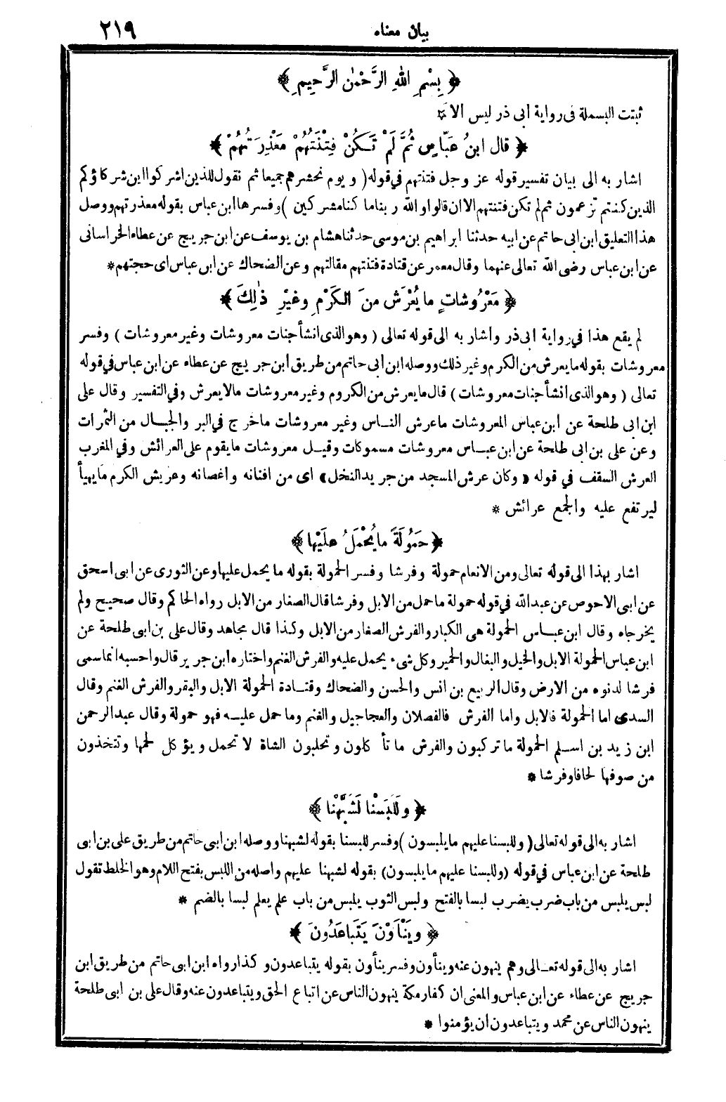 لم يَقع هَذَا فِي رِوَايَة أبي ذَر وَأَشَارَ بِهِ إِلَى قَوْله تَعَالَى: {وَهُوَ الَّذِي أنشأ جنَّات معروشات وَغير معروشات} (الْأَنْعَام: 14) وَفسّر معروشات بقوله: مَا يعرش من الْكَرم، وَغير ذَلِك، وَوَصله ابْن أبي حَاتِم من طَرِيق ابْن جريج عَن عَطاء عَن ابْن عَبَّاس فِي قَوْله تَعَالَى: {وَهُوَ الَّذِي أنشأ جنَّات معروشات} قَالَ: مَا يعرش من الكروم، وَغير معروشات مَا لَا يعرش، وَفِي التَّفْسِير، وَقَالَ عَليّ ابْن أبي طَلْحَة عَن ابْن عَبَّاس: المعروشات مَا عرش النَّاس، وَغير معروشات مَا خرج فِي الْبر وَالْجِبَال من الثمرات وَعَن عَليّ بن أبي طَلْحَة عَن ابْن عَبَّاس: معروشات مسموكات، وَقيل: معروشات مَا يقوم على العراش، وَفِي (الْمغرب) : الْعَرْش السّقف فِي قَوْله: (وَكَانَ عرش الْمَسْجِد من جريد النّخل) أَي: من أفنانه وأغصانه، وعريش الْكَرم مَا يهيأ ليرتفع عَلَيْهِ، وَالْجمع عراش.
