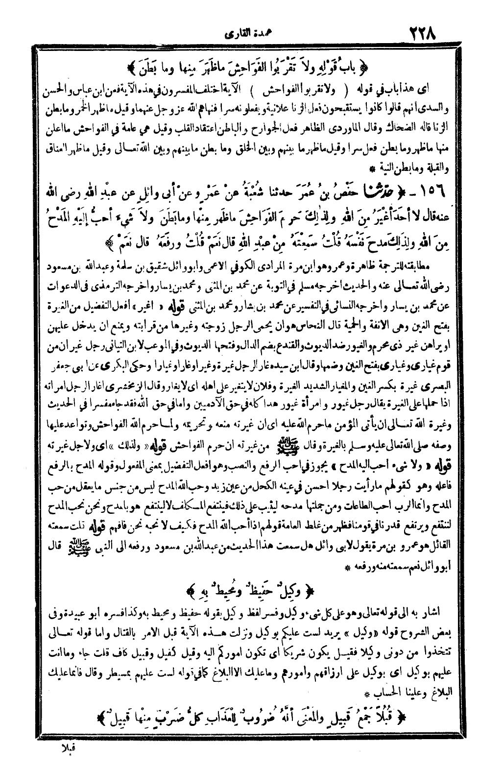 أَي: هَذَا بَاب فِي قَوْله تَعَالَى: {وَلَا تقربُوا الْفَوَاحِش} الْآيَة اخْتلف الْمُفَسِّرُونَ فِي هَذِه الْآيَة، فَعَن ابْن عَبَّاس وَالْحسن وَالسُّديّ: أَنهم قَالُوا: كَانُوا يستقبحون فعل الزِّنَى عَلَانيَة ويفعلونه سرا فنهاهم الله عز وَجل عَنْهُمَا. وَقيل: مَا ظهر الْخمر وَمَا بطن الزِّنَا. قَالَه الضَّحَّاك وَقَالَ الْمَاوَرْدِيّ: الظَّاهِر فعل الْجَوَارِح، وَالْبَاطِن اعْتِقَاد الْقلب، وَقيل: هِيَ عَامَّة فِي الْفَوَاحِش مَا أعلن مِنْهَا مَا ظهر وَمَا بطن فعل سرا. وَقيل: مَا ظهر مَا بَينهم وَبَين الْخلق، وَمَا بطن مَا بَينهم وَبَين الله تَعَالَى، وَقيل: مَا ظهر العناق والقبلة، وَمَا بطن النِّيَّة.