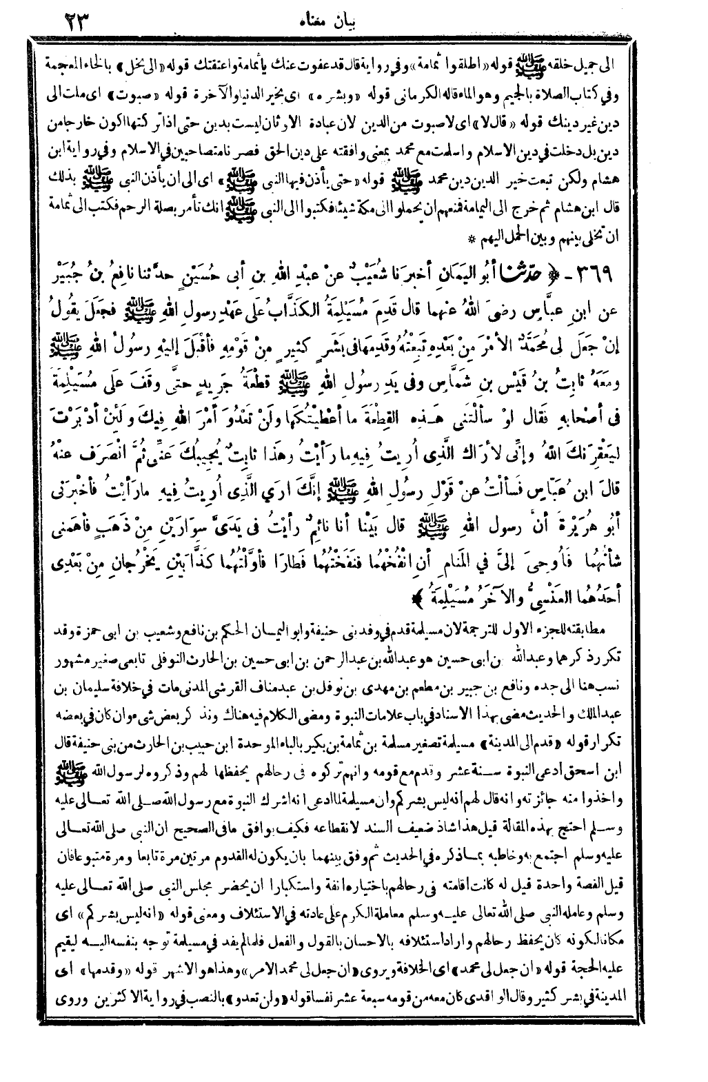4373 - ح دّثنا أبُو اليَمَانِ أخبَرنا شُعَيْبٌ عنْ عبْدِ الله بنِ أبي حُسَيْنٍ حدَّثنا نافِعُ بنُ جُبَيْر عَن ابْن عبَّاسٍ رَضِي الله عَنْهُمَا قَالَ قَدِمَ مُسَيْلِمَةُ الكَذَّابُ عَلى عَهْدِ رسولِ الله صلى الله عَلَيْهِ وَسلم فجَعَلَ يقُولُ إنْ جَعَلَ لي مُحَمَّدٌ الأمْرَ مِنْ بَعْدِهِ تَبِعْتُهُ وقَدِمِهَا فِي بَشَرٍ كثِيرٍ مِنْ قَوْمِهِ فأقْبَلَ إليْهِ رسُولُ الله صلى الله عَلَيْهِ وَسلم ومَعَهُ ثابِتُ بنُ قَيْس بنِ شَمَّاسِ وَفِي يَدِ رسُولِ الله صلى الله عَلَيْهِ وَسلم قطْعَةُ جَرِيدٍ حتَّى وقَفَ عَلَى مُسَيْلِمَةَ فِي أصحابهِ فَقال لوْ سألْتَني هَذِهِ القِطْعَةَ مَا أعْطيْتُكَها ولَنْ تَعْدُوَ أمْرَ الله فِيكَ ولَئِنْ أدْبَرْتَ ليَعْقِرَنَكَ الله وإنِّي لأرَاك الَّذِي أُرِيتُ فِيهِ مَا رَأيْتُ وهَذا ثابِتٌ يُجِيبُكَ عَنِّي ثُمَّ انْصَرَفَ عنْهُ. قالَ ابنُ عَبّاسٍ فَسألْتُ عنْ قَوْلِ رسُولِ الله صلى الله عَلَيْهِ وَسلم إنَّكَ ارَي الَّذِي أُرِيتُ فِيهِ مَا رَأيْتُ فأخبْرَني أبُو هُرَيْرَة أنَّ رَسُول الله صلى الله عَلَيْهِ وَسلم قَالَ بَيْنَا أَنا نائِمٌ رأيْتُ فِي يَدَيَّ سِوَارَيْنِ مِنْ ذَهَبٍ فأهمَني شأنُهُما فَأُوحِيَ إليَّ فِي المَنامِ أنِ انْفُخْهُما فنَفَخْتُهُما فَطَارَا فأوَّلْتُهُما كَذَّابَيْنِ يَخْرُجانِ مِنْ بَعْدِي أحَدُهُما العَنْسِيُّ والآخَرُ مُسَيْلِمَةُ. .