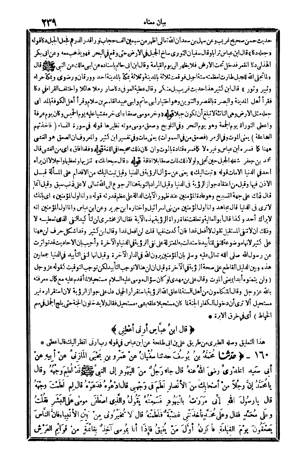 حَدِيث حسن صَحِيح غَرِيب، وَعَن سهل بن سعد: أَن الله تَعَالَى أظهر من سبعين ألف حجاب نورا قدر الدِّرْهَم فَجعل الْجَبَل كأقواله (جعله دكا) قَالَ ابْن عَبَّاس: تُرَابا، وَقَالَ سُفْيَان الثَّوْريّ: ساخ الْجَبَل فِي الأَرْض حَتَّى وَقع فِي الْبَحْر فَهُوَ يذهب مَعَه، وَعَن أبي بكر الْهُذلِيّ: دكا انقعر فَدخل تَحت الأَرْض فَلَا يظْهر إِلَى يَوْم الْقِيَامَة، وَقَالَ ابْن أبي حَاتِم بِإِسْنَادِهِ عَن أبي مَالك عَن النَّبِي صلى الله عَلَيْهِ وَسلم قَالَ: (لما تجلى الله للجبل طارت لعظمته سِتَّة أجبل فَوَقَعت ثَلَاثَة بِالْمَدِينَةِ وَثَلَاثَة بِمَكَّة، بِالْمَدِينَةِ: أحد وورقان ورضوى، وبمكة حراء وثبير وثور) . قَالَ ابْن كثير: هَذَا حَدِيث غَرِيب بل مُنكر، وَقَالَ عَطِيَّة الْعَوْفِيّ: دكاً صَار رملاً هائلاً، وَاخْتلف الْقُرَّاء فِي دكاً فَقَرَأَ أهل الْمَدِينَة وَالْبَصْرَة بِالْقصرِ والتنوين وَهُوَ اخْتِيَار أبي حَاتِم وَأبي عبيد الْقَاسِم بن سَلام، وَقَرَأَ أهل الْكُوفَة بِالْمدِّ أَي جعله مثل الأَرْض وَهِي الناتئة لَا تبلغ أَن تكون جبلا. قَوْله: (وخر مُوسَى صعقاً) أَي: خر مغشياً عَلَيْهِ يَوْم الْخَمِيس وَكَانَ يَوْم عَرَفَة وَأعْطِي التَّوْرَاة يَوْم الْجُمُعَة، وَهُوَ يَوْم النَّحْر، وَفِي (التَّلْوِيح) : وصعق مُوسَى مَوته، نظيرها قَوْله فِي سُورَة النِّسَاء: {فَأَخَذتهم الصاعقة} (النِّسَاء: 153) يَعْنِي: الْمَوْت، وَفِي الزمر: {فَصعِقَ من فِي السَّمَوَات} يَعْنِي: مَاتَ، وَفِي تَفْسِير ابْن كثير: وَالْمَعْرُوف أَن الصَّعق هُوَ الغشي هَهُنَا كَمَا فسره ابْن عَبَّاس وَغَيره لَا كَمَا فسره قَتَادَة بِالْمَوْتِ وَإِن كَانَ ذَلِك صَحِيحا فِي اللُّغَة. قَوْله: (فَلَمَّا أَفَاق) أَي: من الغشي، قَالَ مُحَمَّد بن جَعْفَر: شغله الْجَبَل حِين تجلى وَلَوْلَا ذَلِك لمات صعقاً بِلَا إفاقة. قَوْله: (قَالَ سُبْحَانَكَ) تَنْزِيها وتعظيماً وإجلالاً أَن يرَاهُ أحد فِي الدُّنْيَا إلاَّ مَاتَ. قَوْله: (تبت إِلَيْك) يَعْنِي عَن سُؤال الرُّؤْيَة فِي الدُّنْيَا، وَقيل: تبت إِلَيْك من الْإِقْدَام على الْمَسْأَلَة قبل الْإِذْن فِيهَا، وَقيل: من اعْتِقَاد جَوَاز الرُّؤْيَة فِي الدُّنْيَا، وَقيل: المُرَاد بِالتَّوْبَةِ هُنَا الرُّجُوع إِلَى الله تَعَالَى لَا على ذَنْب سبق، وَقيل: إِنَّمَا قَالَ ذَلِك على جِهَة التَّسْبِيح وَهُوَ عَادَة الْمُؤمنِينَ عِنْد ظُهُور الْآيَات الدَّالَّة على عظم قدرته. قَوْله: (وَأَنا أول الْمُؤمنِينَ) ، أَي: بأنك لَا ترى فِي الدُّنْيَا، قَالَ مُجَاهِد: وَأَنا أول الْمُؤمنِينَ من بني إِسْرَائِيل، وَاخْتَارَهُ ابْن جرير، وَعَن ابْن عَبَّاس: وَأَنا أول الْمُؤمنِينَ أَنه لَا يراك أحد، وَكَذَا قَالَ أَبُو الْعَالِيَة. وتعلقت نفاة رُوَاة الرُّؤْيَة بِهَذِهِ الْآيَة، فَقَالَ الزَّمَخْشَرِيّ: لن، لتأكيد النَّفْي الَّذِي تعطيه: لَا، وَذَلِكَ أَن: لَا تَنْفِي الْمُسْتَقْبل، تَقول: لَا أفعل غَدا، فَإِن أكدت نَفيهَا قلت: لن أفعل غَدا، وَقَالَ ابْن كثير: وَقد أشكل حرف: لن، هَهُنَا على كثير لِأَنَّهَا مَوْضُوعَة للنَّفْي للتأبيد، فاستدلت بِهِ الْمُعْتَزلَة على نفي الرُّؤْيَة فِي الدُّنْيَا وَالْآخِرَة. وَأجِيب: بِأَن الْأَحَادِيث قد تَوَاتَرَتْ عَن رَسُول الله صلى الله عَلَيْهِ وَسلم، بِأَن الْمُؤمنِينَ يرَوْنَ الله فِي الدَّار الْآخِرَة. وَقيل إِنَّهَا لنفي التَّأْبِيد فِي الدُّنْيَا جمعا بَين هَذِه وَبَين الدَّلِيل الْقَاطِع على صِحَة الرُّؤْيَة فِي الْآخِرَة، وَقيل: إِن لن لَا توجب التَّأْبِيد لَكِن توجب التَّوْقِيت، كَقَوْلِه عز وَجل: {وَلنْ يَتَمَنَّوْهُ أبدا} (الْبَقَرَة: 95) يَعْنِي: الْمَوْت، وَقَالَ عَليّ بن مهْدي: لَو كَانَ سُؤال مُوسَى عَلَيْهِ السَّلَام، مستحيلاً لما أقدم عَلَيْهِ مَعَ كَمَال مَعْرفَته بِاللَّه عز 