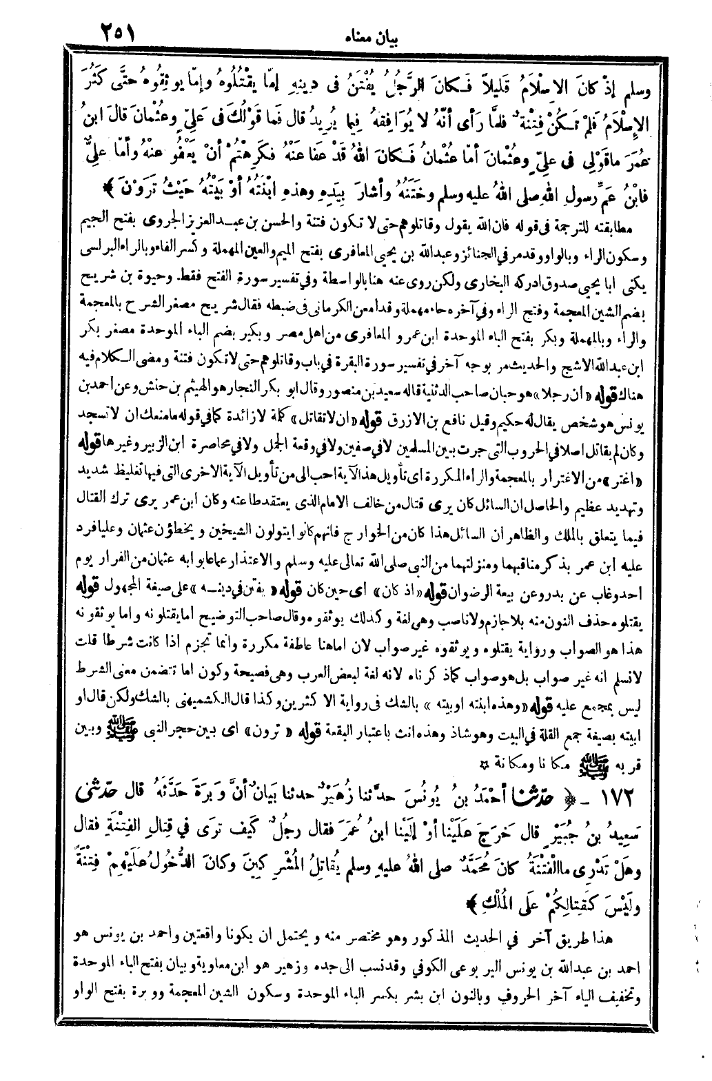 وَسلم إذْ كَانَ الإسْلامُ قَلِيلاً فَكَانَ الرَّجُلُ يُفْتَنُ فِي دِينِهِ إمّا يَقْتُلُوهُ وَإمّا يوثِقُوهُ حَتَّى كَثُرَ الإسْلامُ فَلمْ تَكُنْ فِتْنَةٌ فَلمَّا رَأى أنَّهُ لَا يُوَافِقهُ فِيما يُرِيدُ قَال فا قَوْلُكَ فِي عَلِيٍّ وَعُثْمَانَ قَالَ ابنُ عُمَرَ مَا قَوْلِي فِي عَلِيٍّ وَعُثْمانَ أمَّا عُثْمَانُ فَكَانَ الله قَدْ عَفَا عَنْهُ فَكَرِهْتُمْ أنْ يَعْفُو عَنْهُ وَأمّا عَلِيٌّ فابْنُ عَمِّ رَسُولِ الله صلى الله عَلَيْهِ وَسلم وَخَتَنُهُ وأشارَ بِيَدِهِ وَهاذِهِ ابْنَتُهُ أوْ بَيْتُهُ حَيْثُ تَرَوْنَ.