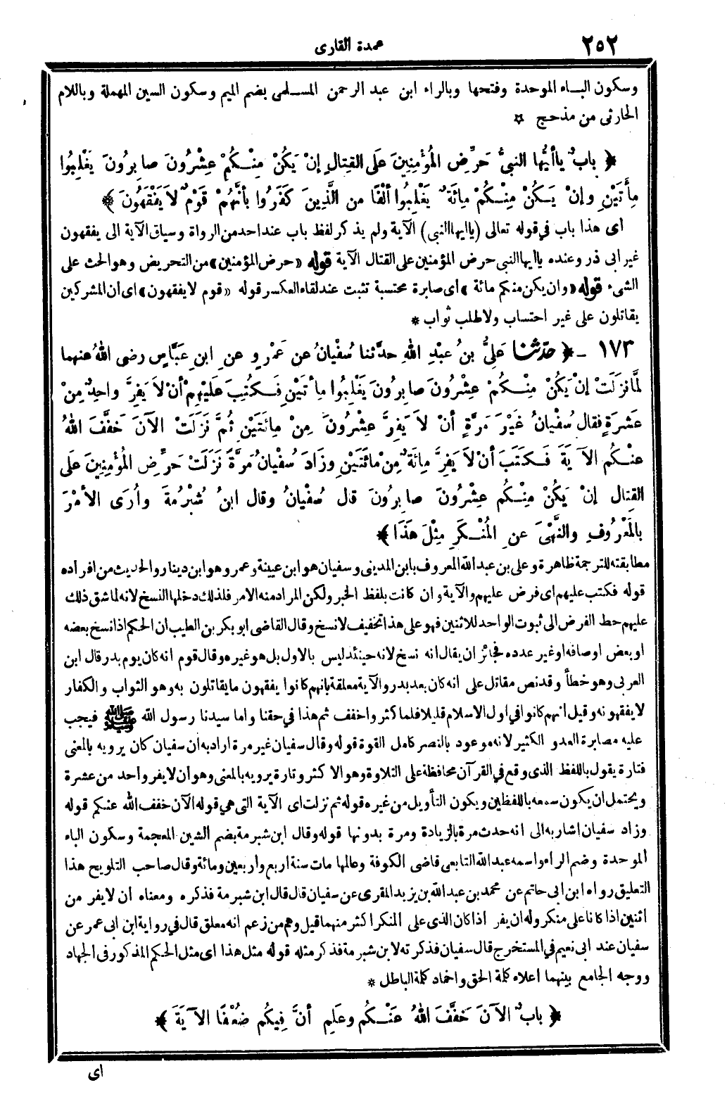 أَي: هَذَا بَاب فِي قَوْله تَعَالَى: {يَا أَيهَا النَّبِي} الْآيَة. وَلم يذكر لفظ بَاب، عِنْد أحد من الروَاة، وَسِيَاق الْآيَة إِلَى (يفقهُونَ) غير أبي ذَر، وَعِنْده: {يَا أَيهَا النَّبِي حرض الْمُؤمنِينَ على الْقِتَال} الْآيَة. قَوْله: (حرض الْمُؤمنِينَ) ، من التحريض وَهُوَ الْحَث على الشَّيْء. قَوْله: (وَإِن يكن مِنْكُم مائَة) ، أَي: صابرة محتسبة تثبت عِنْد لِقَاء الْعَسْكَر. قَوْله: (قوم لَا يفقهُونَ) أَي: إِن الْمُشْركين يُقَاتلُون على غير احتساب وَلَا طلب ثَوَاب.