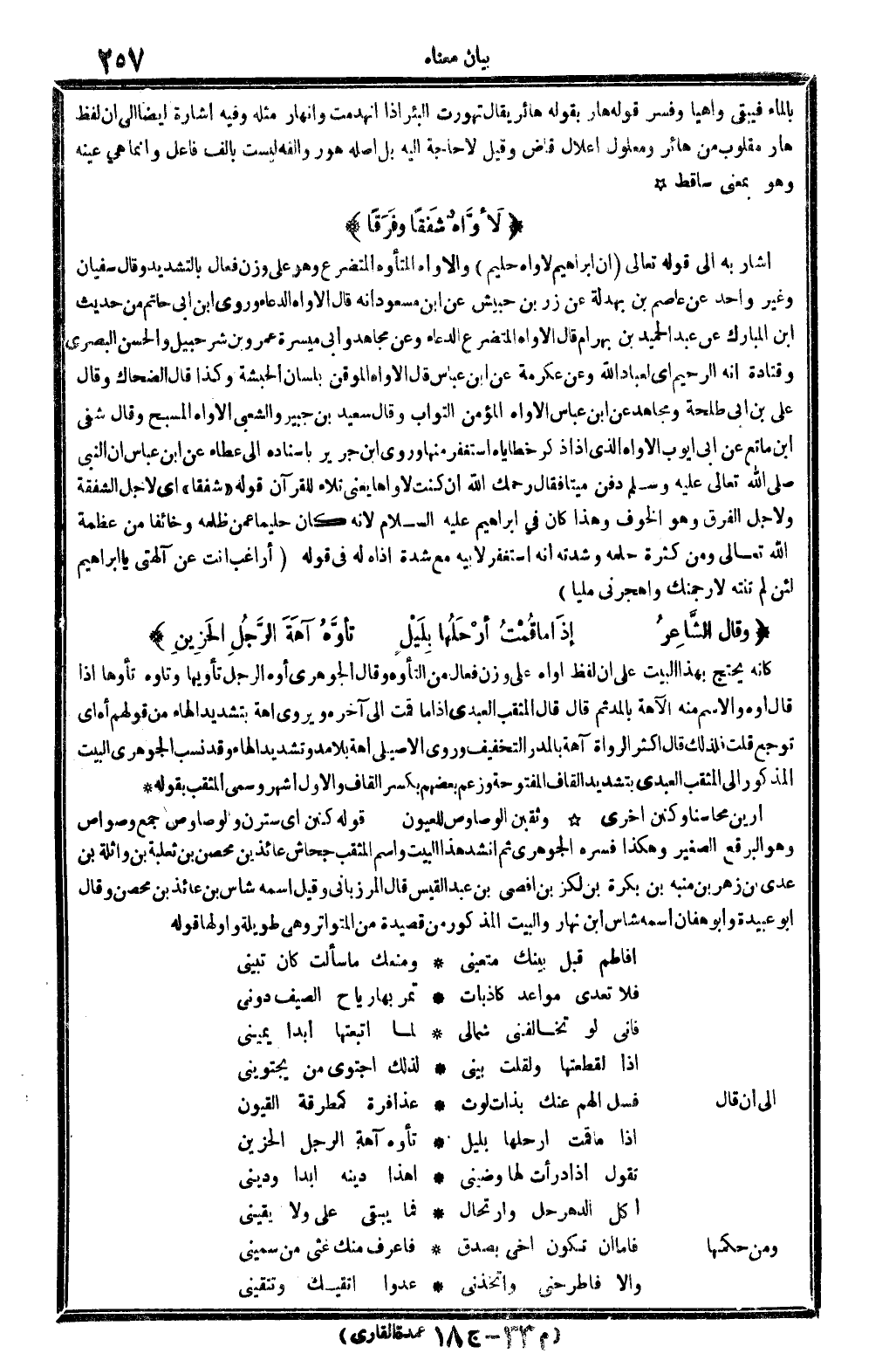 أَشَارَ بِهِ إِلَى قَوْله تَعَالَى: {إِن إِبْرَاهِيم لأواه حَلِيم} (التَّوْبَة: 114) والأواه المتأوه المتضرع، وَهُوَ على وزن فعال، بِالتَّشْدِيدِ، وَقَالَ سُفْيَان وَغير وَاحِد. عَن عَاصِم بن بَهْدَلَة عَن زر بن حُبَيْش عَن ابْن مَسْعُود أَنه قَالَ: الأواه الدُّعَاء، وروى ابْن أبي حَاتِم من حَدِيث ابْن الْمُبَارك عَن عبد الحميد بن بهْرَام، قَالَ: الأواه المتضرع الدُّعَاء، وَعَن مُجَاهِد وَأبي ميسرَة عَمْرو بن شُرَحْبِيل وَالْحسن الْبَصْرِيّ وَقَتَادَة أَنه الرَّحِيم أَي: لعباد الله، وَعَن عِكْرِمَة عَن ابْن عَبَّاس، قَالَ: الأواه الموقن بِلِسَان الْحَبَشَة، وَكَذَا قَالَ الضَّحَّاك، وَقَالَ عَليّ بن أبي طَلْحَة وَمُجاهد عَن ابْن عَبَّاس، الأواه الْمُؤمن التواب، وَقَالَ سعيد بن جُبَير وَالشعْبِيّ: الأواه المسبح، وَقَالَ شفي ابْن مَانع عَن أبي أَيُّوب: الأواه الَّذِي إِذا ذكر خطاياه اسْتغْفر مِنْهَا، وروى ابْن جرير بِإِسْنَادِهِ إِلَى عَطاء عَن ابْن عَبَّاس: أَن النَّبِي صلى الله عَلَيْهِ وَسلم، دفن مَيتا فَقَالَ: رَحِمك الله إِن كنت لأواها يَعْنِي: تلاء لِلْقُرْآنِ. قَوْله: (شفقا) أَي: لأجل الشَّفَقَة وَلأَجل الْفرق، وَهُوَ الْخَوْف، وَهَذَا كَانَ فِي إِبْرَاهِيم، عَلَيْهِ السَّلَام، لِأَنَّهُ كَانَ حَلِيمًا عَمَّن ظلمه وخائفا من عَظمَة الله تَعَالَى وَمن كَثْرَة حلمه وشدته أَنه اسْتغْفر لِأَبِيهِ مَعَ شدَّة أَذَاهُ لَهُ فِي قَوْله: {أراغب أَنْت عَن آلهتي يَا إِبْرَاهِيم لَئِن لم تَنْتَهِ لأرجمنك واهجرني مَلِيًّا} (مَرْيَم: 46) .
