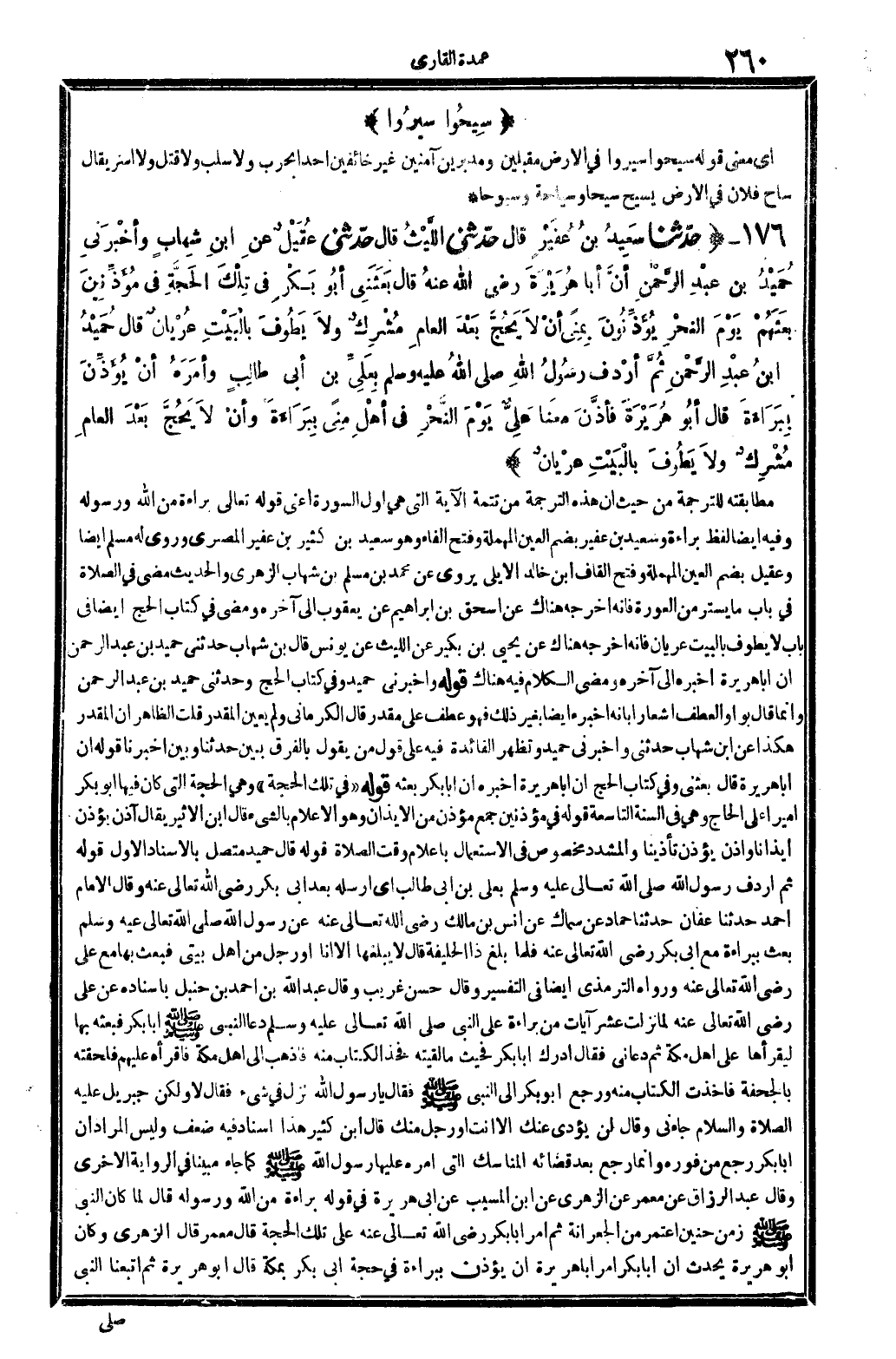 4655 - ح دَّثنا سَعِيدُ بنُ عُفَيْرٍ قَالَ حدَّثني اللَّيْثُ قَالَ حدَّثني عُقَيْلٌ عَنِ ابنِ شِهابٍ وَأخْبَرَنِي حُمَيْدُ بنُ عَبْدِ الرَّحْمانِ أنَّ أبَا هُرَيْرَةَ رَضِي الله عنهُ قَالَ بَعَثَنِي أبُو بَكْرٍ فِي تِلْكَ الحَجَّةِ فِي مُؤَذِّنِينَ بَعَثَهُمْ يَوْمَ النَّحْرِ يُؤَذِّنُونَ بِمَنًى أنْ لَا يَحُجَّ بَعْدَ العامِ مُشْرِكٌ وَلا يَطُوفَ بِالْبَيْتِ عُرْيَانٌ قَالَ حُمَيْدُ ابنُ عَبْدِ الرَّحْمانِ ثُمَّ أرْدَفَ رسُولُ الله صلى الله عَلَيْهِ وَسلم بِعَلِيِّ بنِ أبِي طَالِبٍ وَأمَرَهُ أنْ يُؤَذِّنَ بِبَرَاءَةَ قَالَ أبُو هُرَيْرَةَ فَأذَّنَ مَعَنا عَلِيٌّ يَوْمَ النَّحْرِ فِي أهْلِ منى بِبَرَاءَةَ وَأنْ لَا يَحُجَّ بَعْدَ العامِ مُشْرِكٌ وَلا يَطُوفَ بِالْبَيْتِ عَرْيَانٌ.