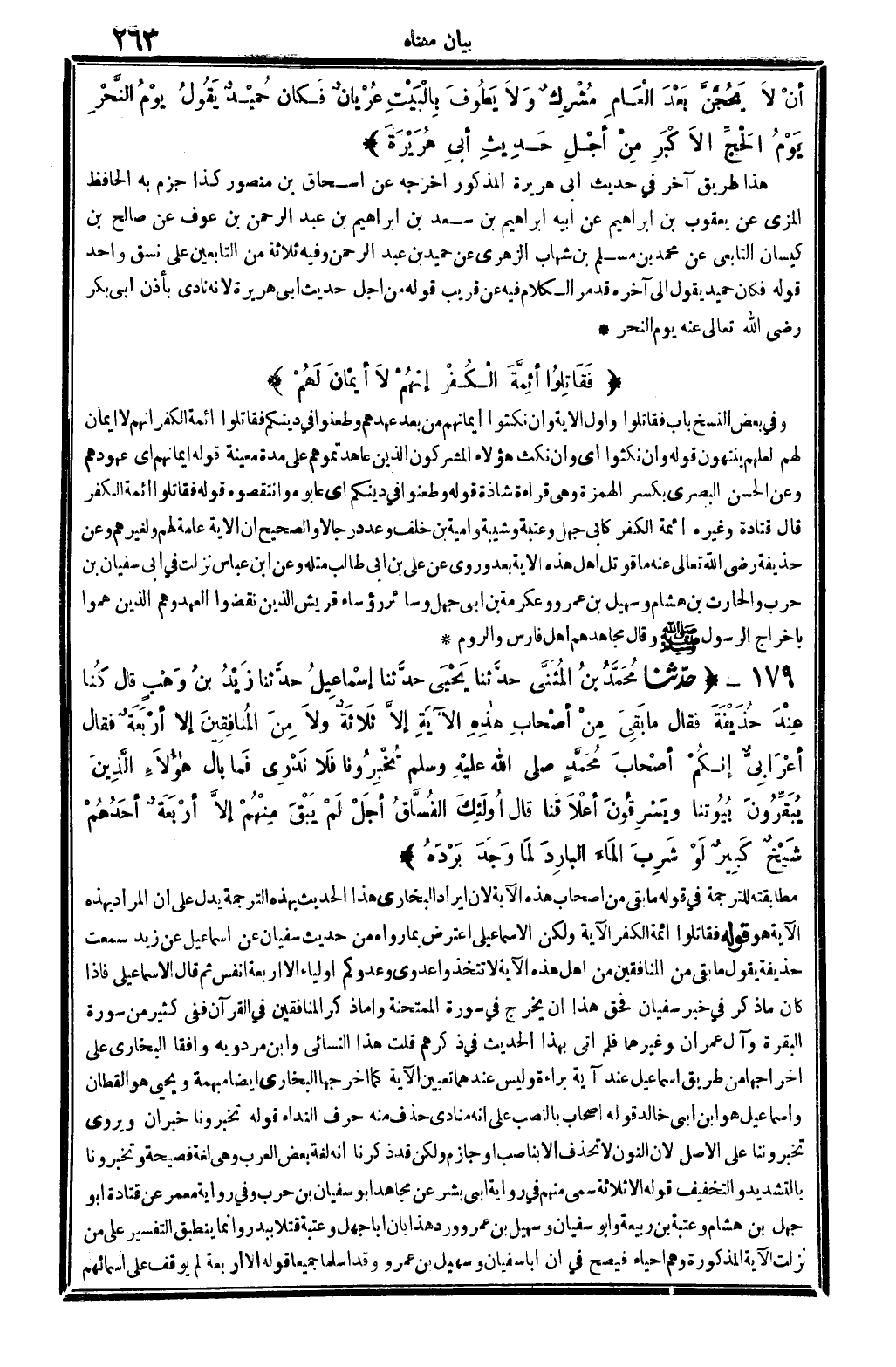 أنْ لاَ يَحُجَنَّ بَعْدَ الْعَامِ مُشْرِكٌ وَلاَ يَطُوفَ بِالْبَيْتِ عُرْيانٌ فَكان حُمَيْدٌ يَقُولُ يَوْمُ النَّحْرِ يَوْمُ الْحَجِّ الأَكْبَرِ مِنْ أجْلِ حَدِيثِ أبي هُرَيْرَةَ. .