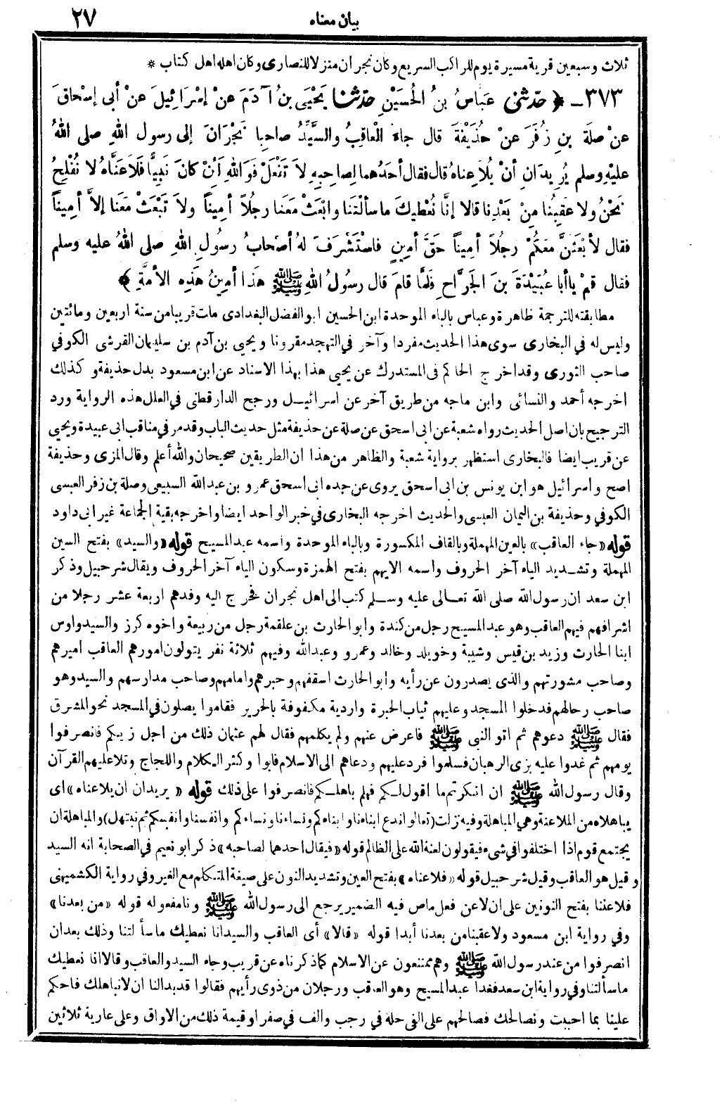 4380 - ح دّثني عَباسُ بنُ الحُسَيْنِ حدّثنا يَحْيى بنُ آدَمَ عنْ إسْرَائِيلَ عنْ أبي إسْحَاقَ عنْ صِلَة بنِ زُفَرَ عنْ حُذَيْفَةَ قَالَ جاءَ الْعَاقِبُ والسَّيِّدُ صاحِبا نَجْرَانَ إِلَى رَسُول الله صلى الله عَلَيْهِ وَسلم يُرِيدَانِ أنْ يُلاَعِناهُ قَالَ فَقَالَ أحدَهُما لِصاحِبِهِ لاَ تَفْعَلْ فَوَالله لَئِنْ كانَ نَبِيًّا فَلاَعَنَّاهُ لَا نُفْلِحُ نَحْنُ وَلَا عَقِبُنا مِنْ بَعْدِنا قَالَا إنَّا نُعْطيكَ مَا سألْتَنَا وابْعَثْ مَعَنا رجُلاً أمِيناً ولاَ تَبْعَثْ مَعَنَا إلاَّ أمِيناً فَقَالَ لأبْعَثَنَّ مَعَكُمْ رجُلاً أمِيناً حَقَّ أمِينٍ فاسْتَشْرَفَ لهُ أصْحابُ رسُولِ الله صلى الله عَلَيْهِ وَسلم فَقَالَ قمْ يَا أَبَا عُبَيْدَةَ بنَ الجَرَّاحِ فَلمَّا قامَ قَالَ رسُولُ الله صلى الله عَلَيْهِ وَسلم هَذا أمِينُ هَذِه الأمَّةِ. .