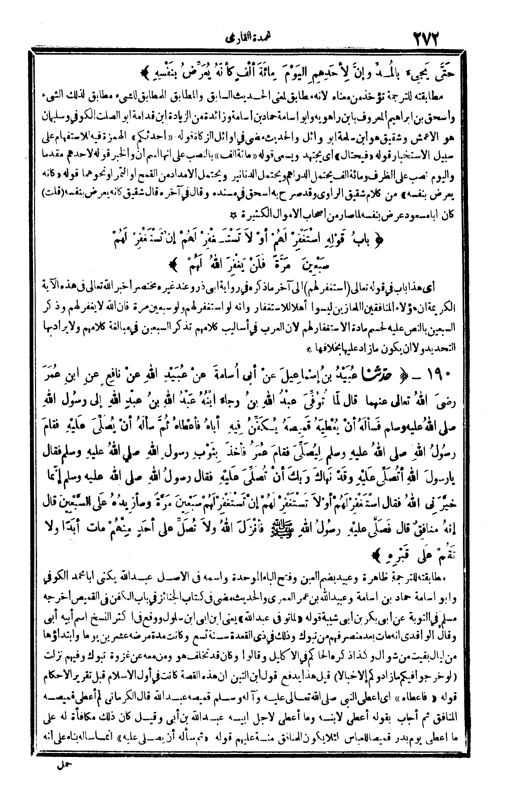 4670 - ح دَّثنا عُبَيْدُ بنُ إسْمَاعِيلَ عَنْ أبِي أُسَامَةَ عَنْ عُبَيْدِ الله عَنْ نَافِعٍ عَنِ ابنِ عُمَرَ رَضِيَ الله تَعَالَى عَنْهُمَا قَالَ لَمَا تُوِفِّيَ عَبْدُ الله بنُ رَجاءَ ابْنُهُ عَبْدُ الله بنُ عَبْدِ الله إلَى رَسُولِ الله صلى الله عَلَيْهِ وَسلم فَسَأَلَهُ أنْ يُعْطِيَهُ قَمِيصَهُ يُكَفَّنُ فِيهِ أباهُ فَأعْطاهُ ثُمَّ سَأَلَهُ أنْ يُصَلِّيَ عَلَيْهِ فَقَامَ رَسُولُ الله صلى الله عَلَيْهِ وَسلم لِيُصَلِّيَ فَقَامَ عُمَرُ فَأخذَ بِثَوْبِ رسولِ الله صلى الله عَلَيْهِ وَسلم فَقَالَ يَا رَسُول الله أتُصَلِي عَلَيْهِ وَقَدْ نَهَاك رَبَكَ أنْ تصليَ عَليْهِ فَقَالَ رَسُول الله صلى الله عَلَيْهِ وَسلم: (إنَّما خَيَّرَنِي الله) فَقَالَ: {اسْتَغْفِرْ لَهُمْ أوْ لَا تَسْتَغْفِرْ لَهُمْ سَبْعِينَ مَرَّةً} (التَّوْبَة: 84) وَسأزِيدُهُ عَلَى السَّبْعِينَ قَالَ إنَّهُ منافِقٌ قالَ فَصَلَّى عَلَيْهِ رَسُولُ الله صلى الله عَلَيْهِ وَسلم فَأَنْزَلَ الله: {وَلا تُصَلِّ عَلَى أَحَدٍ مِنْهُمْ مَاتَ أبَدا وَلا تَقُمْ عَلَى قَبْرِهِ} .