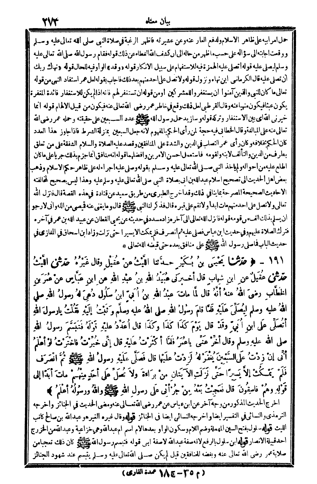4671 - ح دَّثنا يَحْيَى بنُ بُكَيْرٍ حدَّثنا اللَّيْثُ عَنْ عُقَيلٍ وَقَالَ غَيْرُهُ حدَّثني اللَّيْثُ حدَّثني عُقَيْلٌ عنِ ابنِ شِهابٍ قَالَ أخبرَنِي عُبَيْدُ الله بنُ عَبْدِ الله عنِ ابنِ عَبَّاسٍ عنْ عُمَرَ بنِ الخَطَابِ رَضِيَ الله عنهُ أنَّهُ قَالَ لمَّا مَاتَ عَبْدُ الله بنُ أُبَيٍّ ابنُ سَلُول دُعِيَ لهُ رَسُولُ الله صلى الله عَلَيْهِ وَسلم لِيُصَلِّيَ عَلَيْهِ فَلَمَّا قَامَ رَسُولُ الله صلى الله عَلَيْهِ وَسلم وَثَبْتُ إلَيْهُ فَقُلْتُ يَا رَسُولَ الله أَتُصَلِّي عَلَى ابنِ أُبَيٍّ وَقَدْ قَالَ يَوْمَ كَذَا كَذَا قَالَ أُعَدِّدُ عَلَيْهِ قَوْلَهُ فَتَبَسَّمَ رَسُولُ الله صلى الله عَلَيْهِ وَسلم وَقَالَ أخِّرْ عَنِّي يَا عُمَرُ فَلمَّا أكْثَرْتُ عَلَيْهِ قَالَ إنِّي خُيِّرْتُ فَاخْتَرْتُ لَوْ أعْلَمَ أنِّي إنْ زِدْتُ عَلَى السَّبْعِينَ يُغْفَرْ لهُ لَزِدْتُ عَلَيْهَا قَالَ فَصَلَّى عَلَيْهِ رَسُولُ الله صلى الله عَلَيْهِ وَسلم ثُمَّ انْصَرَفَ فَلَمْ يَمْكُثْ إلاَّ يَسِيرا حَتَّى نَزَلَتِ الآيَتَانِ مِنْ بَرَاءَةَ {وَلا تُصلِّ عَلَى أحَدٍ مِنْهُمْ مَاتَ أبَدا} إلَى قَوْلِهِ: {وَهُمْ فَاسِقُونَ} قَالَ فَعَجِبْتُ بَعْدُ مِنْ جُرْأَتِي عَلَى رَسُولِ الله صلى الله عَلَيْهِ وَسلم وَالله وَرَسُولُهُ أعْلَمُ.