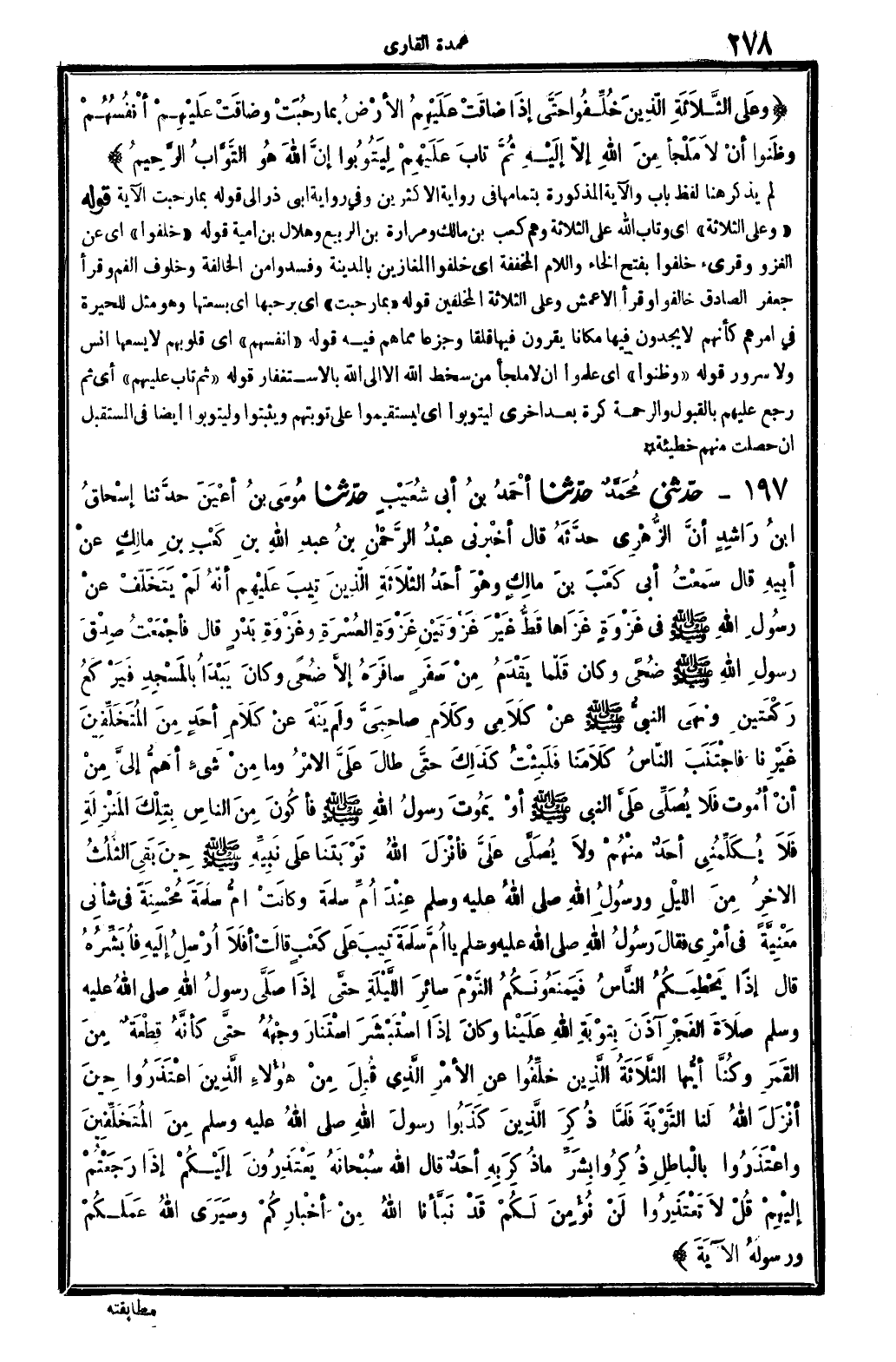 4677 - ح دَّثني مُحَمَّدٌ حدَّثنا أحْمَدُ بنُ أبِي شُعَيْبٍ حدَّثنا مُوسَى بنُ أعْيَنَ حدَّثنا إسْحَاقُ ابنُ رَاشِدٍ أنَّ الزُّهْرِي حدَّثَهُ قَالَ أخْبَرَنِي عَبْدُ الرَّحْمانِ بنُ عَبْدِ الله بنِ كَعْبٍ بنِ مَالِكٍ عَنْ أبِيهِ قَالَ سَمِعْتُ أبِي كَعْبَ بنَ مَالِكٍ وَهُوَ أحَدُ الثَّلاثَةِ الَّذِينَ تِيبَ عَلَيْهِمْ أنَّهُ لَمْ يَتَخَلَفْ عَنْ رَسُولِ الله صلى الله عَلَيْهِ وَسلم فِي غَزْوَةٍ غَزَاهَا قَطُّ غَيْرَ غَزْوَتَيْنِ غَزْوَةِ العُسْرَةِ وَغَزْوَةِ بَدْرٍ قَالَ فَأجْمَعْتُ صِدْقَ رَسِولِ الله صلى الله عَلَيْهِ وَسلم ضُحًى وَكَانَ قَلَمَا يَقْدَمُ مِنْ سَفَرٍ سَافَرَهُ إلاَّ ضُحًى وَكَانَ يَبْدَأُ بِالمَسْجِدِ فَيَرْكَعُ رَكْعَتَيْنِ وَنَهَى النبيُّ صلى الله عَلَيْهِ وَسلم عَنْ كَلاَمِي وَكَلامِ صَاحِبَيَّ وَلَمْ يَنْهَ عَنْ كَلامِ أحَدٍ مِنَ المُتَخَلِّفِينَ غَيْرنا فَاجْتَنَبَ النَّاسُ كَلامَنَا فَلَبْثْتُ كَذَلِكَ حَتَّى طالَ عَلَيَّ الأمْرُ وَمَا مِنْ شَيْءٍ أهَمُّ إلَيَّ مِنْ أنْ أمُوتَ فَلا يُصَلِّي عَلَيَّ النَّبِي صلى الله عَلَيْهِ وَسلم أوْ يَمُوتَ رَسُولُ الله صلى الله عَلَيْهِ وَسلم فَأكُونَ مِنَ النَّاسِ بِتِلْكَ المَنْزِلَةِ فَلا يُكَلِّمُنِي أحَدٌ مِنْهُمْ وَلا يُصَلِّي عَلَيَّ فَأنْزَلَ الله تَوْبَتَنَا عَلَى نِبِيِّهِ صلى الله عَلَيْهِ وَسلم حِينَ بَقِيَ الثُّلُثُ الآخِرُ مِنَ اللَّيْلِ وَرَسُولِ الله صلى الله عَلَيْهِ وَسلم عِنْدَ أُمِّ سَلَمَةِ وَكَانَتْ أُمُّ سَلَمَةَ مُحْسِنَةٍ فِي شأنِي مَعْنِيَّةً فِي أمْرِي فَقَالَ رَسُولُ الله صلى الله عَلَيْهِ وَسلم يَا أُمُّ سَلَمَةَ تِيبَ عَلَى كَعْبٍ قَالَتْ أفَلا أُرْسِلُ إلَيْهِ فَأُبَشِّرُهُ قَالَ إذَا يَحْطِمَكُمُ النَّاسُ فَيَمْنَعُونَكُمُ النَّوْمَ سَائِرَ اللَّيْلَةِ حَتَّى إذَا صَلَّى رَسُولُ الله صلى الله عَلَيْهِ وَسلم صَلاةَ الفَجْرِ آذَنَ بِتَوْبَةِ الله عَلَيْنَا وَكَانَ إذَا اسْتَبْشَرَ اسْتَنَارَ وَجْهُهُ حَتَّى كَأنَّهُ قِطْعَةٌ مِنَ القَمَرِ وَكُنَّا أيُّها الثَّلاثَةُ الَّذِينَ خُلِفُوا عَنِ الأمْرِ الَّذِي قُبِلَ مِنْ هاؤُلاءِ الَّذِينَ اعْتَذَرُوا حِينَ أنْزَلَ الله لَنَا التَّوْبَةَ فَلمَّا ذُكِرَ الَّذِينَ كَذَبُوا رَسُولَ الله صلى الله عَلَيْهِ وَسلم مِنَ المُتَخَلِّفِينَ وَاعْتَذَرُوا بِالْبَاطِلِ ذُكِرُوا بِشَرّ مَا ذُكِرَ بِهِ أحَدٌ قَالَ الله سُبْحَانَهُ: {يَعْتَذِرُونَ إلَيْكُمْ إذَا رَجَعْتُمْ إلَيْهِمْ قُلّ لَا تَعْتَذِرُوا لَنْ نُؤْمِنَ لَكُمْ قَدْ نَبَّأنا الله مِنْ أخْبَارِكُمْ وَسَيَرَى الله عَمَلَكُمْ وَرَسُولِهِ} (التَّوْبَة: 94) الآيَةَ.
