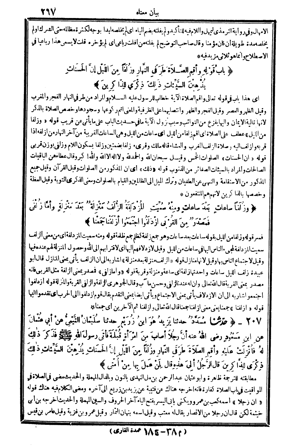 4687 - ح دَّثنا مُسَدَّدٌ حَدثنَا يَزِيدُ هُوَ ابنُ زُرَيْعٍ حَدثنَا سُلَيْمانُ التَّيْمِيُّ عنْ أبي عُثْمانَ عَن ابنِ مَسْعُودٍ رَضِي الله عَنهُ أنَّ رجُلاً أصابَ مِنَ امْرَأةٍ قُبْلَةً فأتَى رسولَ الله صلى الله عَلَيْهِ وَسلم فَذَكَرَ ذالِكَ لهُ فَأُنْزِلَتْ عَلَيْهِ: {وأقِمِ الصّلاَةَ طَرَقَي النّهارِ وزُلَفاً مِنَ اللّيْلِ إنَّ الحَسَناتِ يُذْهِبْنَ السَّيِّئاتِ ذالِكَ ذِكْرَى لِلذَّاكِرِينَ} قَالَ الرَّجُلُ ألِيَ هاذِهِ قَالَ لِمَنْ عَمِلَ بِها مِنْ أُمّتي. (انْظُر الحَدِيث 526) .