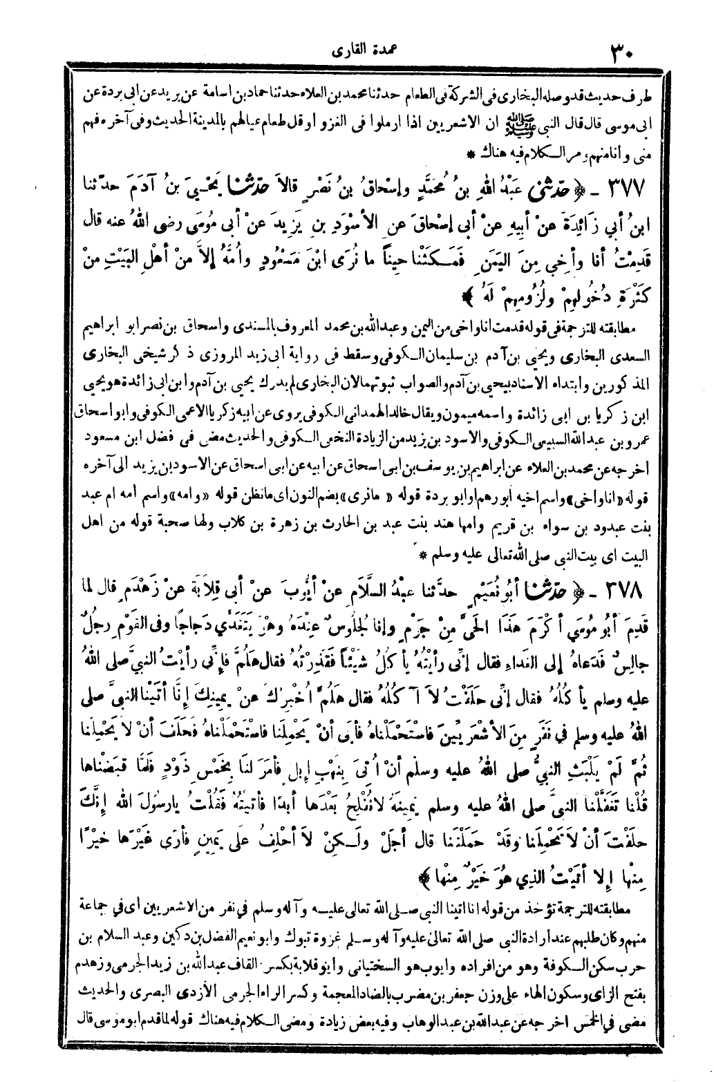 377 - (حَدثنِي عبد الله بن مُحَمَّد وَإِسْحَاق بن نصر قَالَا حَدثنَا يحيى بن آدم حَدثنَا ابْن أبي زَائِدَة عَن أَبِيه عَن أبي إِسْحَاق عَن الْأسود بن يزِيد عَن أبي مُوسَى رَضِي الله عَنهُ قَالَ قدمت أَنا وَأخي من الْيمن فَمَكثْنَا حينا مَا نرى ابْن مَسْعُود وَأمه إِلَّا من أهل الْبَيْت من كَثْرَة دخلوهم ولزومهم لَهُ) مطابقته للتَّرْجَمَة فِي قَوْله قدمت أَنا وَأخي من الْيمن وَعبد الله بن مُحَمَّد الْمَعْرُوف بالمسندي وَإِسْحَاق بن نصر أَبُو إِبْرَاهِيم السَّعْدِيّ البُخَارِيّ وَيحيى بن آدم بن سُلَيْمَان الْكُوفِي وَسقط فِي رِوَايَة أبي زيد الْمروزِي ذكر شَيْخي البُخَارِيّ الْمَذْكُورين وَابْتِدَاء الْإِسْنَاد بِيَحْيَى بن آدم وَالصَّوَاب ثبوتهما لِأَن البُخَارِيّ لم يدْرك يحيى بن آدم وَابْن أبي زَائِدَة هُوَ يحيى بن زَكَرِيَّا بن أبي زَائِدَة واسْمه مَيْمُون وَيُقَال خَالِد الْهَمدَانِي الْكُوفِي يروي عَن أَبِيه زَكَرِيَّا الْأَعْمَى الْكُوفِي وَأَبُو إِسْحَاق عَمْرو بن عبد الله السبيعِي الْكُوفِي وَالْأسود بن يزِيد من الزِّيَادَة النَّخعِيّ الْكُوفِي والْحَدِيث مضى فِي فضل ابْن مَسْعُود أخرجه عَن مُحَمَّد بن الْعَلَاء عَن إِبْرَاهِيم بن يُوسُف بن أبي إِسْحَاق عَن أَبِيه عَن أبي إِسْحَاق عَن الْأسود بن يزِيد إِلَى آخِره قَوْله " أَنا وَأخي " وَاسم أَخِيه أَبُو رهم أَو أَبُو بردة قَوْله " مَا نرى " بِضَم النُّون أَي مَا نظن قَوْله " وَأمه " وَاسم أمه أم عبد الله بنت عبدود بن سَوَاء بن قريم وَأمّهَا هِنْد بنت عبد بن الْحَارِث بن زهرَة بن كلاب وَلها صُحْبَة قَوْله من أهل الْبَيْت أَي بَيت النَّبِي - صَلَّى اللَّهُ عَلَيْهِ وَسَلَّم َ -