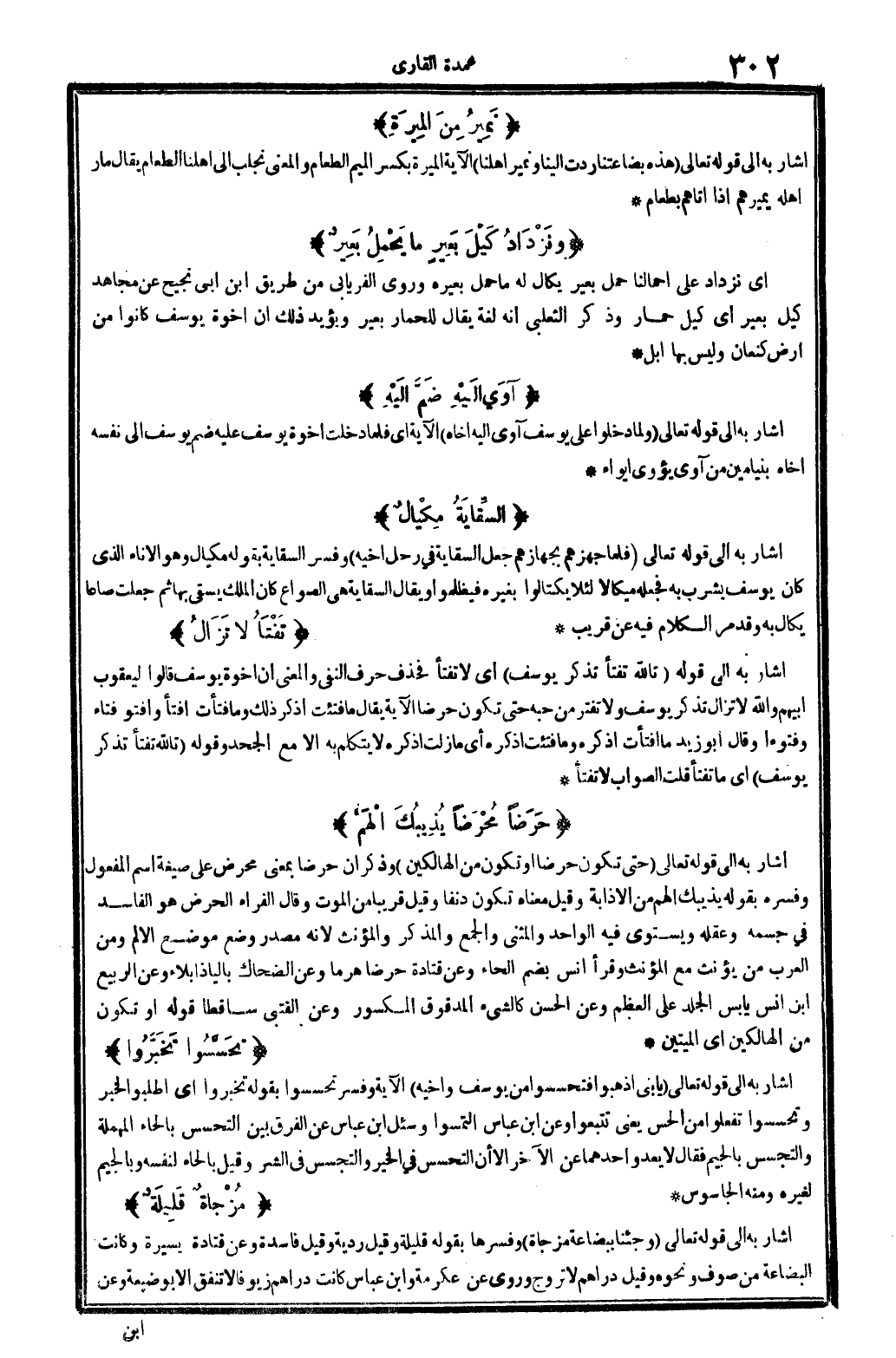 أَشَارَ بِهِ إِلَى قَوْله تَعَالَى: {هَذِه بضاعتنا ردَّتْ إِلَيْنَا ونمير أهلنا} (يُوسُف: 6) الْميرَة بِكَسْر الْمِيم الطَّعَام، وَالْمعْنَى: نجلب إِلَى أهلنا الطَّعَام يُقَال: مار أَهله يميرهم إِذا أَتَاهُم بِطَعَام.