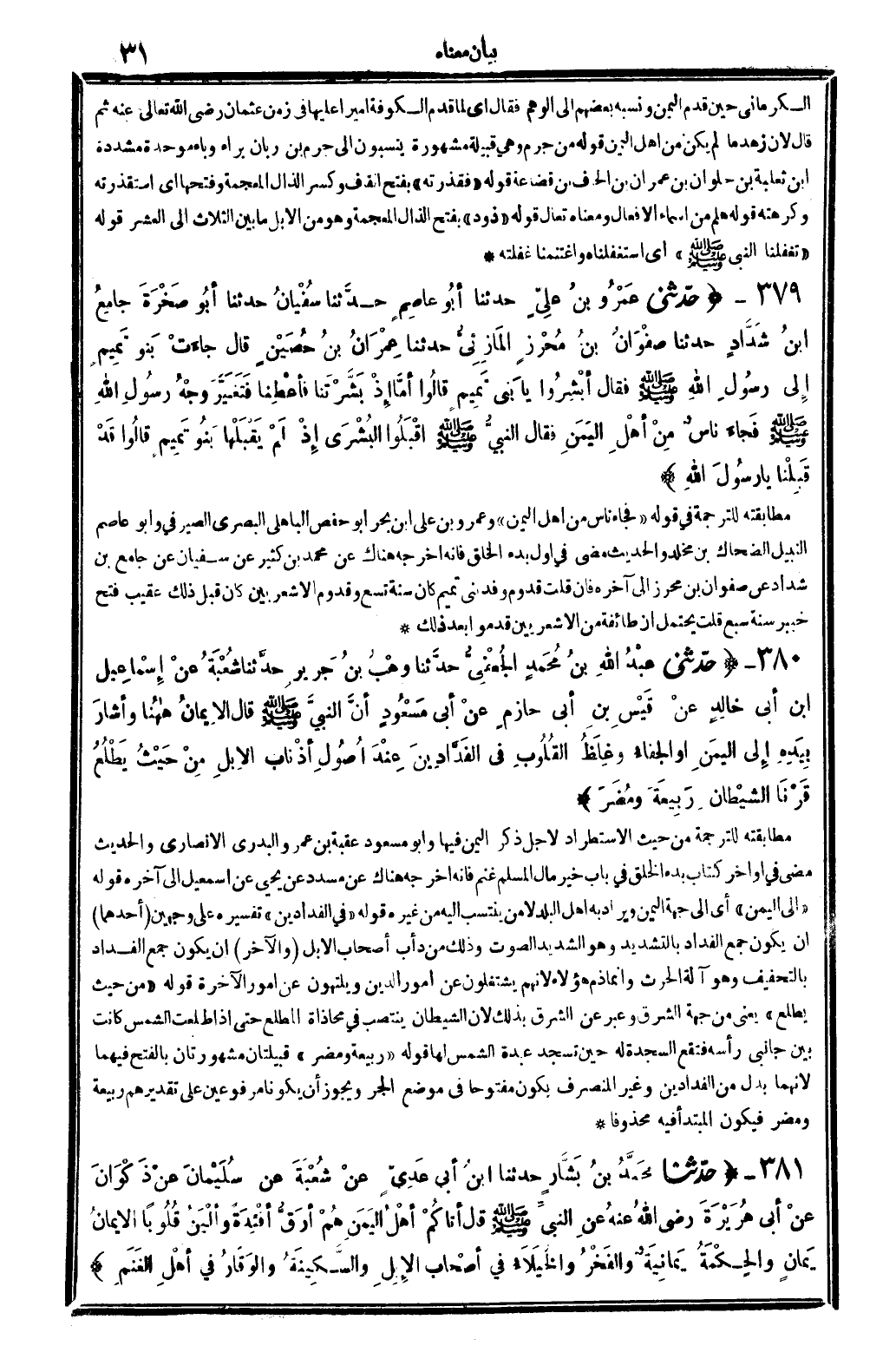 380 - (حَدثنِي عبد الله بن مُحَمَّد الْجعْفِيّ حَدثنَا وهب بن جرير حَدثنَا شُعْبَة عَن إِسْمَاعِيل ابْن أبي خَالِد عَن قيس بن أبي حَازِم عَن أبي مَسْعُود أَن النَّبِي - صَلَّى اللَّهُ عَلَيْهِ وَسَلَّم َ - قَالَ الْإِيمَان هَهُنَا وَأَشَارَ بِيَدِهِ إِلَى الْيمن أَو الْجفَاء وَغلظ الْقُلُوب فِي الْفَدادِين عِنْد أصُول أَذْنَاب الْإِبِل من حَيْثُ يطلع قرنا الشَّيْطَان ربيعَة وَمُضر) مطابقته للتَّرْجَمَة من حَيْثُ الاستطراد لأجل ذكر الْيمن فِيهَا وَأَبُو مَسْعُود عقبَة بن عَمْرو البدري الْأنْصَارِيّ والْحَدِيث مضى فِي أَوَاخِر كتاب بَدْء الْخلق فِي بَاب خير مَال الْمُسلم غنم فَإِنَّهُ أخرجه هُنَاكَ عَن مُسَدّد عَن يحيى عَن إِسْمَعِيل إِلَى آخِره قَوْله " إِلَى الْيمن " أَي إِلَى جِهَة الْيمن وَيُرَاد بِهِ أهل الْبَلَد لَا من ينتسب إِلَيْهِ من غَيره قَوْله " فِي الْفَدادِين " تَفْسِيره على وَجْهَيْن (أَحدهمَا) أَن يكون جمع الفداد بِالتَّشْدِيدِ وَهُوَ الشَّديد الصَّوْت وَذَلِكَ من دأب أَصْحَاب الْإِبِل (وَالْآخر) أَن يكون جمع الفداد بِالتَّخْفِيفِ وَهُوَ آلَة الْحَرْث وَإِنَّمَا ذمّ هَؤُلَاءِ لأَنهم يشتغلون عَن أُمُور الدّين ويلتهون عَن أُمُور الْآخِرَة قَوْله " من حَيْثُ يطلع " يَعْنِي من جِهَة الشرق وَعبر عَن الشرق بذلك لِأَن الشَّيْطَان ينْتَصب فِي محاذاة المطلع حَتَّى إِذا طلعت الشَّمْس كَانَت بَين جَانِبي رَأسه فَتَقَع السَّجْدَة لَهُ حِين تسْجد عَبدة الشَّمْس لَهَا قَوْله " ربيعَة وَمُضر " قبيلتان مشهورتان بِالْفَتْح فيهمَا لِأَنَّهُمَا بدل من الْفَدادِين وَغير المنصرف يكون مَفْتُوحًا فِي مَوضِع الْجَرّ وَيجوز أَن يَكُونَا مرفوعين على تقديرهم ربيعَة وَمُضر فَيكون الْمُبْتَدَأ فِيهِ محذوفا