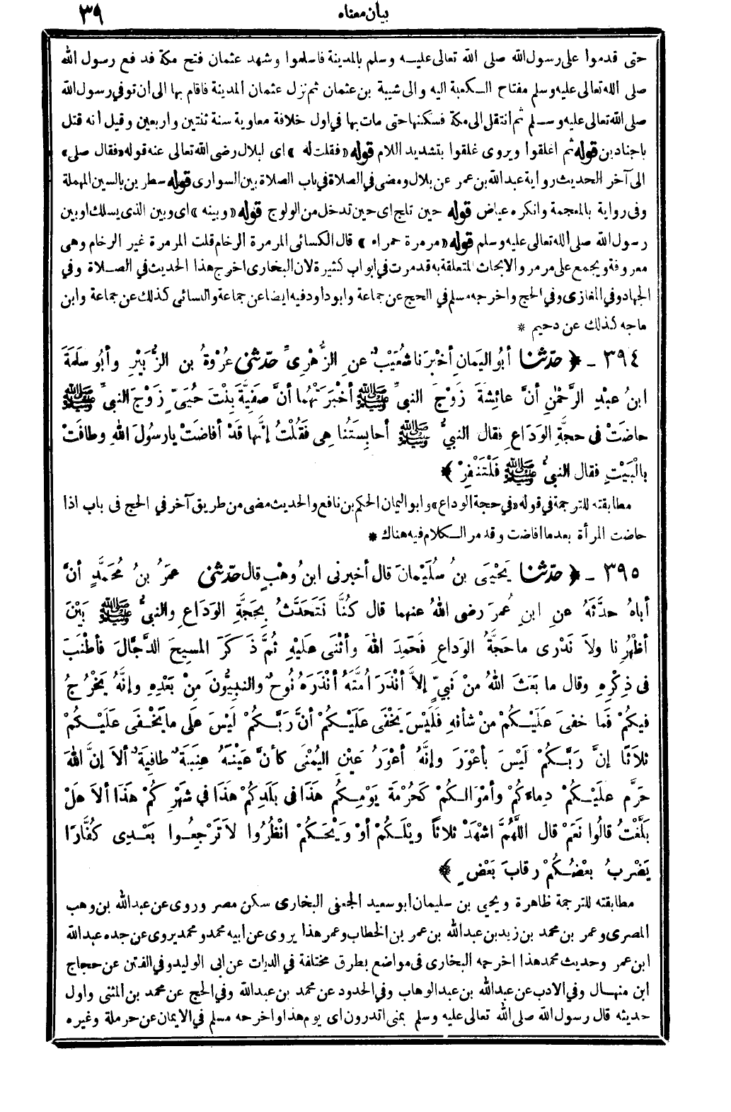 4402 - ح دّثنا يَحْيَى بنُ سُلَيْمانَ قَالَ أَخْبرنِي ابنُ هْبٍ قَالَ حدّثني عمَرُ بنُ مِحَمَّدٍ أنَّ أباهُ حدَّثَهُ عنِ ابنِ عُمرَ رَضِي الله عَنْهُمَا قَالَ كُنَّا نَتَحَدَّثُ بِحَجَّةِ الوَدَاعِ والنبيُّ صلى الله عَلَيْهِ وَسلم بَيْنَ أظْهُرِنا ولاَ نَدْري مَا حَجَّةُ الوَداعِ فَحَمِدَ الله وأثْنَى عَلَيْهِ ثُمَّ ذَكَرَ المسِيحَ الدَّجَّالَ فأطْنَبَ فِي ذِكْرِهِ وَقَالَ مَا بَعَثَ الله منْ نَبِيٍّ إلاَّ أنْذَرَ أُمَّتَهُ أنْذَرَهُ نُوحٌ النبيِيُّونَ مِنْ بَعْدِهِ وإنَّهُ يَخْرُجُ فيكُمْ فَمَا خَفى عَلَيْكُمْ منْ شأنهِ فَلَيْسَ يَخْفَى عَلَيْكُمْ أنَّ رَبَّكُمْ لَيْسَ عَلَى مَا يَخْفَى عَلَيْكُمْ ثلاَثاً إنَّ رَبَّكُمْ لَيْسَ بأعْوَرَ وإنَّهُ أعْوَرُ عَيْنِ اليُمْنَى كأنَّ عَيْنَهُ عِنَبَةٌ طافِيَةٌ. ألاَ إنَّ الله حَرَّم عَلَيْكُمْ دِماءَكُمْ وأمْوَالَكُمْ كَحُرْمَة يَوْمِكُم هَذَا فِي بَلَدِكُمْ هَذَا فِي شَهْرِكُمْ هَذَا ألاَ هَلْ بَلَّغْتُ قالُوا نَعَمْ قَالَ اللَّهُمَّ اشْهَدُ ثَلَاثًا ويْلَكُمْ أوْ وَيْحَكُمْ انْظُرُوا لاَ تَرْجِعُوا بَعْدِي كُفَّاراً يَضْرِبُ بَعْضُكُمْ رقابَ بَعْضٍ. .