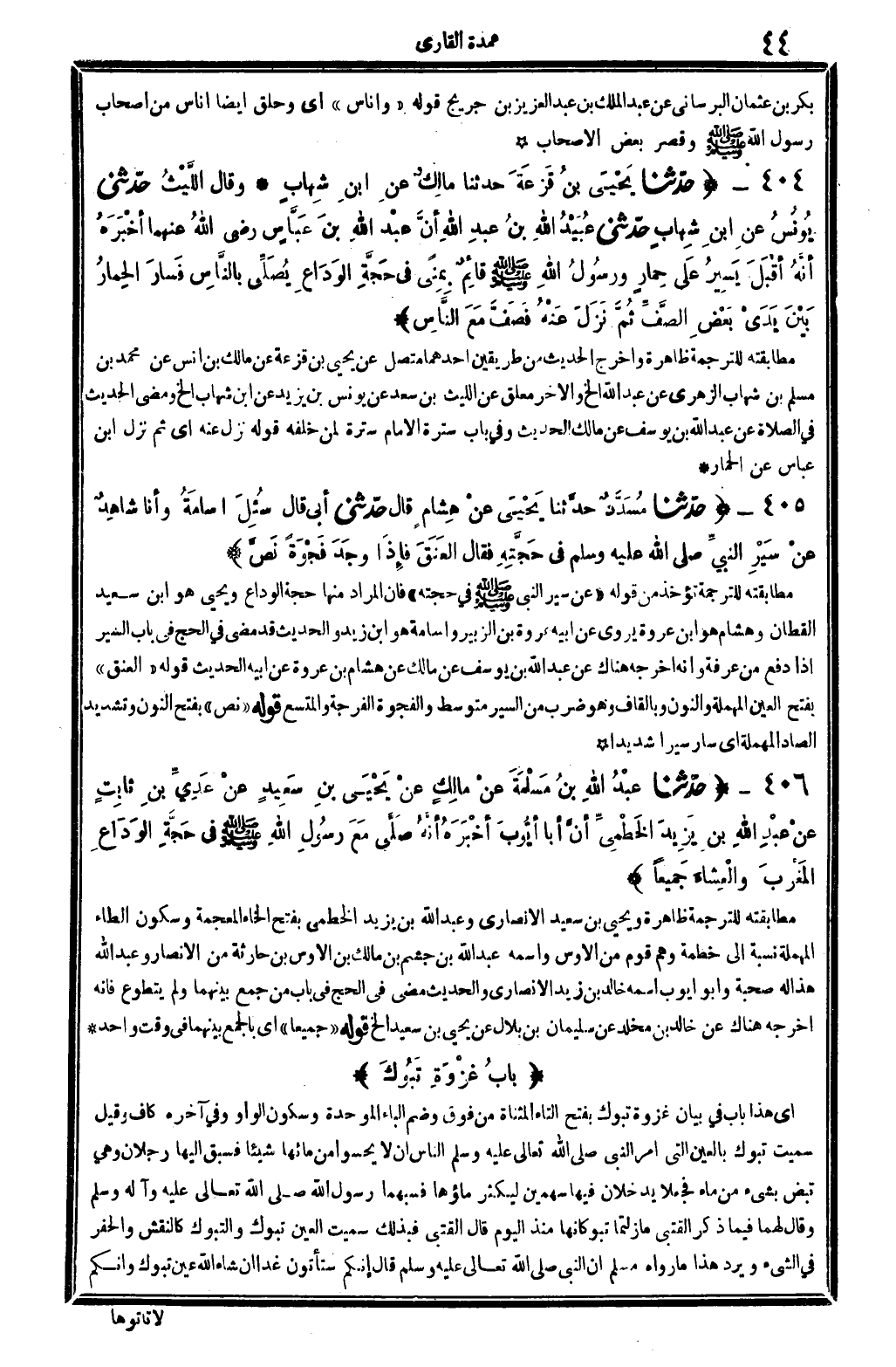 4412 - ح دّثنا يَحْيَى بنُ قَزعَةَ حَدثنَا مالِكٌ عنِ ابنِ شِهابٍ. وَقَالَ اللَّيْثُ حدّثني يُونُسُ عنِ ابنِ شِهابٍ حدّثني عُبَيْدُ الله بنُ عبدِ الله أنَّ عبْد الله بنَ عَبَّاسٍ رَضِي الله عَنْهُمَا أخْبَرَهُ أنَّهُ أقْبَلَ يَسِيرُ عَلى حِمارٍ ورسُولُ الله صلى الله عَلَيْهِ وَسلم قائِمٌ بِمِنًى فِي حَجَّةِ الوَدَاعِ يُصَلِّي بالنَّاسِ فَسارَ الحِمارُ بَيْنَ يَدَيْ بَعْضِ الصَّفِّ ثُمَّ نَزَلَ عَنْهُ فَصَفَّ مَعَ النَّاسِ. .
