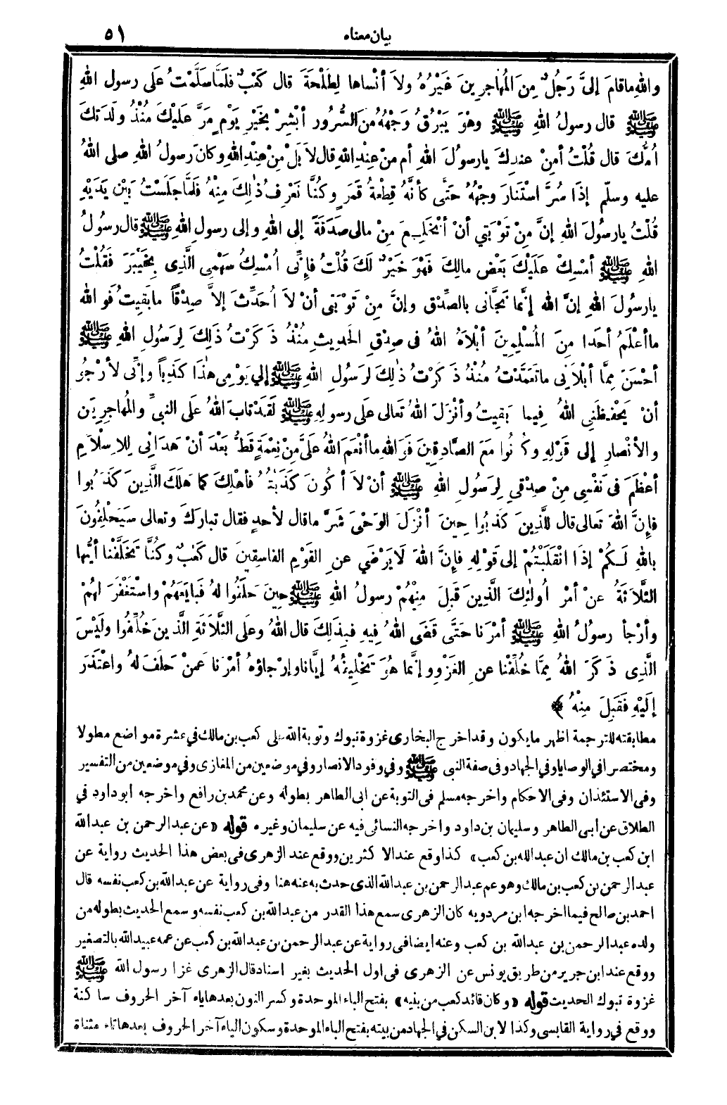 وَالله مَا قامَ إليَّ رَجُلٌ مِنَ المُهاجِرِينَ غَيْرُهُ ولاَ أنْساها لِطَلْحَةَ قَالَ كَعْبٌ فَلَمَّا سَلَّمْتُ عَلى رَسُول الله صلى الله عَلَيْهِ وَسلم قَالَ رسولُ الله صلى الله عَلَيْهِ وَسلم وهُوَ يَبْرُقُ وَجْهُهُ مِنَ السُّرُور أبْشِرْ بخَيْرِ يَوْمٍ مَرَّ عَليْكَ مُنْذُ وَلَدَتَكَ أُمُّكَ قَالَ قُلْتُ أمِنْ عندِكَ يَا رسولُ الله أم منْ عِنْدِ الله قَالَ لاَ بَلْ مِنْ عِنْدِ الله وكانَ رسولُ الله صلى الله عَلَيْهِ وَسلم إذَا سُرَّ اسْتَنارَ وَجْهُهُ حَتَّى كأنَّهُ قِطْعَةُ قَمَرٍ وكُنَّا نَعْرِفُ ذالِكَ مِنْهُ فَلَمَّا جَلَسْتُ بَيْن يَدَيْهِ قُلْتُ يَا رسُولَ الله إنَّ مِنْ تَوْبَتي أنْ أنخَلِعَ مِنْ مَالِي صَدَقَةً إِلَى الله وَإِلَى رسولِ الله صلى الله عَلَيْهِ وَسلم قَالَ رسُولُ الله صلى الله عَلَيْهِ وَسلم أمْسِكْ عَلَيْكَ بَعْض مالِكَ فَهْوَ خَيْرٌ لَكَ قُلْتُ فإنِّي أُمْسِكُ سَهْمِي الَّذِي بِخَيْبَرَ فَقُلْتُ يَا رسُولَ الله إنَّ الله إنَّما نَجَّاني بالصِّدْق وإنَّ مِنْ تَوْبَتي أنْ لاَ أُحَدِّثَ إلاَّ صِدْقاً مَا بَقِيتُ فوَاللَّه مَا أعْلَمُ أحَداً مِنَ المُسْلِمِينَ أبْلاَهُ الله فِي صِدْقِ الحَدِيثِ مُنْذُ ذَكَرْتُ ذَلِكَ لِرَسُولِ الله صلى الله عَلَيْهِ وَسلم أحْسَنَ مِمَّا أبْلاَنِي مَا تَعَمَّدْتُ مُنْذُ ذَكَرْتُ ذالِكَ لرَسُولِ الله صلى الله عَلَيْهِ وَسلم إِلَيّ يَوْمِي هاذَا كَذِباً وإنِّي لأرْجُو أنْ يَحْفظَنِي الله فِيما بَقِيتُ وأنْزَلَ الله تَعالى على رسولِهِ صلى الله عَلَيْهِ وَسلم لَقَدْ تابَ الله عَلى النبيِّ والمُهاجِرِينَ والأنْصارِ إِلَى قَوْلِهِ وكانُوا مَعَ الصَّادِقِينَ فَوَالله مَا أنْعَمَ الله عَلَيَّ مِنْ نِعْمَةٍ قَطُّ بَعْدَ أنْ هَدَانِي لِلإسْلاَمِ أعْظَمَ فِي نَفْسِي مِنْ صِدْقِي لِرَسُولِ الله صلى الله عَلَيْهِ وَسلم أنْ لاَ أكُونَ كَذَبْتُهُ فأهْلِكَ كمَا هَلَكَ الَّذِينَ كَذَبُوا فإنَّ الله تَعالى قَالَ للَّذِينَ كَذَبُوا حِينَ أنْزَلَ الوَحْيَ شَرَّ مَا قَالَ لأحدٍ فَقَالَ تبارَكَ وَتَعَالَى سَيَحْلِفُونَ بِاللَّه لَكُمْ إِذا انْقَلَبْتُمْ إِلَى قَوْلِهِ فإنَّ الله لاَ يَرْضَي عنِ القَوْمِ الفاسقِينَ قَالَ كَعْبٌ وكُنَّ تَخَلَّفْنا أيُّها الثَّلاثَةُ عنْ أمْر أُولائِكَ الَّذِينَ قَبِلَ مِنْهُمْ رسولُ الله صلى الله عَلَيْهِ وَسلم حِينَ حَلَفُوا لهُ فبايَعَهُمْ واسْتَغْفَرَ لهُمْ وأرْجأ رسُولُ الله صلى الله عَلَيْهِ وَسلم أمْرَنا حَتَّى قَضَى الله فِيهِ فَبِذَلِكَ قَالَ الله وعَلى الثَّلاثَةِ الَّذِينَ خَلِّفُوا ولَيْسَ الَّذِي ذَكَرَ الله مِمَّا خُلِّفْنا عنِ الغَزْوِ وإنَّما تَخْلِيفُهُ إيَّانا وإرْجاؤهُ أمْرَنَا عَمنْ حَلَفَ لهُ واعْتَذَرَ إلَيْهِ فَقَبِلَ مِنْهُ. .