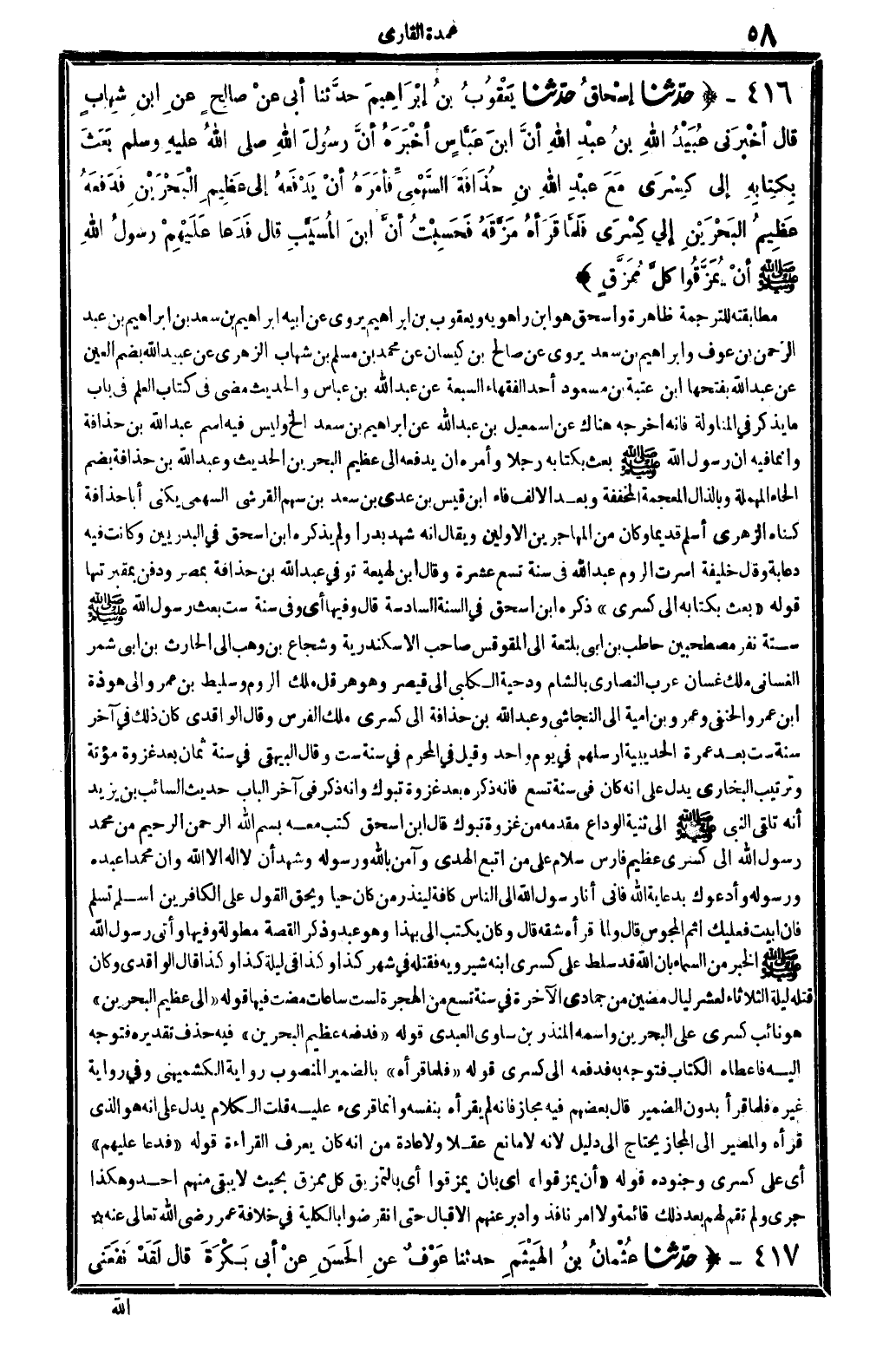 4424 - ح دَّثنا إسْحاقُ حدّثنا يَعْقُوبُ بنُ إبْرَاهِيمَ حدَّثنا أبي عنْ صالِحٍ عَن ابنِ شِهابٍ قَالَ أخْبَرَني عُبَيْدُ الله بنُ عَبْدِ الله أنَّ ابنَ عَبَّاسٍ أخْبَرَهُ أنَّ رسُولَ الله صلى الله عَلَيْهِ وَسلم بَعَثَ بِكِتابِهِ إِلَى كِسْرَى مَعَ عَبْدِ الله بنِ حُذَافَةَ السَّهْمِيِّ فأمَرَهُ أنْ يَدْفَعَهُ إِلَى عَظِيمِ الْبَحْرَيْنِ فَدَفَعَهُ عَظِيمُ البَحْرَيْنِ إِلَى كِسْرَى فَلَمَّا قَرَأهُ مَزَّقَهُ فَحَسِبْتُ أنَّ ابنَ المُسَيَّبِ قَالَ فَدَعا عَلَيْهِمْ رسولُ الله صلى الله عَلَيْهِ وَسلم أنْ يُمَزَّقُوا كلَّ مُمَزَّقٍ. .