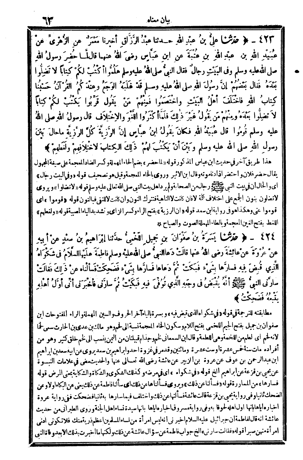 4432 - حدّثنا عليُّ بنُ عَبْدِ الله حَدثنَا عبْدُ الرَّزَّاقِ أخبرنَا مَعْمَرٌ عنِ الزُّهْرِيِّ عنْ عُبَيْدِ الله بن عبْدِ الله بنِ عُتْبَةَ عنِ ابنِ عَبَّاسٍ رضيَ الله عَنْهُمَا قَالَ لمَّا حُضِرَ رَسولُ الله صلى الله عَلَيْهِ وَسلم وَفِي البَيْتِ رجالٌ فَقَالَ النبيُّ صلى الله عَلَيْهِ وَسلم هَلُمُّوا أكْتُبْ لَكُمْ كِتاباً لَا تَضِلُّوا بَعْدَهُ فَقال بَعْضُهُمُ إنَّ رَسُولِ الله صلى الله عَلَيْهِ وَسلم قَدْ غَلَبَهُ الوَجَعُ وعِنْدَكُمُ القُرْآنُ حَسْبُنا كِتابُ الله فاخْتَلَفَ أهْلُ البَيْتِ واخْتَصَمُوا فَمِنْهُمْ مَنْ يَقُول قَرِّبُوا يَكْتُبْ لَكُمْ كِتاباً لاَ تضِلُّوا بَعْدَهُ ومِنْهُمْ مَن يَقُولُ غَيْرَ ذالِكَ فَلَمَّا أكْثَرُوا اللَّغْوَ وَالإخْتِلاَف قَالَ رسولُ الله صلى الله عَلَيْهِ وَسلم قُومُوا قَالَ عُبَيْدُ الله فكانَ يَقُولُ ابنُ عبَّاسٍ إنَّ الرَّزِيَّةَ كُلَّ الرَّزِيَّةِ مَا حالَ بَيْنَ رسولِ الله صلى الله عَلَيْهِ وَسلم وبَيْنَ أنْ يَكْتُبَ لَهُمْ ذالِكَ الكِتابَ لاخْتِلاَفِهِمْ ولَغَطهِمْ. .
