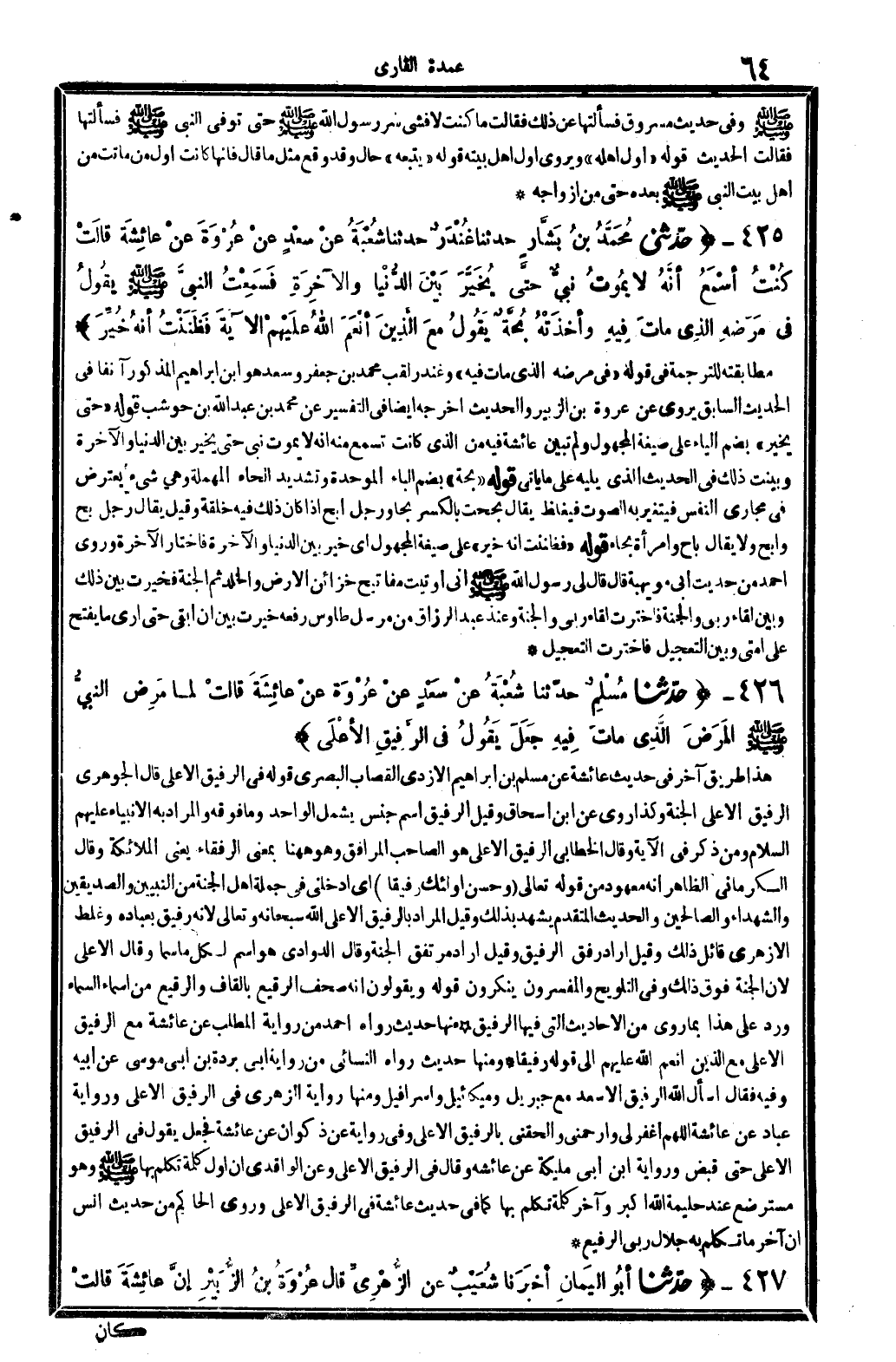 426 - (حَدثنَا مُسلم حَدثنَا شُعْبَة عَن سعد عَن عُرْوَة عَن عَائِشَة قَالَت لما مرض النَّبِي - صَلَّى اللَّهُ عَلَيْهِ وَسَلَّم َ - الْمَرَض الَّذِي مَاتَ فِيهِ جعل يَقُول فِي الرفيق الْأَعْلَى) هَذَا طَرِيق آخر فِي حَدِيث عَائِشَة عَن مُسلم بن إِبْرَاهِيم الْأَزْدِيّ القصاب الْبَصْرِيّ قَوْله فِي الرفيق الْأَعْلَى قَالَ الْجَوْهَرِي الرفيق الْأَعْلَى الْجنَّة وَكَذَا رُوِيَ عَن ابْن إِسْحَاق وَقيل الرفيق اسْم جنس يَشْمَل الْوَاحِد وَمَا فَوْقه وَالْمرَاد بِهِ الْأَنْبِيَاء عَلَيْهِم السَّلَام وَمن ذكر فِي الْآيَة وَقَالَ الْخطابِيّ الرفيق الْأَعْلَى هُوَ الصاحب الْمرَافِق وَهُوَ هَهُنَا بِمَعْنى الرفقاء يَعْنِي الْمَلَائِكَة وَقَالَ الْكرْمَانِي الظَّاهِر أَنه مَعْهُود من قَوْله تَعَالَى {وَحسن أُولَئِكَ رَفِيقًا} أَي أدخلني فِي جملَة أهل الْجنَّة من النَّبِيين وَالصديقين وَالشُّهَدَاء وَالصَّالِحِينَ والْحَدِيث الْمُتَقَدّم يشْهد بذلك وَقيل المُرَاد بالرفيق الْأَعْلَى الله سُبْحَانَهُ وَتَعَالَى لِأَنَّهُ رَفِيق بعباده وَغلط الْأَزْهَرِي قَائِل ذَلِك وَقيل أَرَادَ رفق الرفيق وَقيل أَرَادَ مرتفق الْجنَّة وَقَالَ الدَّاودِيّ هُوَ اسْم لكل مَا سما وَقَالَ الْأَعْلَى لِأَن الْجنَّة فَوق ذَلِك وَفِي التَّلْوِيح والمفسرون يُنكرُونَ قَوْله وَيَقُولُونَ إِنَّه صحف الرقيع بِالْقَافِ والرقيع من أَسمَاء السَّمَاء ورد على هَذَا بِمَا رُوِيَ من الْأَحَادِيث الَّتِي فِيهَا الرفيق مِنْهَا حَدِيث رَوَاهُ أَحْمد من رِوَايَة الْمطلب عَن عَائِشَة مَعَ الرفيق الْأَعْلَى مَعَ الَّذين أنعم الله عَلَيْهِم إِلَى قَوْله رَفِيقًا وَمِنْهَا حَدِيث رَوَاهُ النَّسَائِيّ من رِوَايَة أبي بردة بن أبي مُوسَى عَن أَبِيه وَفِيه فَقَالَ أسأَل الله الرفيق الأسعد مَعَ جِبْرِيل وَمِيكَائِيل وإسرافيل وَمِنْهَا رِوَايَة الزُّهْرِيّ فِي الرفيق الْأَعْلَى وَرِوَايَة عباد عَن عَائِشَة اللَّهُمَّ اغْفِر لي وارحمني وألحقني بالرفيق الْأَعْلَى وَفِي رِوَايَة عَن ذكْوَان عَن عَائِشَة فَجعل يَقُول فِي الرفيق الْأَعْلَى حَتَّى قبض وَرِوَايَة ابْن أبي مليكَة عَن عَائِشَة وَقَالَ فِي الرفيق الْأَعْلَى وَعَن الْوَاقِدِيّ إِن أول كلمة تكلم بهَا - صَلَّى اللَّهُ عَلَيْهِ وَسَلَّم َ - وَهُوَ مسترضع عِنْد حليمة الله أكبر وَآخر كلمة تكلم بهَا كَمَا فِي حَدِيث عَائِشَة فِي الرفيق الْأَعْلَى وروى الْحَاكِم من حَدِيث أنس أَن آخر مَا تكلم بِهِ جلال رَبِّي الرفيع