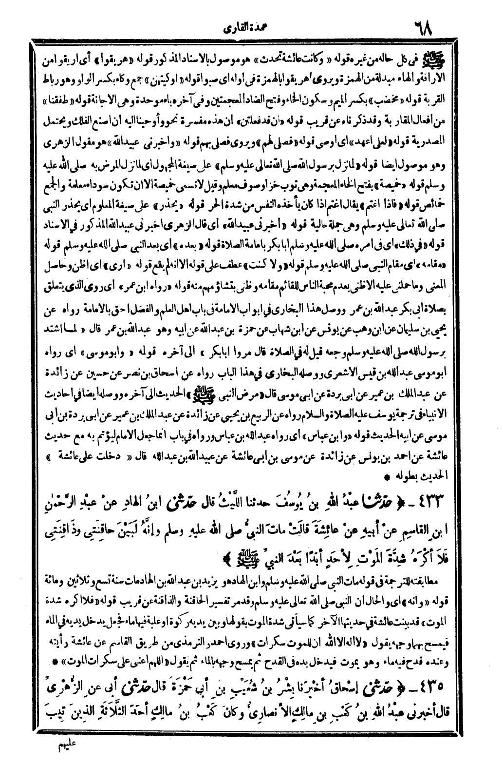 - صَلَّى اللَّهُ عَلَيْهِ وَسَلَّم َ - فِي كل حَاله من غَيره قَوْله " وَكَانَت عَائِشَة تحدث " هُوَ مَوْصُول بِالْإِسْنَادِ الْمَذْكُور قَوْله " هريقوا " أَي أريقوا من الإراقة وَالْهَاء مبدلة من الْهمزَة ويروى أهريقوا بِالْهَمْزَةِ فِي أَوله أَي صبوا قَوْله " أوكيتهن " جمع وكاء بِكَسْر الْوَاو وَهُوَ رِبَاط الْقرْبَة قَوْله " مخضب " بِكَسْر الْمِيم وَسُكُون الْخَاء وَفتح الضَّاد المعجمتين وَفِي آخِره بَاء مُوَحدَة وَهِي الاجانة قَوْله " طفقنا " من أَفعَال المقاربة وَقد ذَكرْنَاهُ عَن قريب قَوْله " أَن قد فعلتن " أَن هَذِه مفسرة نَحْو وأوحينا إِلَيْهِ أَن اصْنَع الْفلك وَيحْتَمل المصدرية قَوْله " لعَلي أَعهد " أَي أوصِي قَوْله " فصلى لَهُم " ويروى فصلى بهم قَوْله " وَأَخْبرنِي عبيد الله " هُوَ مقول الزُّهْرِيّ وَهُوَ مَوْصُول أَيْضا قَوْله " لما نزل برَسُول الله - صَلَّى اللَّهُ عَلَيْهِ وَسَلَّم َ - " على صِيغَة الْمَجْهُول أَي لما نزل الْمَرَض بِهِ - صَلَّى اللَّهُ عَلَيْهِ وَسَلَّم َ - قَوْله " خميصة " بِفَتْح الْخَاء الْمُعْجَمَة وَهِي ثوب خَز أَو صوف معلم وَقيل لَا تسمى خميصة إِلَّا أَن تكون سَوْدَاء معلمة وَالْجمع خمائص قَوْله " فَإِذا اغتم " يُقَال اغتم إِذا كَانَ يَأْخُذهُ النَّفس من شدَّة الْحر قَوْله " يحذر " على صِيغَة الْمَعْلُوم أَي يحذر النَّبِي - صَلَّى اللَّهُ عَلَيْهِ وَسَلَّم َ - وَهِي جملَة حَالية قَوْله " أَخْبرنِي عبيد الله " أَي قَالَ الزُّهْرِيّ أَخْبرنِي عبيد الله الْمَذْكُور فِي الْإِسْنَاد قَوْله " فِي ذَلِك " أَي فِي أمره - صَلَّى اللَّهُ عَلَيْهِ وَسَلَّم َ - أَبَا بكر بإمامة الصَّلَاة قَوْله " بعده " أَي بعد النَّبِي - صَلَّى اللَّهُ عَلَيْهِ وَسَلَّم َ - قَوْله " مقَامه " أَي مقَام النَّبِي - صَلَّى اللَّهُ عَلَيْهِ وَسَلَّم َ - قَوْله " وَلَا كنت " عطف على قَوْله إِلَّا أَنه لم يَقع قَوْله " أرى " أَي أَظن وَحَاصِل الْمَعْنى وَمَا حَملَنِي عَلَيْهِ إِلَّا ظَنِّي بِعَدَمِ محبَّة النَّاس للقائم مقَامه وظني بتشاؤمهم مِنْهُ قَوْله " رَوَاهُ ابْن عمر " أَي روى الَّذِي يتَعَلَّق بِصَلَاة أبي بكر عبد الله بن عمر وَوصل هَذَا البُخَارِيّ فِي أَبْوَاب الْإِمَامَة فِي بَاب أهل الْعلم وَالْفضل أَحَق بِالْإِمَامَةِ رَوَاهُ عَن يحيى بن سُلَيْمَان عَن ابْن وهب عَن يُونُس عَن ابْن شهَاب عَن حَمْزَة بن عبد الله عَن أَبِيه وَهُوَ عبد الله بن عمر قَالَ " لما اشْتَدَّ برَسُول الله - صَلَّى اللَّهُ عَلَيْهِ وَسَلَّم َ - وَجَعه قيل لَهُ فِي الصَّلَاة قَالَ مروا أَبَا بكر " إِلَى آخِره قَوْله " وَأَبُو مُوسَى " أَي رَوَاهُ أَبُو مُوسَى عبد الله بن قيس الْأَشْعَرِيّ وَوَصله البُخَارِيّ فِي هَذَا الْبَاب رَوَاهُ عَن إِسْحَاق بن نصر عَن حُسَيْن عَن زَائِدَة عَن عبد الْملك بن عُمَيْر عَن أبي بردة عَن أبي مُوسَى قَالَ " مرض النَّبِي - صَلَّى اللَّهُ عَلَيْهِ وَسَلَّم َ - " الحَدِيث إِلَى آخِره وَوَصله أَيْضا فِي أَحَادِيث الْأَنْبِيَاء فِي تَرْجَمَة يُوسُف عَلَيْهِ الصَّلَاة وَالسَّلَام رَوَاهُ عَن الرّبيع بن يحيى عَن زَائِدَة عَن عبد الْملك بن عُمَيْر عَن أبي بردة بن أبي مُوسَى عَن أَبِيه الحَدِيث قَوْله " وَابْن عَبَّاس " أَي رَوَاهُ عبد الله بن عَبَّاس وَرَوَاهُ فِي بَاب إِنَّمَا جعل الإِمَام ليؤتم بِهِ مَعَ حَدِيث عَائِشَة عَن أَحْمد بن يُونُس عَن زَائِدَة عَن مُوسَى بن أبي عَائِشَة عَن عبيد الله بن عبد الله قَالَ " دخلت على عَائِشَة " الحَدِيث بِطُولِهِ -