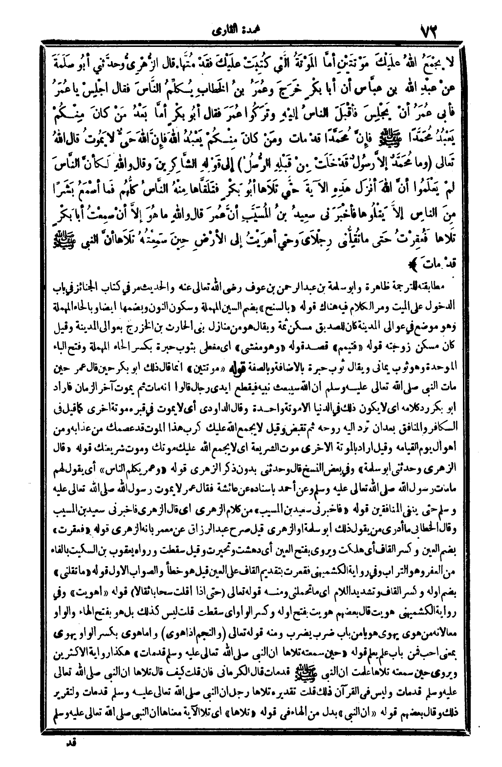 لَا يجْمَعُ الله عَلَيْكَ مَوْتَتَيْنِ أمَّا المَوْتَةُ الَّتي كُتِبَتْ عَلَيْكَ فَقَدْ مُتَّها. قَالَ الزُّهْرِيُّ وحدَّثني أبُو سَلَمَةَ عنْ عَبْدِ الله بن عبَّاس أَن أَبَا بكْرٍ خَرَجَ وعُمَرُ بنُ الخَطابِ يُكلِّمُ النَّاسَ فَقَالَ اجْلِسْ يَا عُمَرُ فَأبى عُمَرُ أنْ يَجْلِسَ فأقْبَلَ الناسُ إلَيْهِ وتَرَكُوا عُمَرَ فَقَالَ أبُو بَكْرٍ أمَّا بَعْدُ مَنْ كانَ مِنْكُمْ يَعْبُدُ مُحَمَّداً صلى الله عَلَيْهِ وَسلم فإِنَّ مُحَمَّداً قدْ مَاتَ ومَنْ كانَ مِنْكُمْ يَعْبُدُ الله فَإِنَّ الله حَيٌّ لَا يَمُوتُ قَالَ الله تَعالى: {وَمَا مُحَمَّدٌ إلاَّ رسُولٌ قَدْ خَلَتْ مِنْ قَبْلِهِ الرُّسُلُ} إِلَى قَوْلِهِ: {الشَّاكِرِينَ} (آل عمرَان: 144) وَقَالَ وَالله لَكأنَّ النَّاسَ لمْ يَعْلَمُوا أنَّ الله أنْزَلَ هاذِهِ الآيَةَ حَتَّى تَلاَها أبُو بَكْرٍ فَتَلَقَّاها مِنْهُ النَّاسُ كُلَّهُم فَما أسْمَعُ بَشَراً مِنَ الناسِ إلاَّ يَتْلُوها فأخْبَرَنِي سَهيدُ بنُ المُسَيَّبِ أنَّ عُمَرَ قَالَ وَالله مَا هُوَ إلاَّ أنْ سمِعْتُ أَبَا بَكْرٍ تَلاها فَعُقِرْتُ حَتَّى مَا تُقِلُّنِي رِجْلاَيَ وَحَتَّى أهوَيْتُ إِلَى الأرْضِ حِينَ سَمِعْتُهُ تَلاَها أنَّ النَّبِي صلى الله عَلَيْهِ وَسلم قدْ ماتَ. .