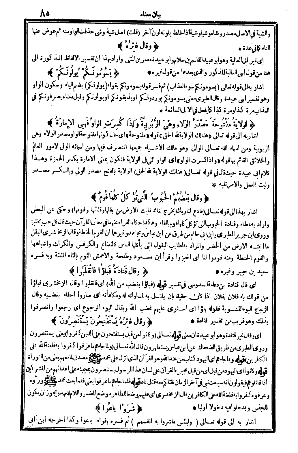 أَي: قَالَ قَتَادَة بن دعامة السدُوسِي فِي تَفْسِير. قَوْله: {فباؤوا بغضب من الله} أَي: فانقلبوا، وَقَالَ الزَّمَخْشَرِيّ: فباؤوا، من قَوْلك: بَاء فلَان بفلان إِذا كَانَ حَقِيقا بِأَن يقتل بِهِ لمساواته لَهُ ومكافأته، أَي: صَارُوا أحقاء بغضبه، وَقَالَ الزّجاج: البوء التَّسْوِيَة، بقوله: باؤوا، أَي: اسْتَوَى عَلَيْهِم غضب الله، وَيُقَال: البوء الرُّجُوع أَي: رجعُوا وَانْصَرفُوا بذلك، وَهُوَ قريب من تَفْسِير قَتَادَة.