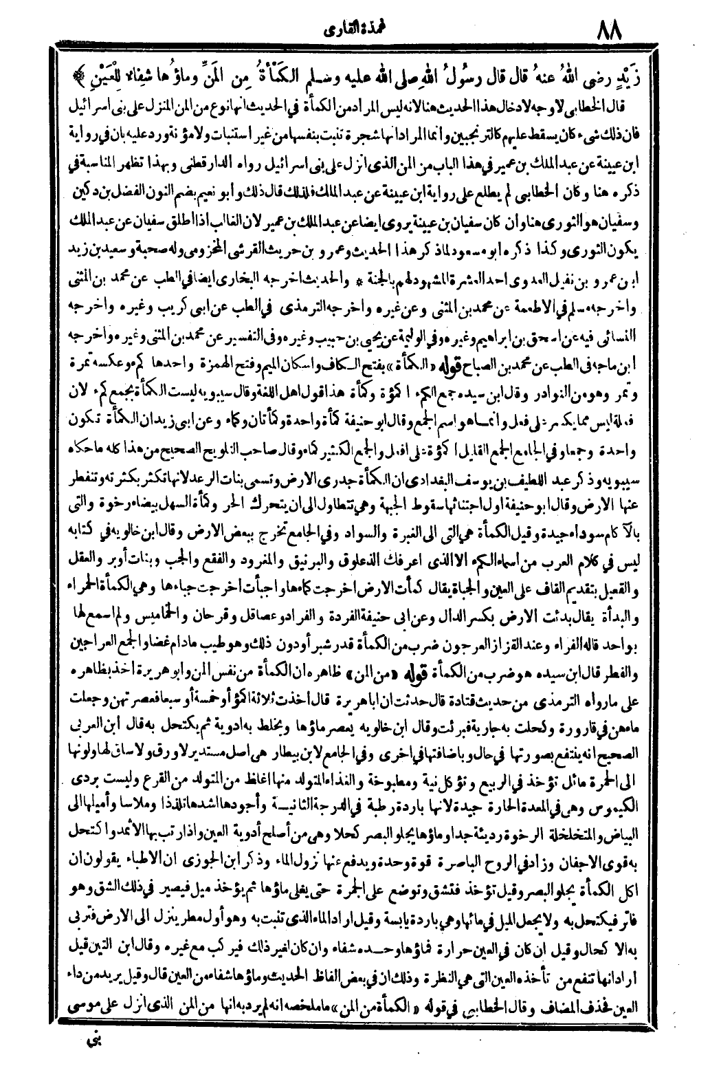 قَوْله: (الكمأة) ، بِفَتْح الْكَاف وَإِسْكَان الْمِيم وَفتح الْهمزَة: وَاحِدهَا كمء، وَعَكسه. تَمْرَة وتمر، وَهُوَ من النَّوَادِر، وَقَالَ ابْن سَيّده: جمع الكمء أكمؤه وكمأة، هَذَا قَول أهل اللُّغَة، وَقَالَ سِيبَوَيْهٍ: لَيست الكمأة بِجمع، كمء، لِأَن فعلة لَيْسَ مِمَّا يكسر على فعل، وَإِنَّمَا هُوَ إسم الْجمع، وَقَالَ أَبُو حنيفَة: كمأة وَاحِدَة وكمأتان وكماء. وَعَن أبي زيد: أَن الكمأة تكون وَاحِدَة وجمعاً. وَفِي (الْجَامِع) : الْجمع الْقَلِيل أكمؤة على أفعل، وَالْجمع الْكثير: كَمَاء، وَقَالَ صَاحب (التَّلْوِيح) : الصَّحِيح من هَذَا كُله مَا حَكَاهُ سِيبَوَيْهٍ، وَذكر عبد اللَّطِيف بن يُوسُف الْبَغْدَادِيّ أَن الكمأة جدرى الأَرْض وَتسَمى بَنَات الرَّعْد، لِأَنَّهَا تكْثر بكثرته وتنفطر عَنْهَا الأَرْض، وَقَالَ أَبُو حنيفَة: أول اجتناثها سُقُوط الْجَبْهَة، وَهِي تتطاول إِلَى أَن يَتَحَرَّك الْحر، وكمأة السهل بَيْضَاء رخوة، وَالَّتِي بالآكام سَوْدَاء جَيِّدَة، وَقيل: الكمأة هِيَ الَّتِي إِلَى الغبرة والسواد. وَفِي (الْجَامِع) : تخرج بِبَعْض الأَرْض، وَقَالَ ابْن خالويه فِي كِتَابه: لَيْسَ فِي كَلَام الْعَرَب من أَسمَاء الكمء إلاَّ الَّذِي أعرفك: الذعلوق والبرنيق والمغرود والفقع والجب وَبَنَات أوبر وَالْعقل والقعيل، بِتَقْدِيم الْقَاف على الْعين، والجباة. يُقَال: كمأت الأَرْض أخرجت كماءها، وأجبأت أخرجت جباءها وَهِي الكمأة الْحَمْرَاء، والبدأة يُقَال بدئت الأَرْض بِكَسْر الدَّال، وَعَن أبي حنيفَة: الفردة والفراد وعصاقل وقرحان والخماميس، وَلم أسمع لَهَا بِوَاحِد، قَالَه الْفراء: وَعند الْقَزاز: العرجون ضرب من الكمأة قدر شبر أَو دون ذَلِك وَهُوَ طيب مَا دَامَ غضاً، وَالْجمع العراجين، وَالْفطر قَالَ ابْن سيدة: هُوَ ضرب من الكمأة. قَوْله: (من الْمَنّ) ، ظَاهره أَن الكمأة من نفس الْمَنّ، وَأَبُو هُرَيْرَة أَخذ بِظَاهِرِهِ على مَا رَوَاهُ التِّرْمِذِيّ من حَدِيث قَتَادَة، قَالَ: حدثت أَن أَبَا هُرَيْرَة قَالَ: أخذت ثَلَاثَة أكمؤ أَو خَمْسَة أَو سبعا فعصرتهن وَجعلت ماءهن فِي قَارُورَة وكحلت بِهِ جَارِيَة فبرئت، وَقَالَ ابْن خالويه: يعصر مَاؤُهَا ويخلط بِهِ أدوية ثمَّ يكتحل بِهِ، قَالَ ابْن الْعَرَبِيّ: الصَّحِيح أَنه ينْتَفع بصورتها فِي حَال وبإضافتها فِي أُخْرَى. وَفِي (الْجَامِع) لِابْنِ بيطار: هِيَ أصل مستدير لَا ورق وَلَا سَاق لَهَا ولونها إِلَى الْحمرَة مائل تُؤْخَذ فِي الرّبيع وتؤكل نِيَّة ومطبوخة، والغذاء الْمُتَوَلد مِنْهَا أغْلظ من الْمُتَوَلد من القرع وَلَيْسَت بردي، الكيموس، وَهِي فِي الْمعدة الحارة جَيِّدَة لِأَنَّهَا بَارِدَة رطبَة فِي الدرجَة الثَّانِيَة، وأجودها أَشدّهَا تلذذاً وملاساً، وأميلها إِلَى الْبيَاض، والمتخلخلة الرخوة رَدِيئَة جدا، وماؤها يجلو الْبَصَر كحلاً، وَهِي من أصلح أدوية الْعين، وَإِذا رتب بهَا الإثمد واكتحل بِهِ قوى الأجفان، وَزَاد فِي الرّوح الباصرة قُوَّة وحدة، وَيدْفَع عَنْهَا نزُول المَاء. وَذكر ابْن الْجَوْزِيّ: أَن الْأَطِبَّاء يَقُولُونَ: إِن أكل الكمأة يجلو الْبَصَر، وَقيل: تُؤْخَذ فتشق وتوضع على الْجَمْرَة حَتَّى يغلي مَاؤُهَا ثمَّ يُؤْخَذ ميل فَيصير فِي ذَلِك الشق وَهُوَ فاتر فيكتحل بِهِ، وَلَا يَجْعَل الْميل فِي مَائِهَا وَهِي بَارِدَة يابسة، وَقيل: أَرَادَ المَاء الَّذِي تنْبت بِهِ وَهُوَ أول مطر ينزل إِلَى الأَرْض فتربى بِهِ الأكحال، وَقيل: إِن كَانَ فِي الْعين حرارة فماؤها وَحده شِفَاء، وَإِن كَانَ لغير ذَلِك فيركب مَعَ غَيره. وَقَالَ ابْن التِّين: قيل: أَرَادَ أَنَّهَا تَنْفَع من تَأْخُذهُ الْعين الَّتِي هِيَ النظرة، وَذَلِكَ أَن فِي بعض أَلْفَاظ الحَدِيث: وماؤها شِفَاء من الْعين، قَالَ: وَقيل: يُرِيد من دَاء الْعين، فَحذف الْمُضَاف، وَقَالَ الْخطابِيّ فِي قَوْله: (والك