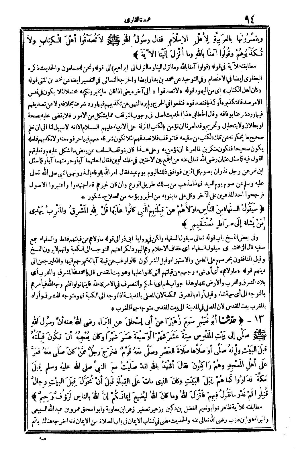 13 - (حَدثنَا أَبُو نعيم سمع زهيرا عَن أبي إِسْحَاق عَن الْبَراء رَضِي الله عَنهُ أَن رَسُول الله - صَلَّى اللَّهُ عَلَيْهِ وَسَلَّم َ - صلى إِلَى بَيت الْمُقَدّس سِتَّة عشر شهرا أَو سَبْعَة عشر شهرا وَكَانَ يُعجبهُ أَن تكون قبلته قبل الْبَيْت وَأَنه صلى أَو صلاهَا صَلَاة الْعَصْر وَصلى مَعَه قوم فَخرج رجل مِمَّن كَانَ صلى مَعَه فَمر على أهل الْمَسْجِد وهم رَاكِعُونَ فَقَالَ أشهد بِاللَّه لقد صليت مَعَ النَّبِي - صَلَّى اللَّهُ عَلَيْهِ وَسَلَّم َ - قبل مَكَّة فَدَارُوا كَمَا هم قبل الْبَيْت وَكَانَ الَّذِي مَاتَ على الْقبْلَة قبل أَن تحول قبل الْبَيْت رجال قتلوا لم ندر مَا نقُول فيهم فَأنْزل الله {وَمَا كَانَ الله لِيُضيع إيمَانكُمْ إِن الله بِالنَّاسِ لرؤف رَحِيم} مطابقته لِلْآيَةِ ظَاهِرَة وَأَبُو نعيم الْفضل بن دُكَيْن وَزُهَيْر تَصْغِير زهر ابْن مُعَاوِيَة وَأَبُو إِسْحَق عَمْرو بن عبد الله السبيعِي والبراء هُوَ ابْن عَازِب رَضِي الله تَعَالَى عَنهُ والْحَدِيث مضى فِي كتاب الْإِيمَان فِي بَاب الصَّلَاة من الْإِيمَان فَإِنَّهُ أخرجه هُنَاكَ بأتم