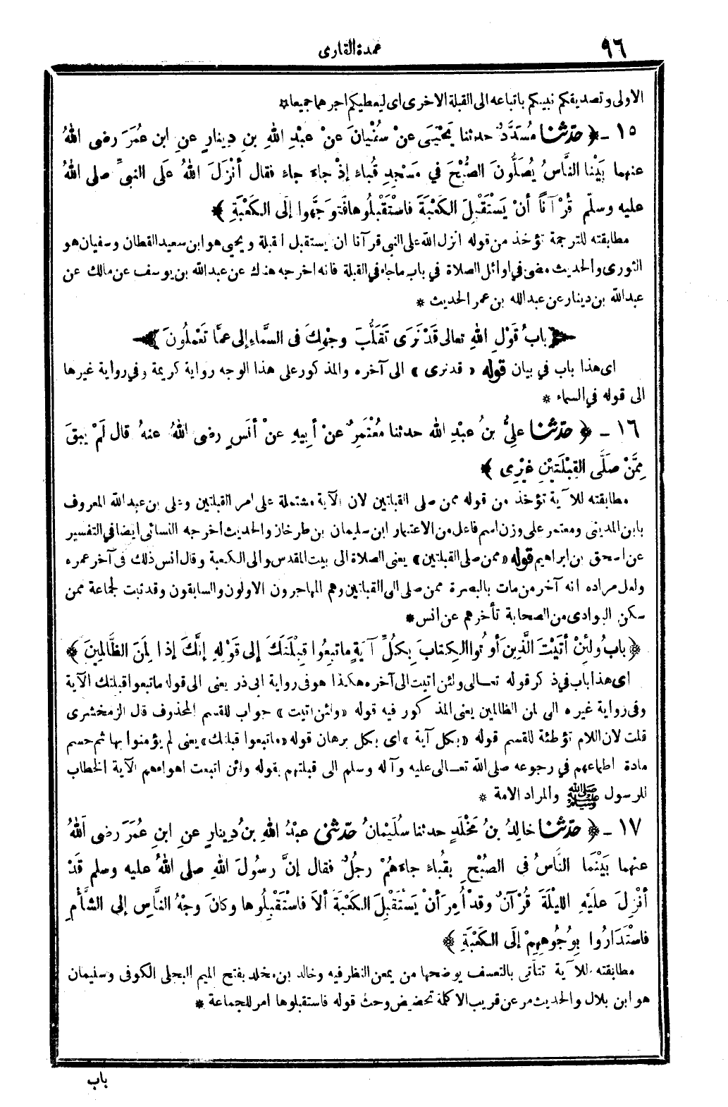 4488 - ح دَّثنا مُسَدَّدٌ حَدثنَا يَحْيَى عنْ سُفْيانَ عنْ عبْدِ الله بنِ دِينارٍ عنِ ابْن عُمَرَ رَضِي الله عَنْهُمَا بَيْنا النَّاسُ يُصَلُّونَ الصُّبْحَ فِي مَسْجِدِ قُباءٍ إذْ جاءَ فَقَالَ أنْزَلَ الله عَلَى النبيِّ صلى الله عَلَيْهِ وَسلم قُرْآناً أنْ يَسْتَقْبِلَ الكَعْبَةَ فاسْتَقْبَلُوها فَتوجَّهُوا إلَى الكَعْبَةِ. .