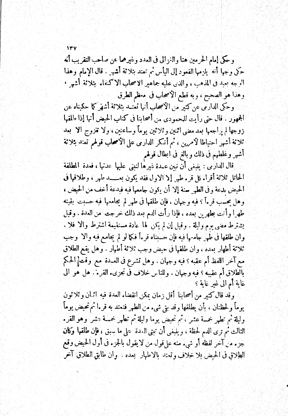 قَالَ حَتَّى رَأَيْتُ لِلْمَحْمُودِيِّ مِنْ أَصْحَابِنَا فِي كِتَابِ الْحَيْضِ أَنَّهَا إذَا طَلَّقَهَا زَوْجُهَا لَمْ يُرَاجِعْهَا بَعْدَ مُضِيِّ اثْنَيْنِ وَثَلَاثِينَ يَوْمًا وَسَاعَتَيْنِ، وَلَا تَتَزَوَّجُ إلَّا بَعْدَ ثَلَاثَةِ أَشْهُرٍ احْتِيَاطًا لِأَمْرَيْنِ، ثُمَّ أَنْكَرَ الدَّارِمِيُّ عَلَى الْأَصْحَابِ قَوْلَهُمْ تَعْتَدُّ بِثَلَاثَةِ أَشْهُرٍ وَغَلَّطَهُمْ فِي ذلك وبالغ في ابطال قولهم