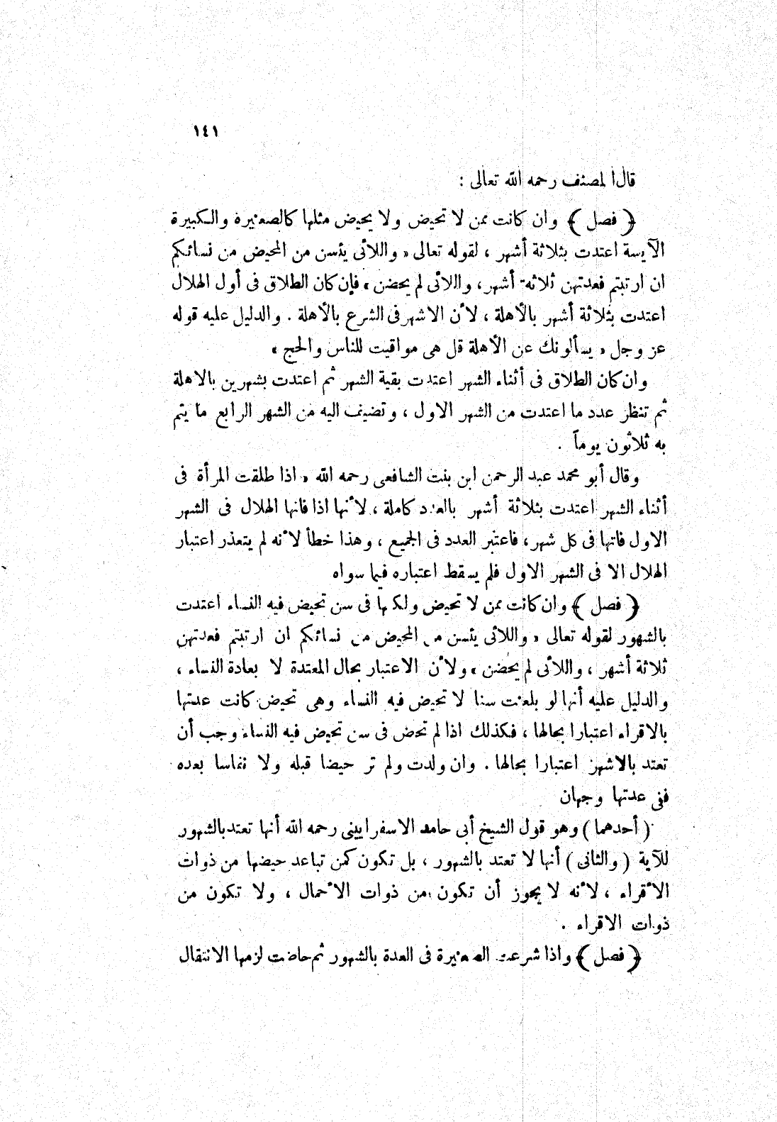 وان كانت ممن لا تحيض ولكنها في سن تحيض فيه النساء اعتدت بالشهور لقوله تعالى " واللائى يئسن من المحيض من نسائكم ان ارتبتم فعدتهن ثلاثة أشهر، واللائى لم يحضن " ولان الاعتبار بحال المعتدة لابعادة النساء، والدليل عليه أنها لو بلغت سنا لا تحيض فيه النساء وهى تحيض كانت عدتها بالاقراء اعتبارا بحالها، فذلك إذا لم تحض في سن تحيض فيه النساء وجب أن تتعد بالاشهر اعتبارا بحالها.