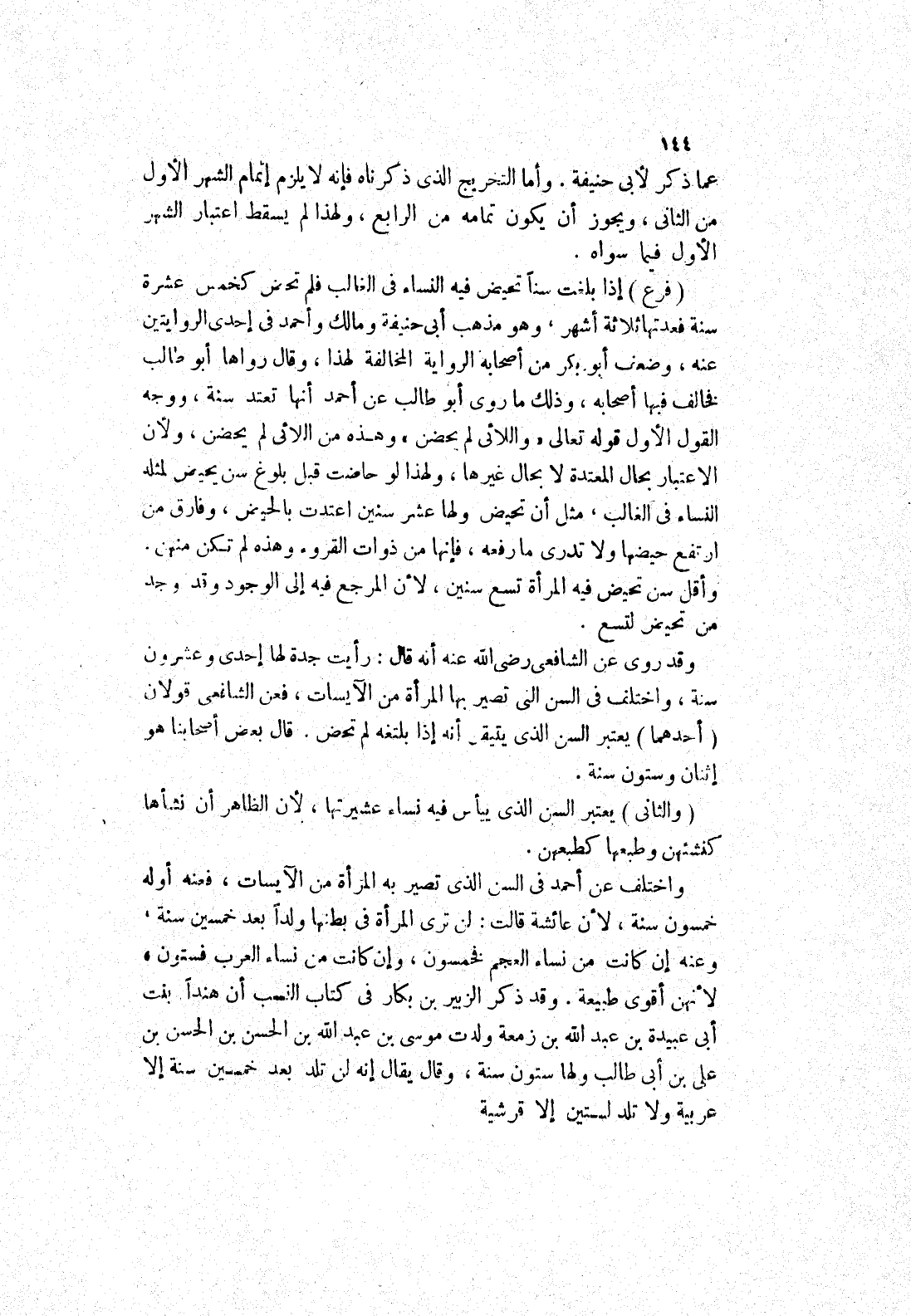 وعنه إن كانت من نساء العجم فخمسون، وإن كانت من نساء العرب فستون " لانهن أقوى طبيعة، وقد ذكر الزبير بن بكار في كتاب النسب أن هندا بنت أبى عبيدة بن عبد الله بن زمعة ولدت موسى بن عبد الله بن الحسن بن الحسن بن علي بن أبي طالب ولها ستون سنة، وقال يقال إنه لن تلد بعد خمسين سنة إلا عربية ولا تلد لستين إلا قرشية