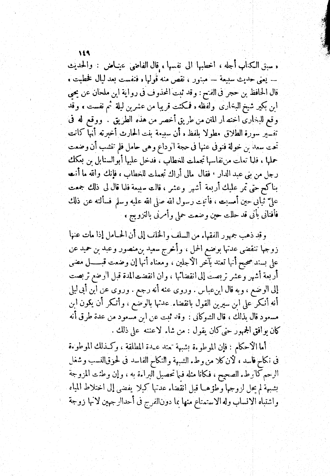ووقع له في تفسير سورة الطلاق مطولا بلفظ " أن سبيعة بنت الحارث أخبرته أنها كانت تحت سعد بن خولة فتوفى عنها في حجة الوداع وهى حامل فلم تنشب أن وضعت حملها، فلما تعلت من نفاسها تجملت للخطاب، فدخل عليه أبو السنابل بن بعكك رجل من بنى عبد الدار، فقال مالي أراك تجملت للخطاب، فإنك والله وما أنت بناكح حتى تمر عليك أربعة أشهر وعشر، قالت سبيعة فلما قال لي ذلك جمعت علي ثيابي حين أمسيت، فَأَتَيْتُ رَسُولَ اللَّهِ صَلَّى اللَّهُ عَلَيْهِ وَسَلَّمَ فسألته عن ذلك فأفتانى بأنى قد حللت حين وضعت حملي وأمرني بالتزويج " وقد ذهب جمهور الفقهاء من السلف والخلف إلى أن الحامل إذا مات عنها زوجها تنقضي عدتها بوضع الحمل، وأخرج سعيد بن منصور وعبد بن حميد عن على بسند صحيح أنها تعتد بآخر الاجلين، ومعناه أنها إن وضعت قبل مضى أربعة أشهر وعشر تربصت إلى انقضائها، وان انقضت المدة قبل الوضع تربصت إلى الوضع، وبه قال ابن عباس.