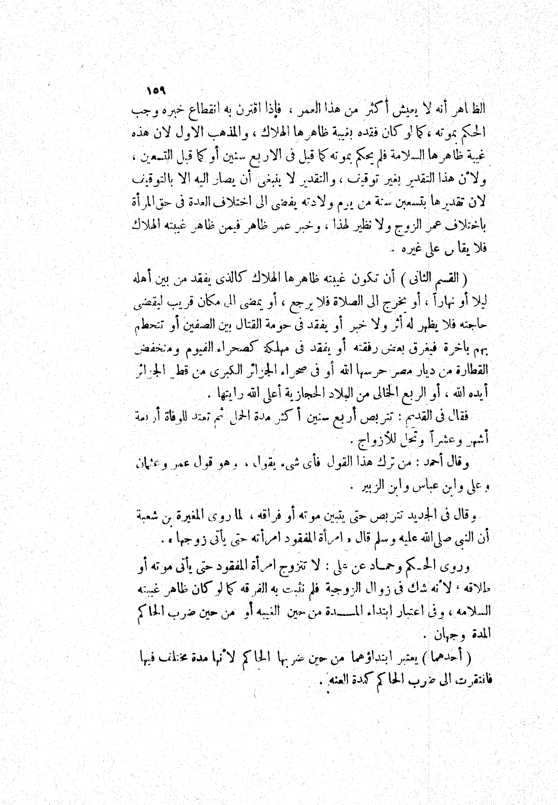 (القسم الثاني) أن تكون غيبته ظاهرها الهلاك كالذي يفقد من بين أهله ليلا أو نهارا، أو يخرج إلى الصلاة فلا يرجع، أو يمضى إلى مكان قريب ليقضى حاجته فلا يظهر له أثر ولاخبر أو يفقد في حومة القتال بين الصفين أو تتحطم بهم باخرة فيغرق بعض رفقته أو يفقد في مهلكة كصحراء الفيوم ومنخفض القطارة من ديار مصر حرسها الله أو في صحراء الجزائر الكبرى من قطر الجزائر أيده الله، أو الربع الخالى من البلاد الحجازية أعلى الله رايتها.
