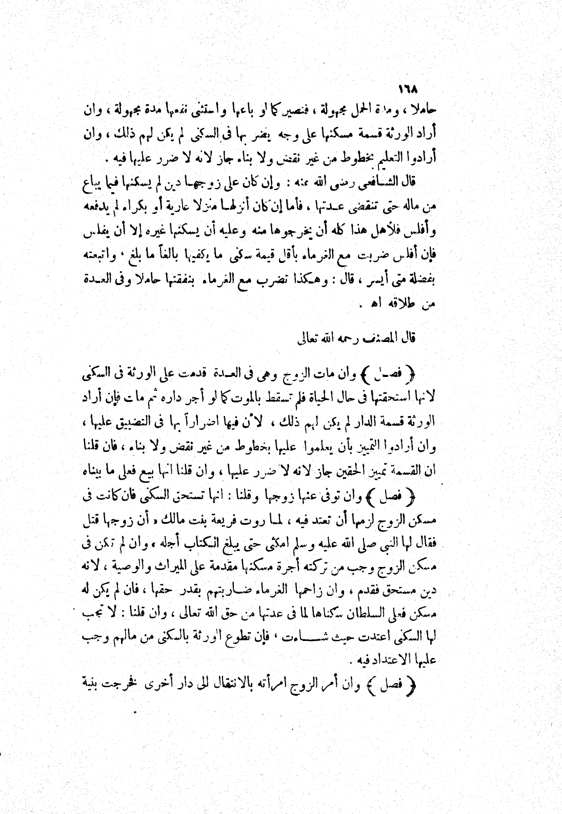 قال الشافعي رضى الله عنه: وإن كان على زوجها دين لم يسكنها فيما يباع من ماله حتى تنقضي عدتها، فأما إن كان أنزلها منزلا عارية أو بكراء لم يدفعه وأفلس فلاهل هذا كله أن يخرجوها منه وعليه أن يسكنها غيره إلا أن يفلس فإن أفلس ضربت مع الغرماء بأقل قيمة سكنى ما يكفيها بالغا ما بلغ، واتبعته بفضلة متى أيسر، قال: وهكذا تضرب مع الغرماء بنفقتها حاملا وفي العدة من طلاقه اه.