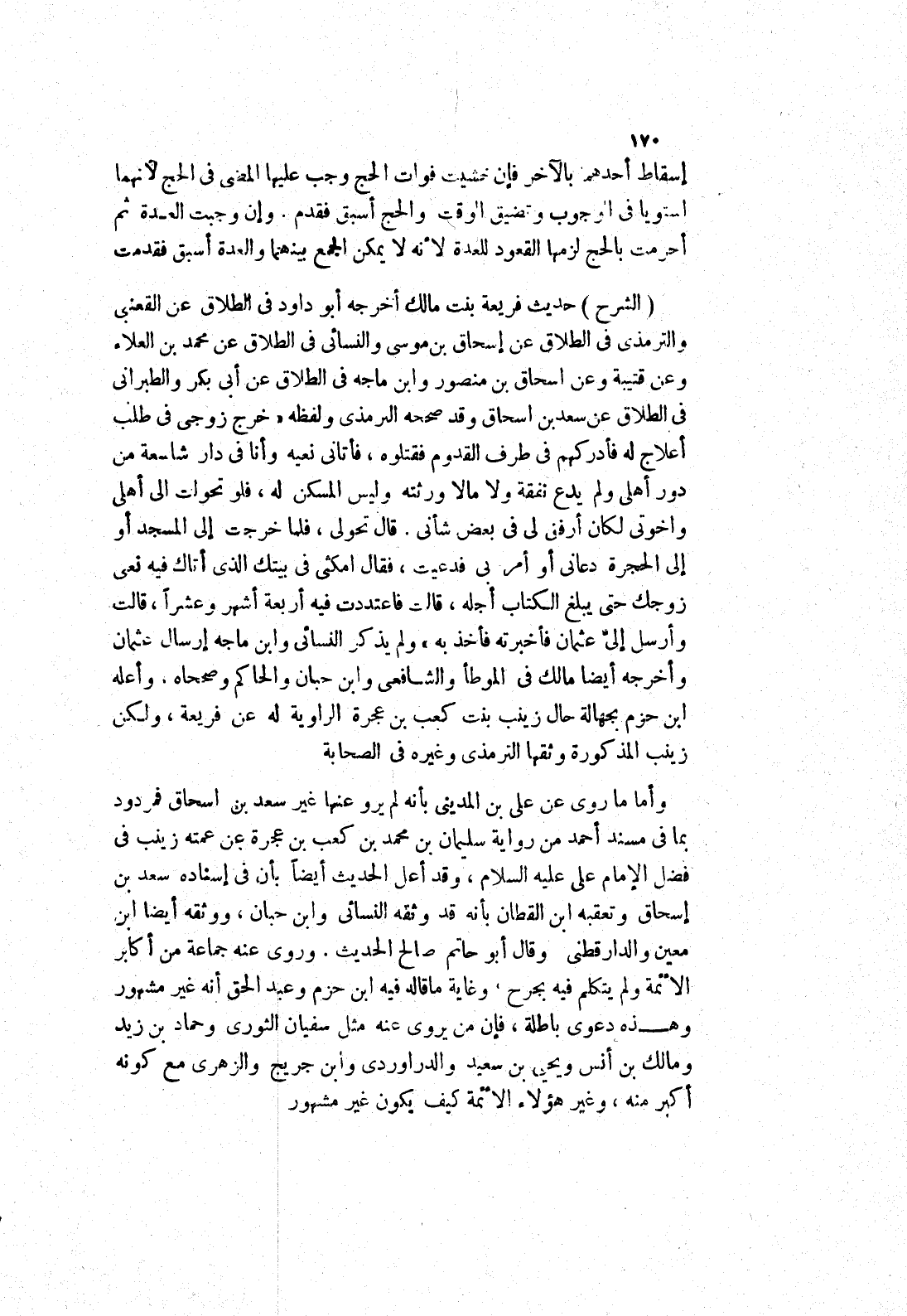 قال تحولي، فلما خرجت إلى المسجد أو إلى الحجرة دعاني أو أمر به فدعيت، فقال امكثى في بيتك الذي أتاك فيه نعى زوجك حتى يبلغ الكتاب أجله، قالت فاعتددت فيه أربعة أشهر وعشرا، قالت وأرسل إلى عثمان فأخبرته فأخذ به " ولم يذكر النسائي وابن ماجه إرسال عثمان وأخرجه أيضا مالك في الموطأ والشافعي وابن حبان والحاكم وصححاه، وأعله ابن حزم بجهالة حال زينب بنت كعب بن عجزة الرواية له عن فريعة، ولكن زينب المذكورة وثقها الترمذي وغيره في الصحابة وأما ماروى عن علي بن المدينى بأنه لم يرو عنها غير سعد بن اسحاق فمردود بما في مسند أحمد من رواية سليمان بن محمد بن كعب بن عجرة عن عمته زينب في فضل الامام علي عليه السلام، وقد أعل الحديث أيضا بأن في إسناده سعد بن إسحاق وتعقبه ابن القطان بأنه قد وثقه النسائي وابن حبان، ووثقه أيضا ابن معين والدارقطني وقال أبو حاتم صالح الحديث.
