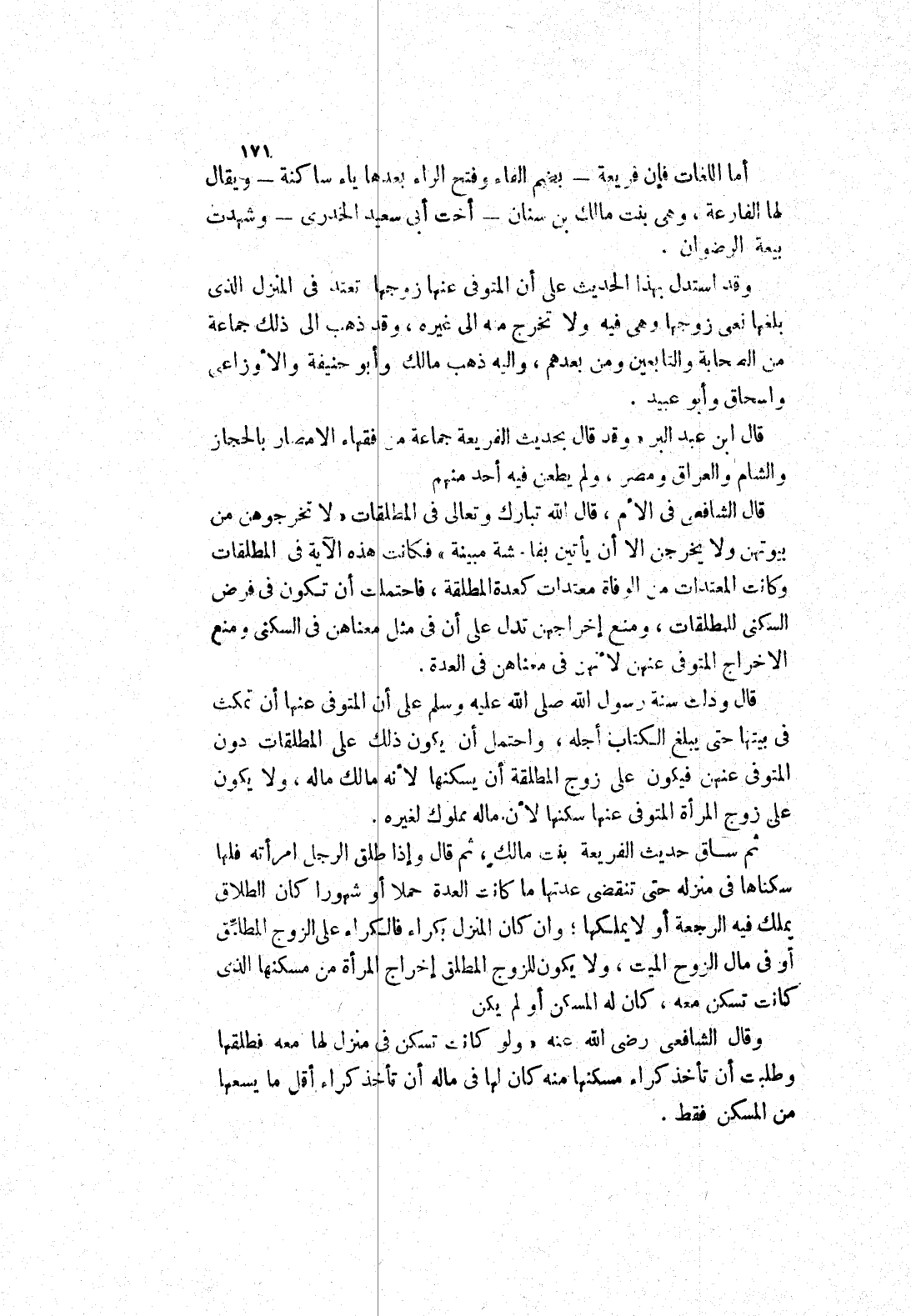 ثم ساق حديث الفريعة بنت مالك، ثم قال وإذا طلق الرجل امرأته فلها سكناها في منزله حتى تنقضي عدتها ما كانت العدة حملا أو شهورا كان الطلاق يملك فيه الرجعة أو لا يملكها: وان كان المنزل بكراء فالكراء على الزوج المطلق أو في مال الزوج الميت، ولايكون للزوج المطلق إخراج المرأة من مسكنها الذي كانت تسكن معه، كان له المسكن أو لم يكن